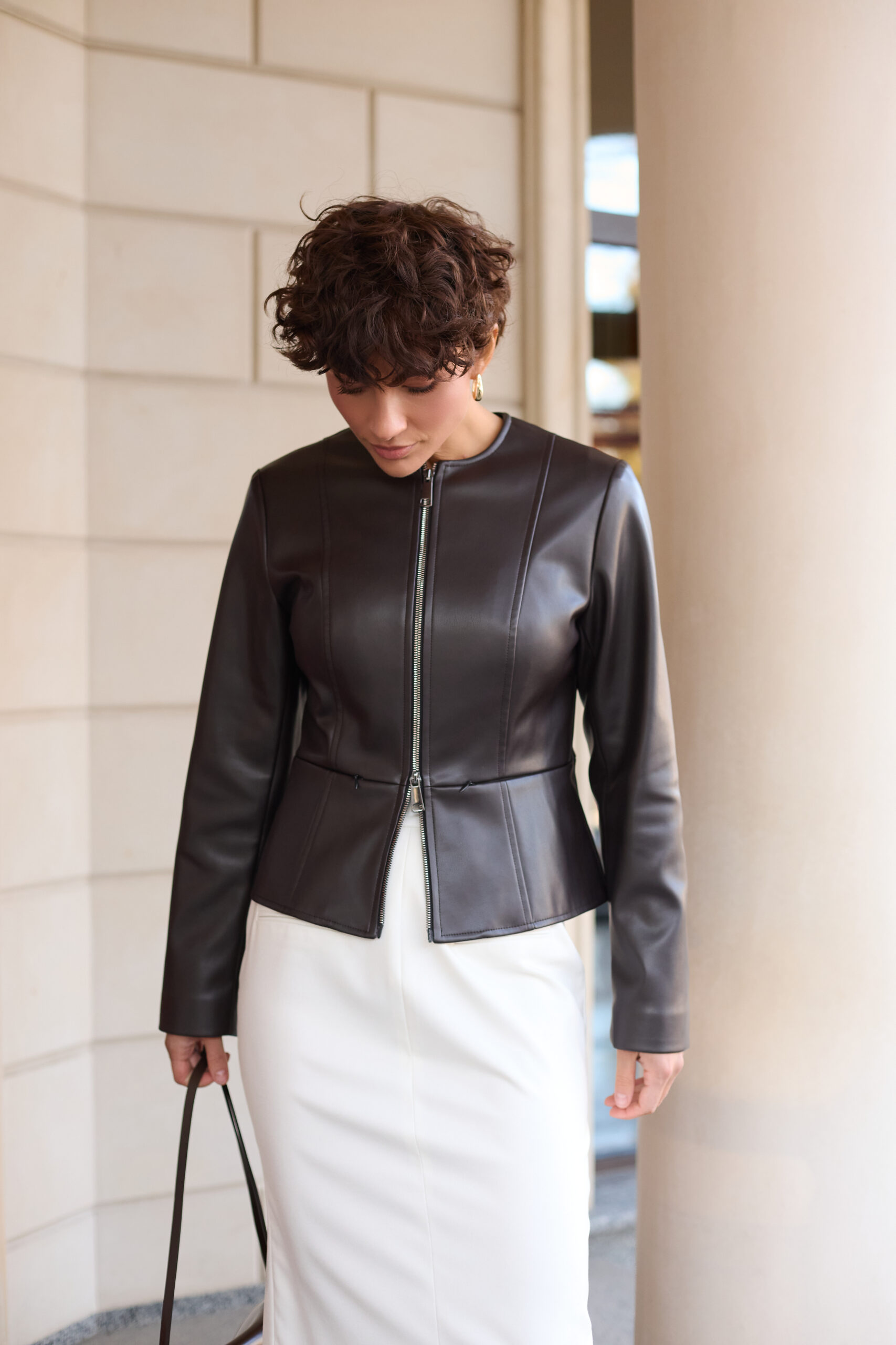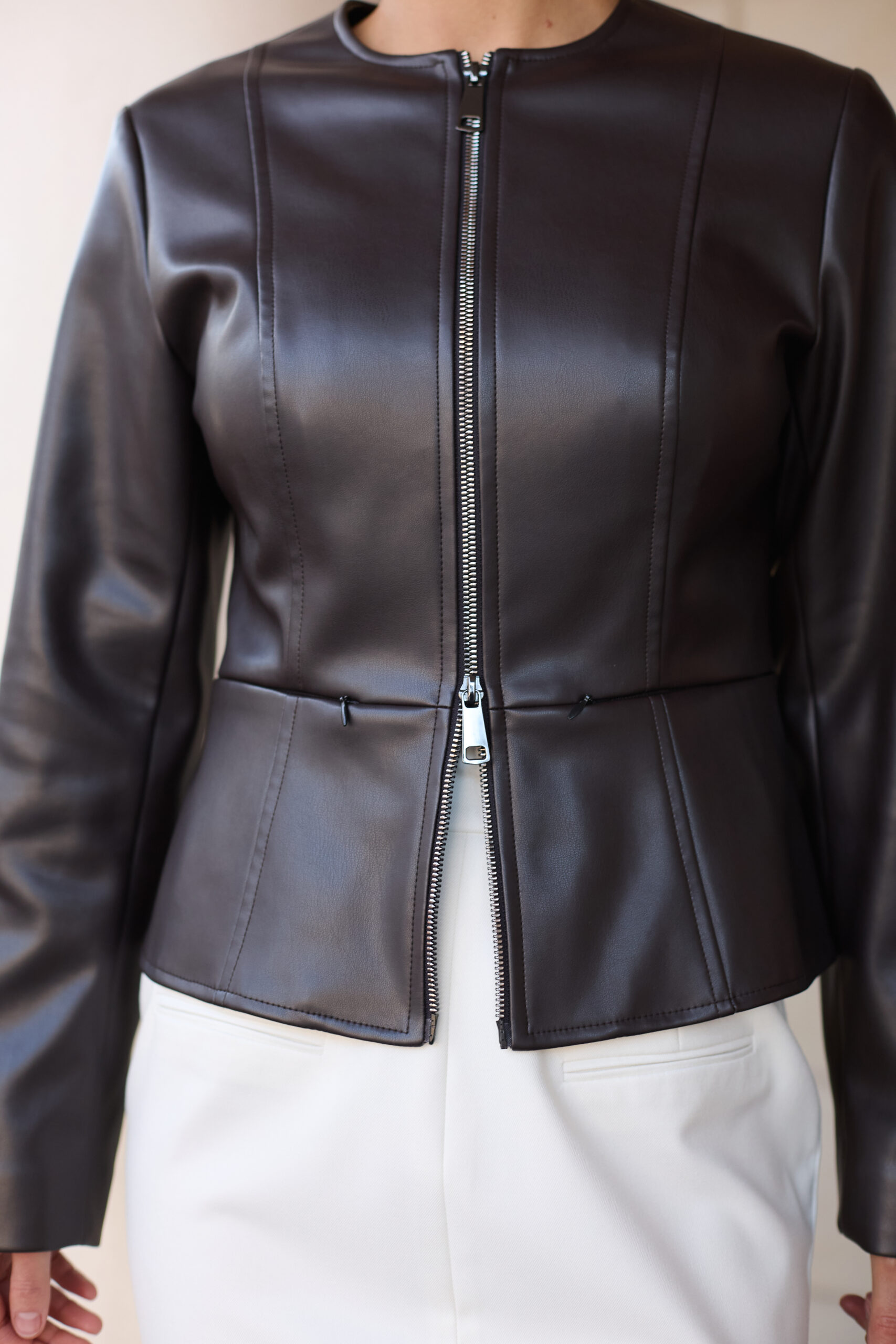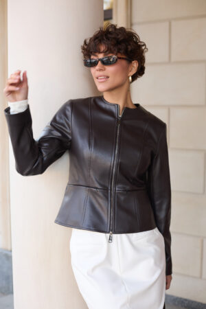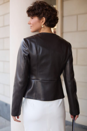Куртка-бомбер з еко-шкіри з акцентом на талії темний шоколад — елегантний силует і сучасний мінімалізм
