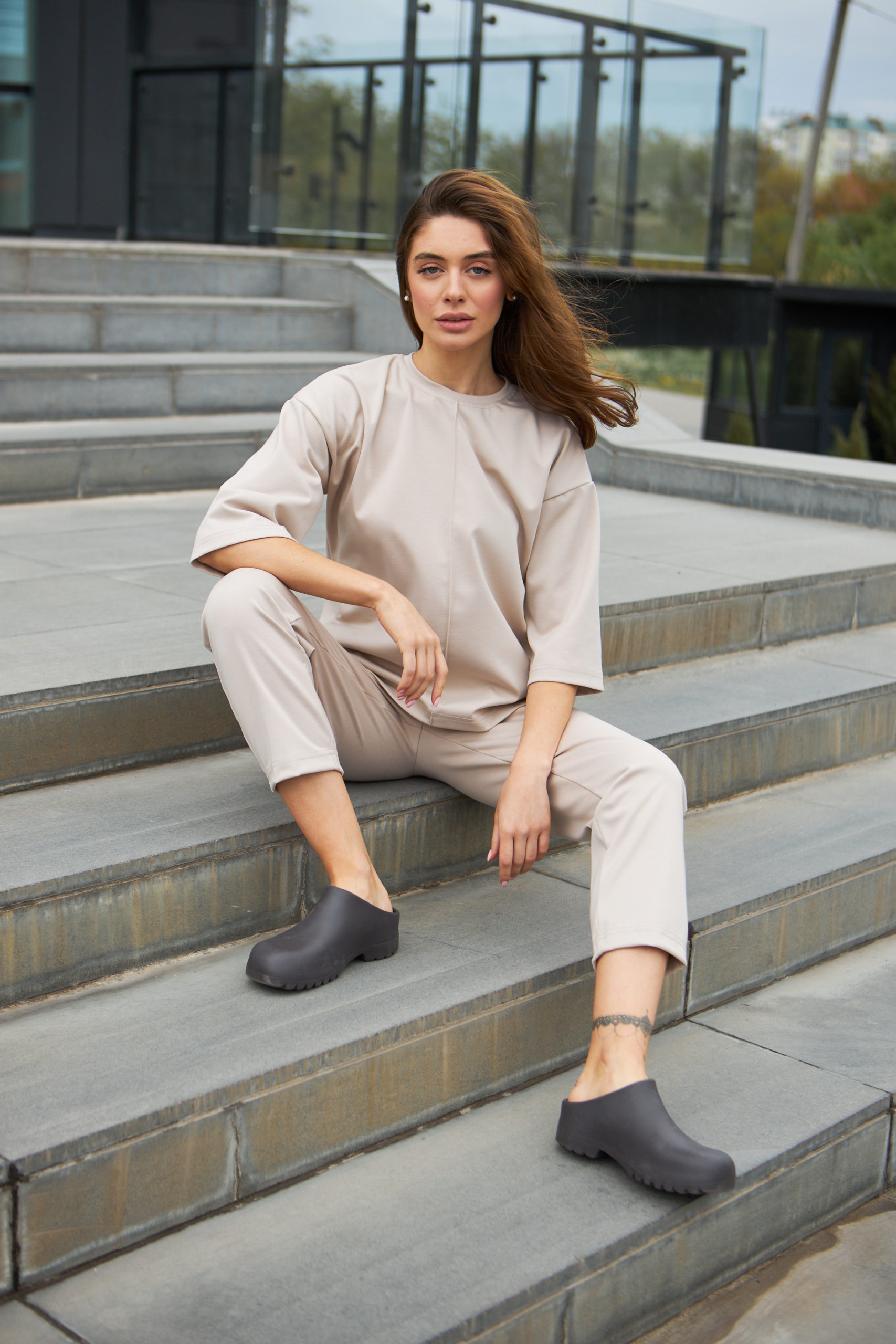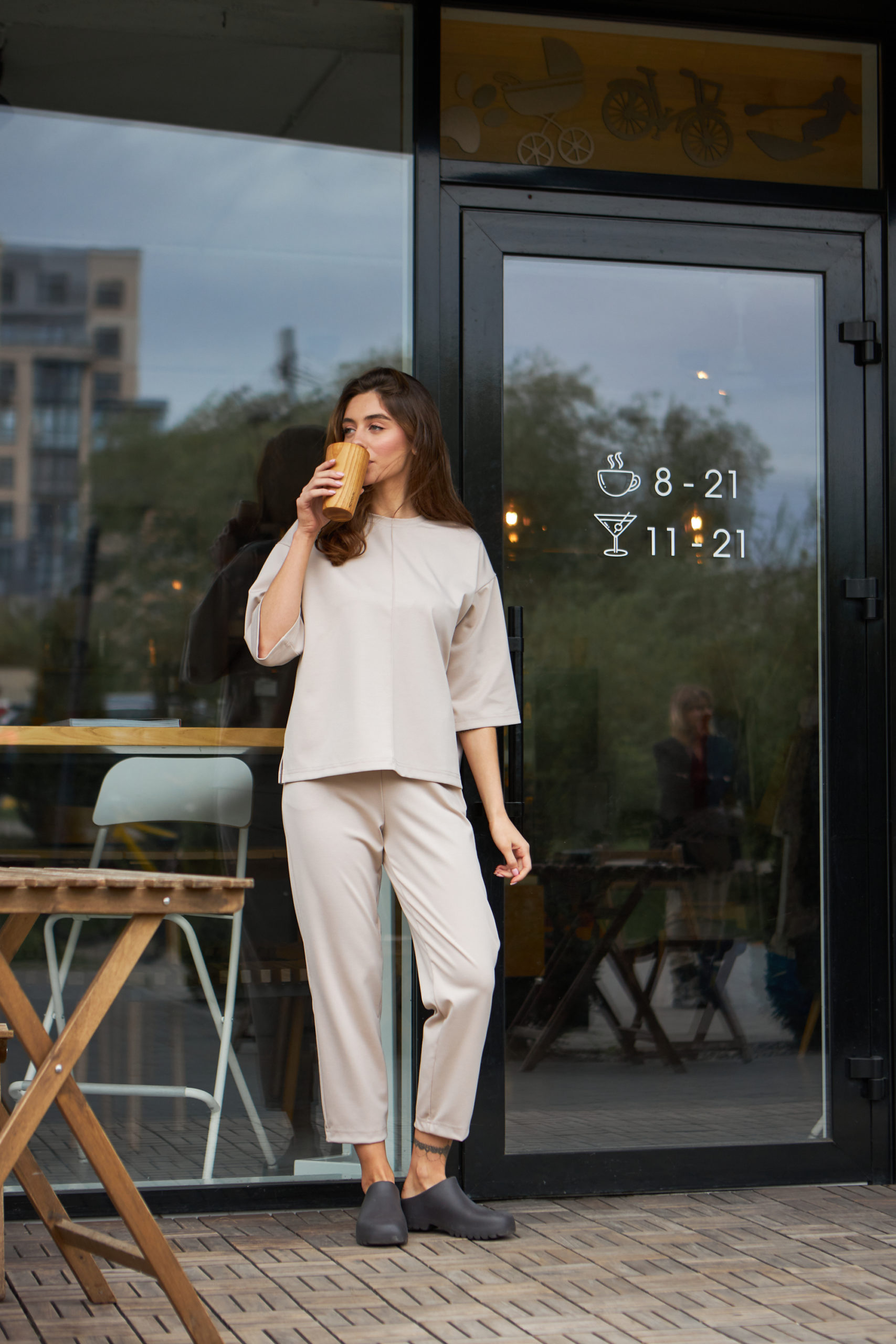 Вільна кофтинка зі спущеним плечем та вкорочені штани створюють сучасний образ, який підходить для різних випадків. Чотири кольори – молоко, карамель, айворі та капучино – дозволяють обрати найкращий варіант для вашого гардеробу. Розрізи збоку на кофтинці додають костюму легкості та забезпечують свободу рухів, а декоративний шов спереду додає вишуканості та стилю.