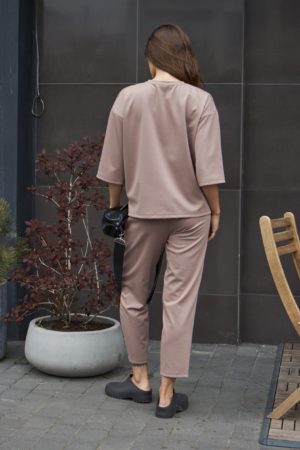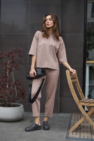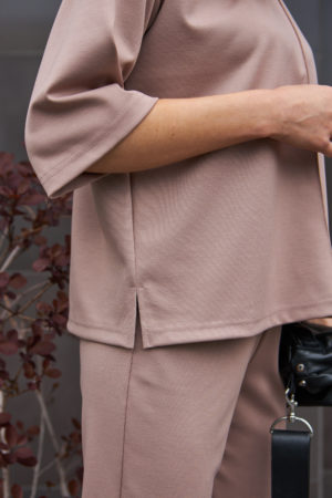 Вільна кофтинка зі спущеним плечем та вкорочені штани створюють сучасний образ, який підходить для різних випадків. Чотири кольори – молоко, карамель, айворі та капучино – дозволяють обрати найкращий варіант для вашого гардеробу. Розрізи збоку на кофтинці додають костюму легкості та забезпечують свободу рухів, а декоративний шов спереду додає вишуканості та стилю.