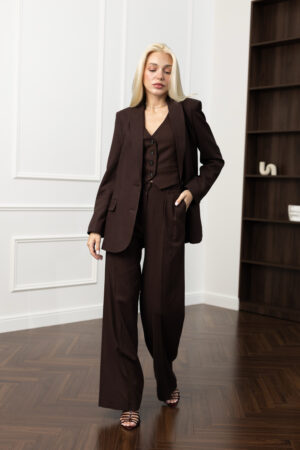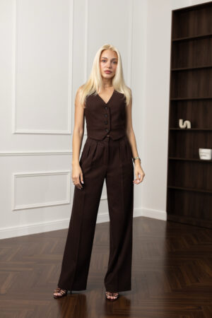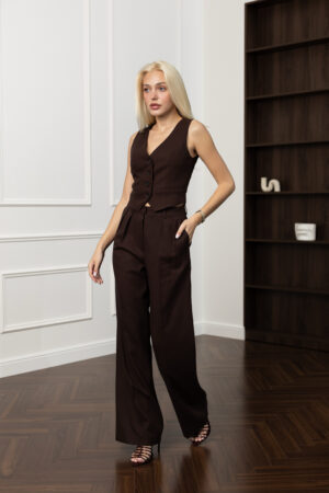 У світі швидкої моди лляні речі стають ковтком свіжого повітря — вони “дихають”, гармонійно вписуються в будь-який образ і мають особливу енергетику природності. Жилетка кольору шоколаду з льону та віскози — не виняток. Вона — вибір на користь текстури, комфорту і витонченого смаку.