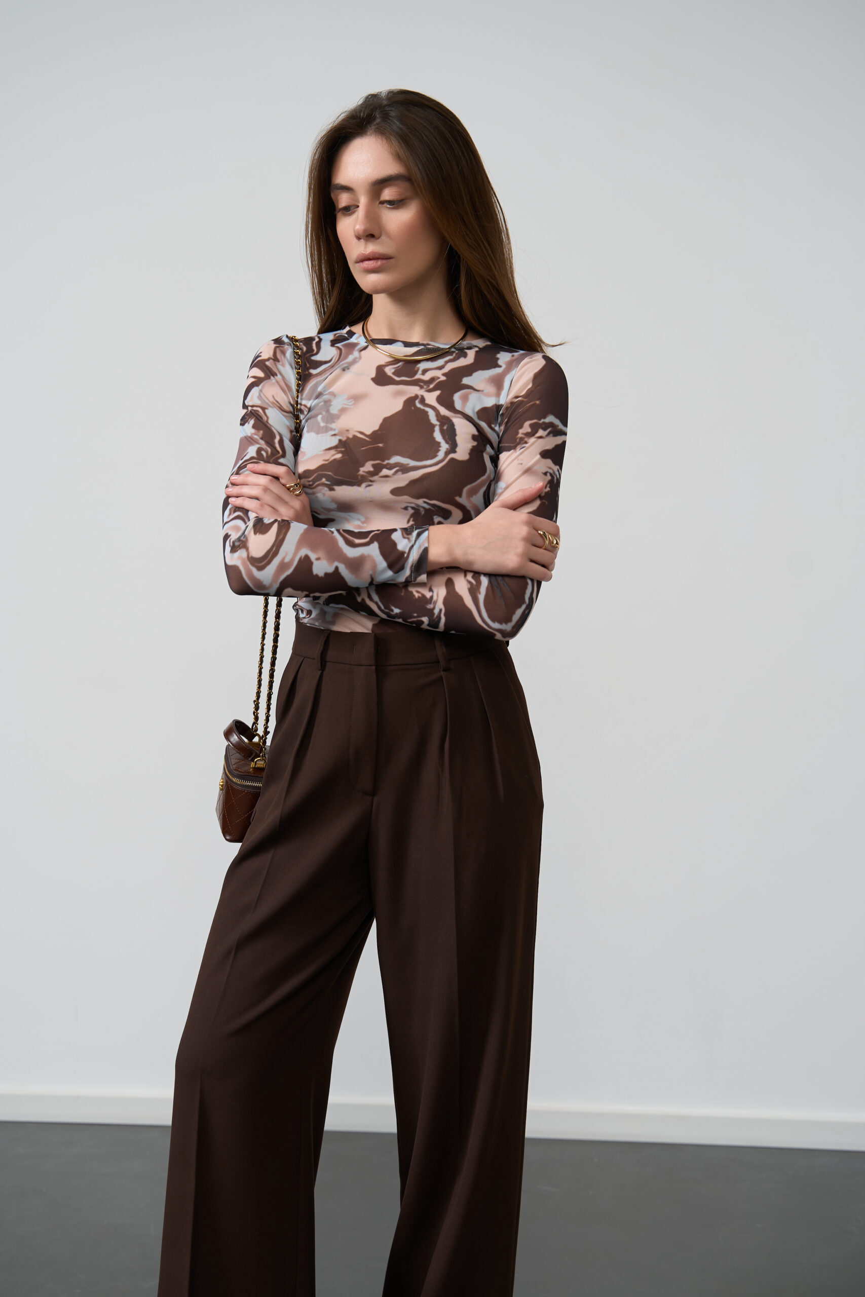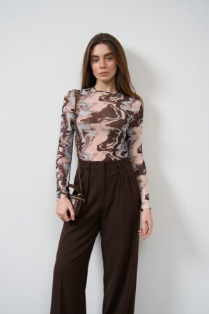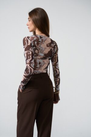 Цей лонг — ідеальне поєднання жіночності, елегантності та сучасного дизайну. Приталений крій гармонійно підкреслює силует, а напівпрозора текстура додає легкості та спокусливості образу. Глибокий шоколадно-винний відтінок надає моделі вишуканості та виразності, роблячи її стильним акцентом у гардеробі. Лонг чудово підходить як для стриманих класичних образів, так і для сміливих експериментів із модою.
