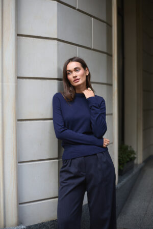 Лонгслів має класичний облягаючий силует, що підкреслює фігуру, не обмежуючи рухів. Кругла горловина й подовжені рукави створюють елегантний і стриманий образ. Цей фасон підходить для будь-якого типу фігури та легко комбінується з брюками, джинсами, спідницями або під жакети.