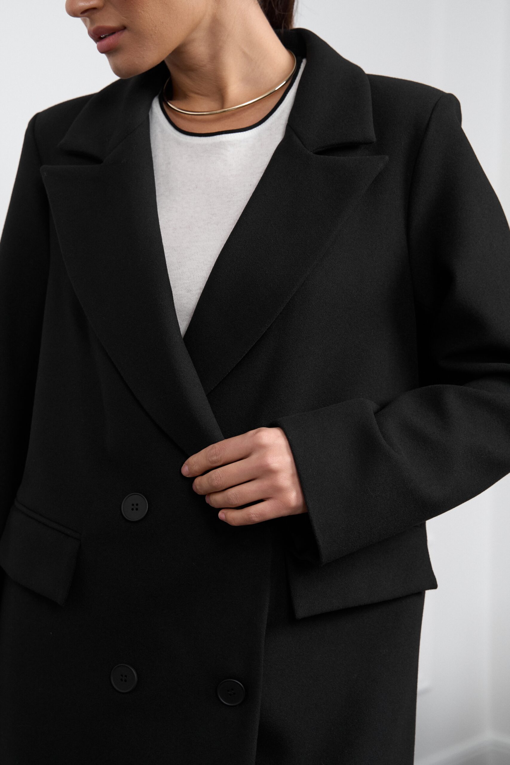Пальто має прямий, вільний крій, що дозволяє відчувати себе комфортно і стильно. Двобортний дизайн надає пальту строгий і класичний вигляд, в той час як розрізна шлиця ззаду додає легкості і практичності.