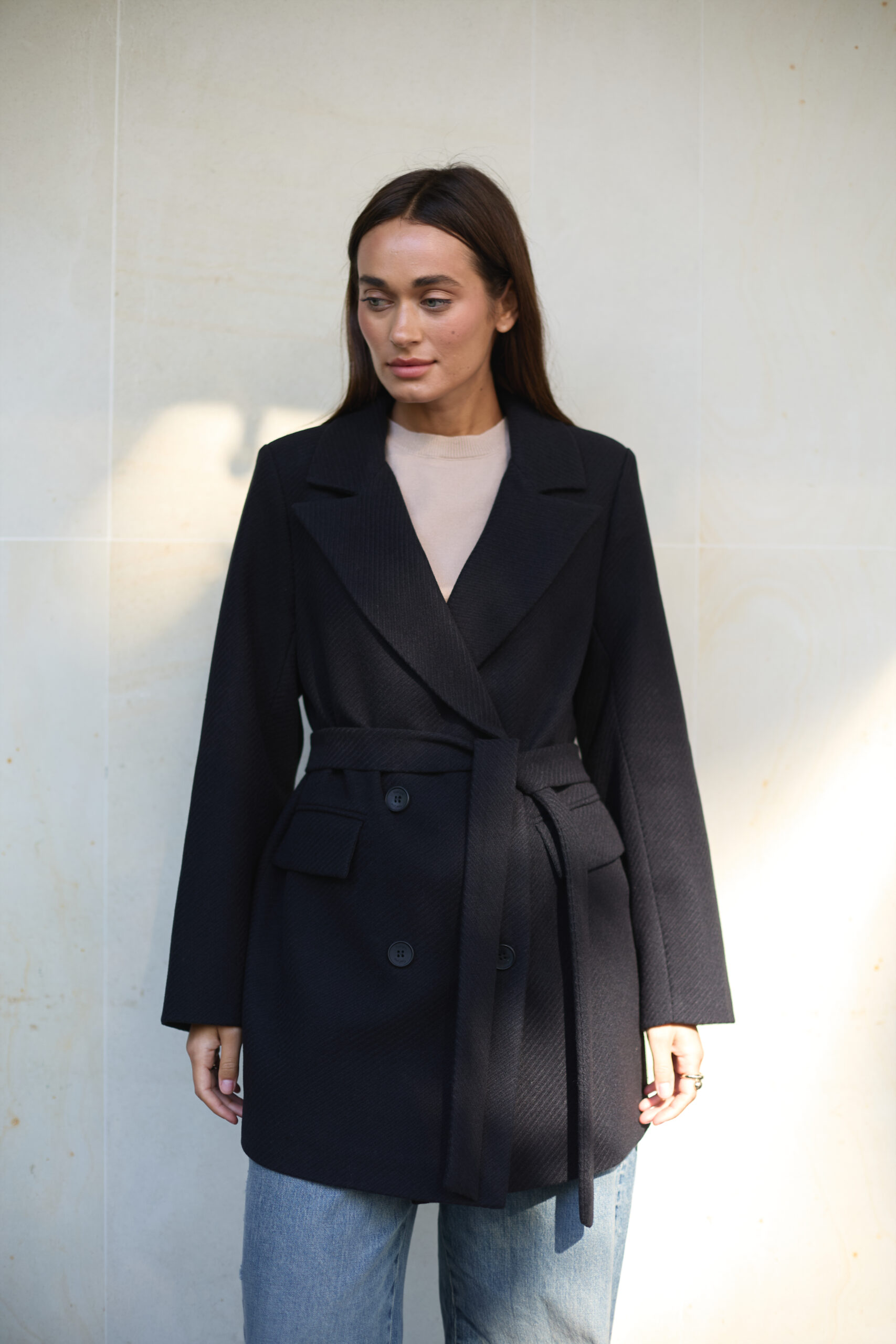 Чорний — універсальний та класичний колір, який завжди актуальний у моді. Він легко комбінується з будь-якими базовими кольорами гардеробу: білим, сірим, бежевим, темно-синім, а також чудово виглядає з яскравими акцентами — бордовим, смарагдовим або золотистим. Чорне пальто-піджак із вовни стане основою для створення стильних, елегантних і сучасних образів у будь-якому сезоні.