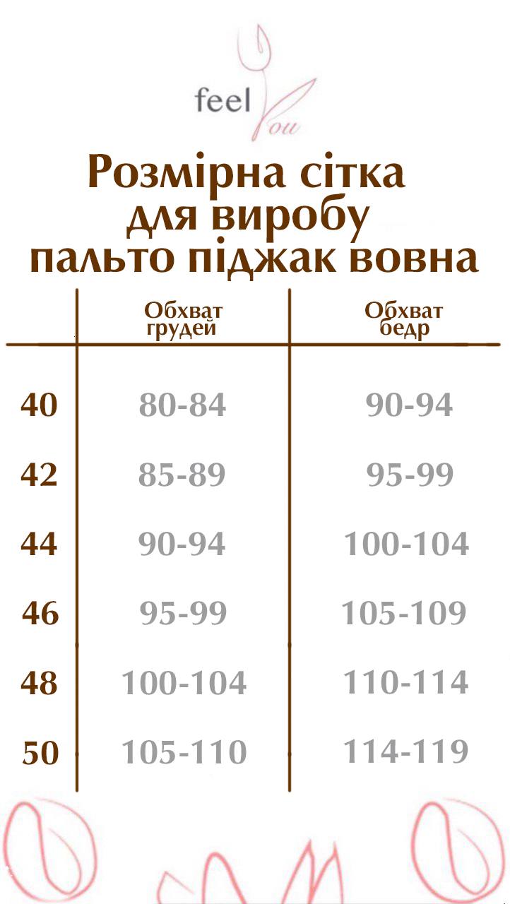Модель доступна у розмірах: 40, 42, 44, 46, 48, 50. Завдяки продуманому крою пальто ідеально сидить по фігурі та забезпечує комфорт у повсякденному носінні.