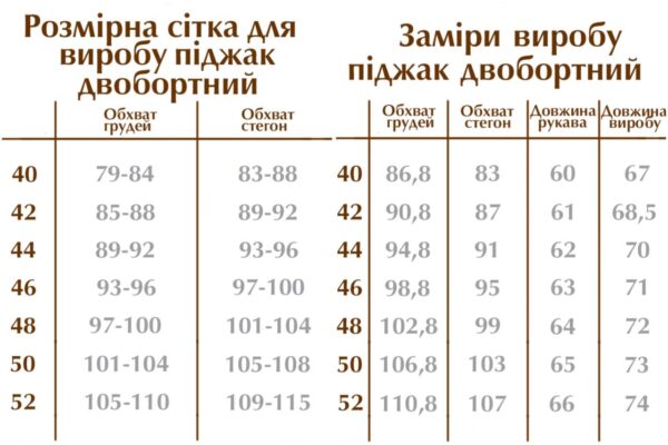 Піджак доступний у розмірах 40, 42, 44, 46, 48, 50, 52, що дає змогу підібрати модель з ідеальною посадкою для будь-якої фігури.