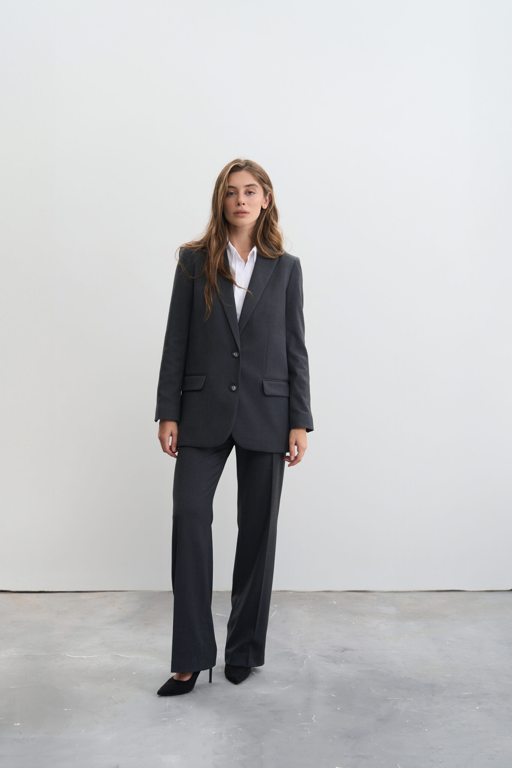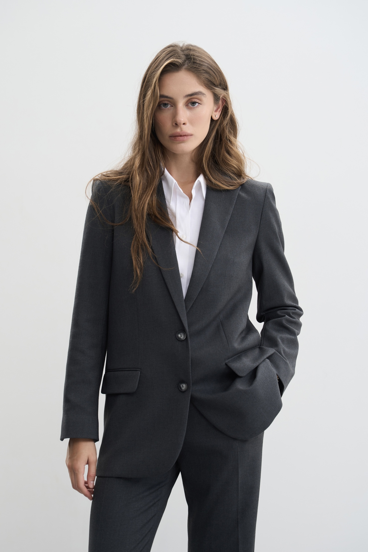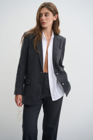 Піджак має класичний, однобортний дизайн з прямим кроєм, який забезпечує комфортну та стильну посадку.