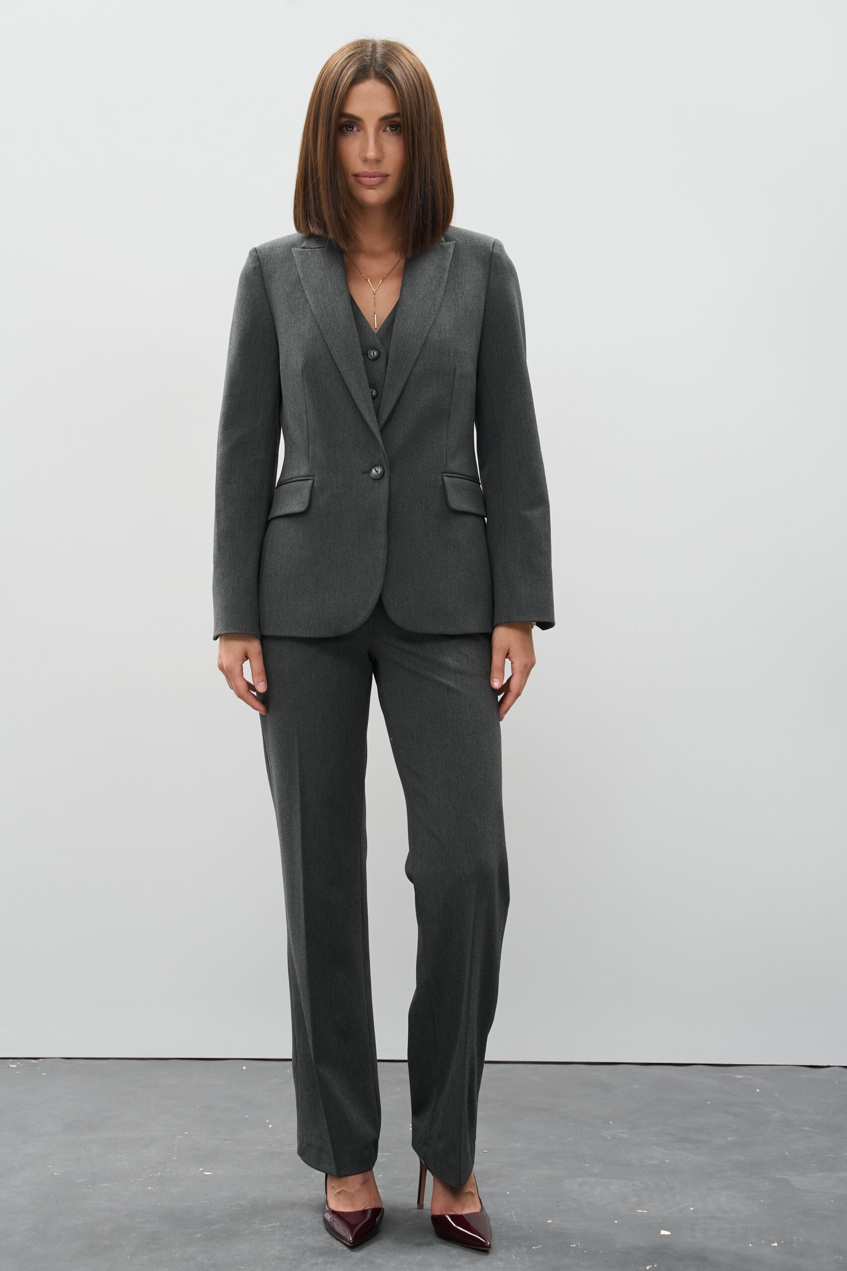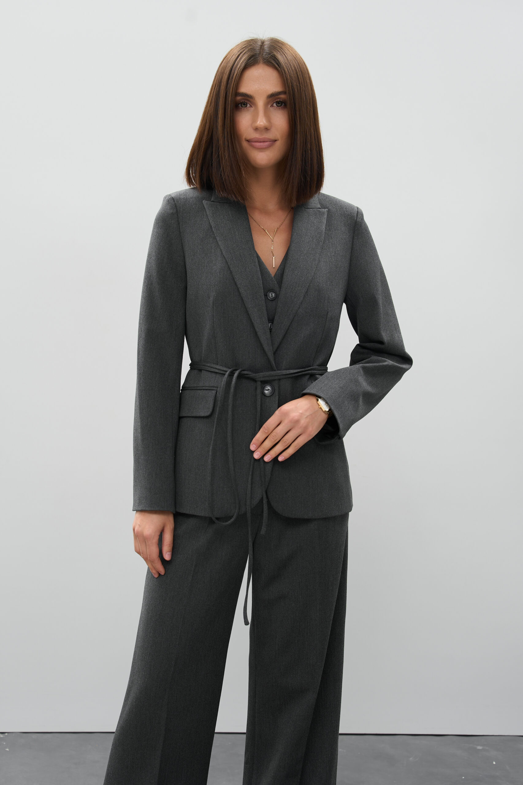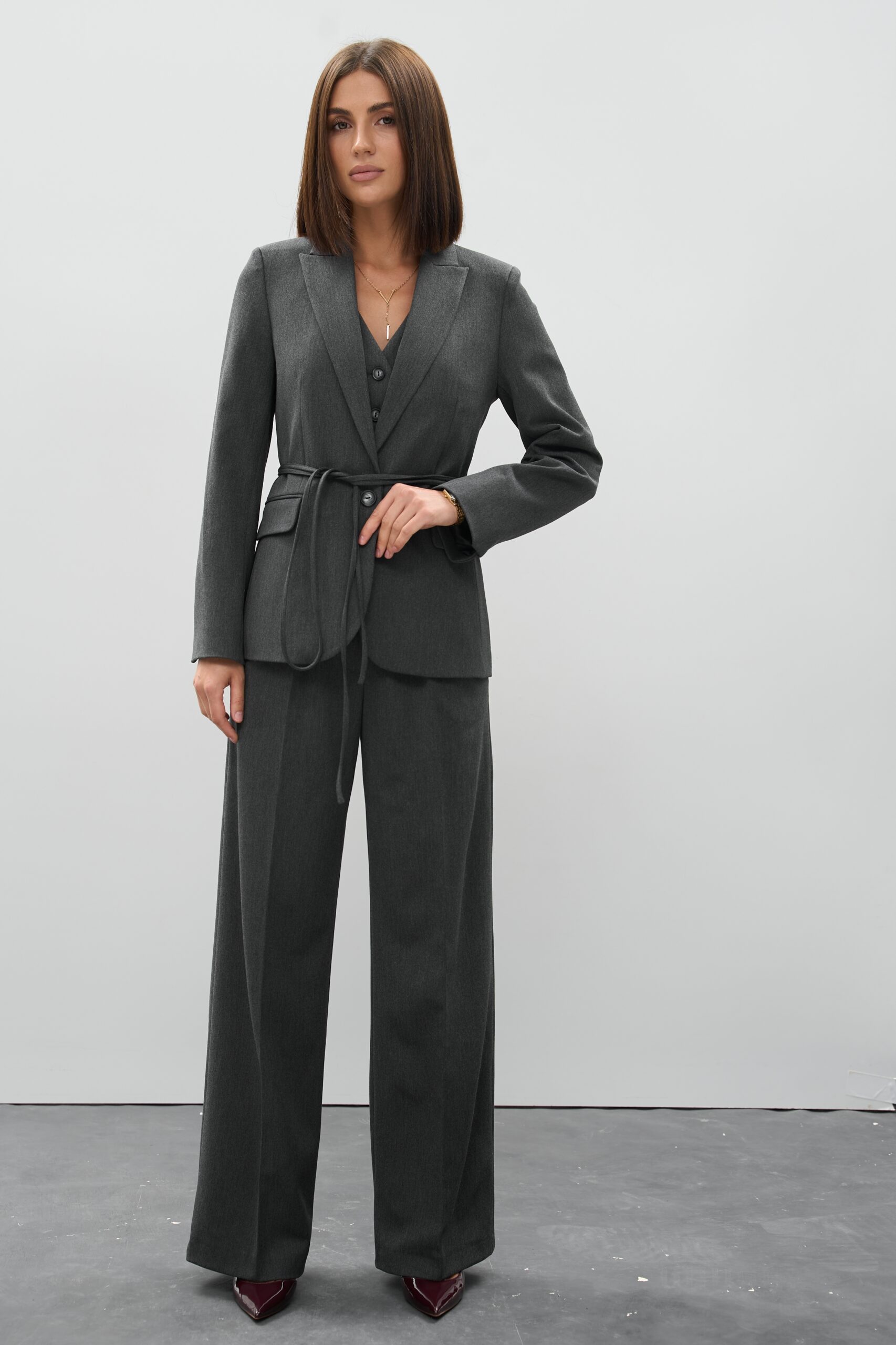 Графітовий відтінок — благородний, стриманий і надзвичайно універсальний. Він легко комбінується з білим, бежевим, пастельними та яскравими акцентами, дозволяючи створювати як ділові, так і стильні кежуал-образи.