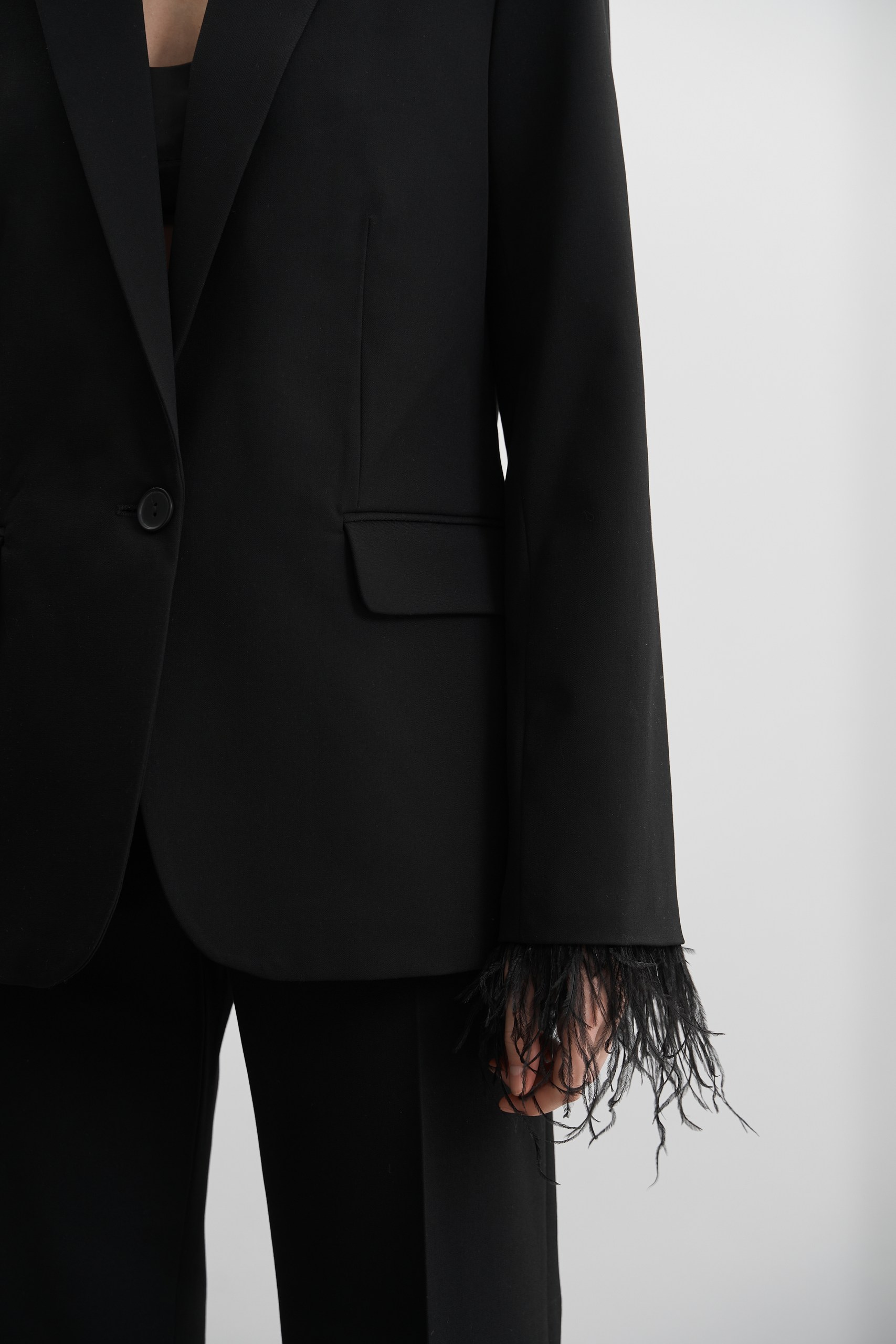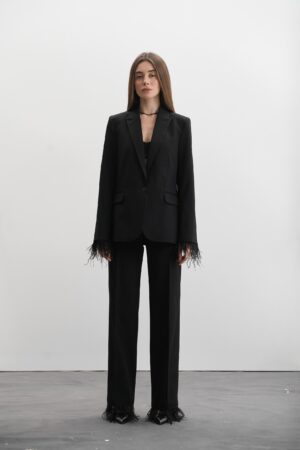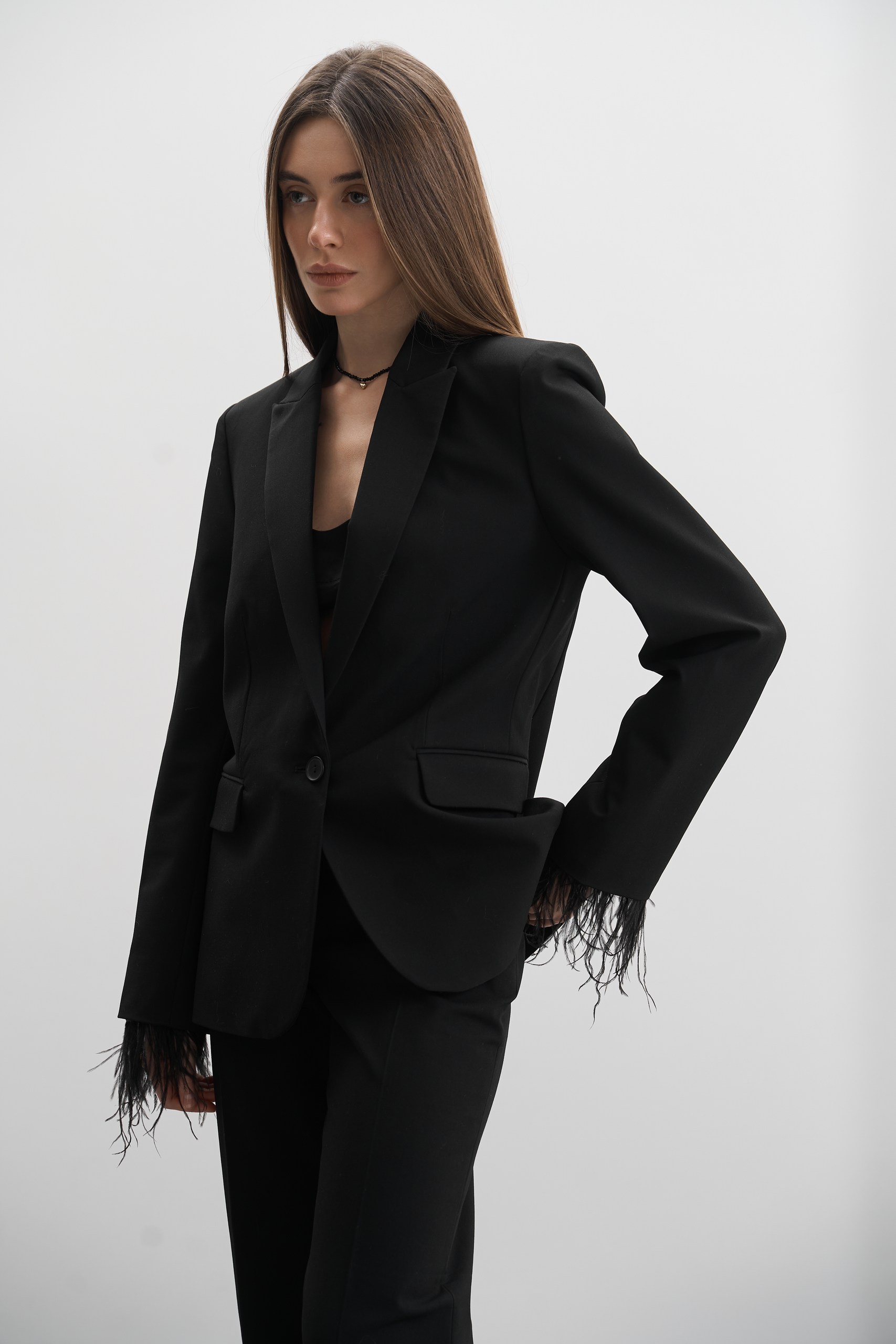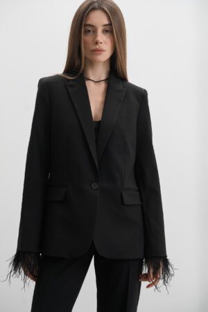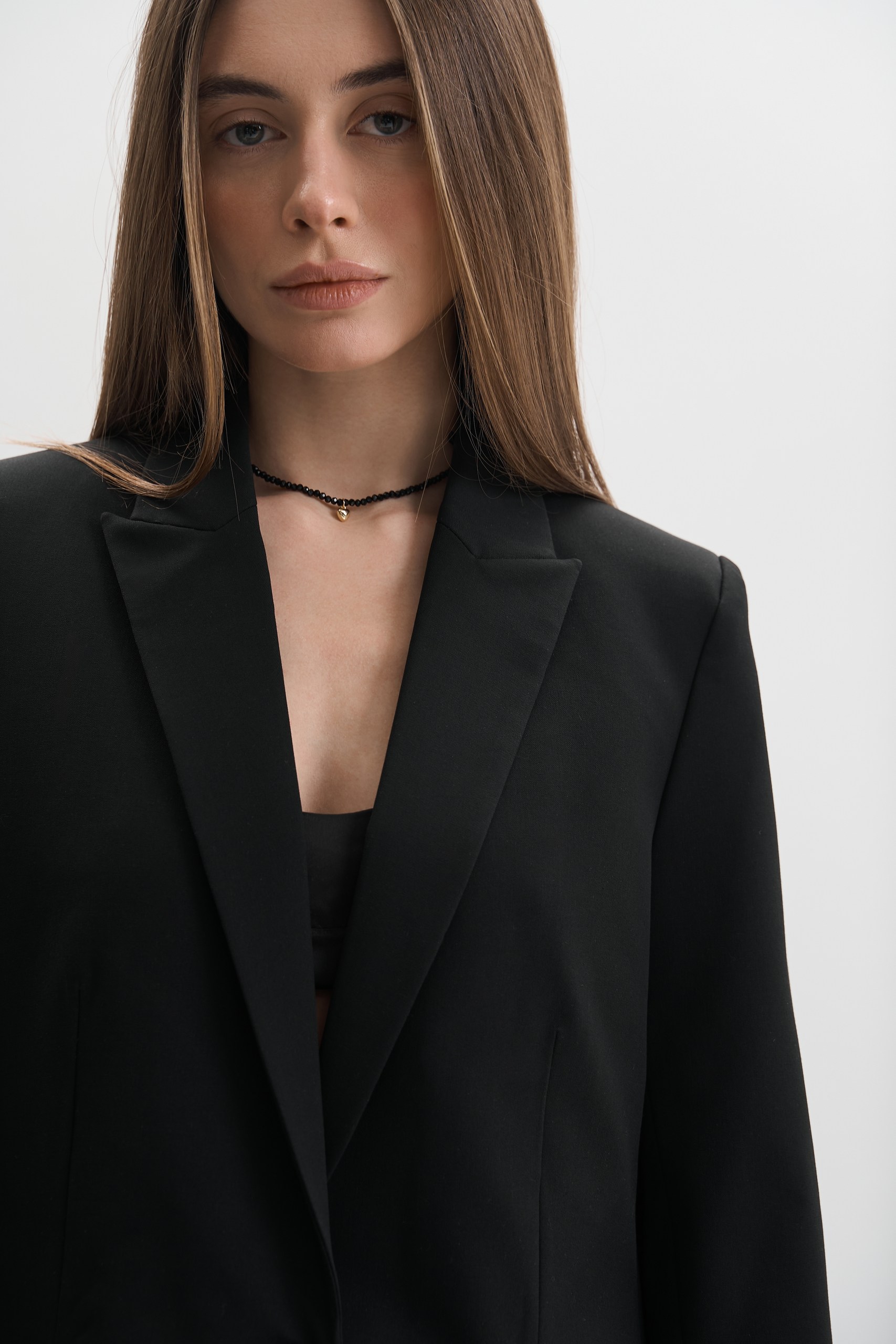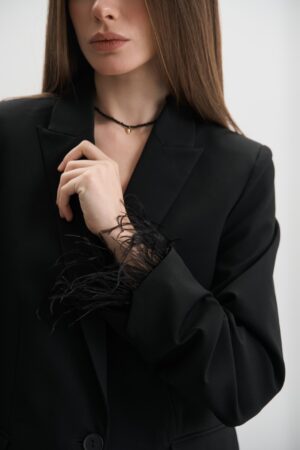 Піджак має класичний, однобортний дизайн із приталеним кроєм, що підкреслює вашу фігуру та створює вишуканий силует. Чорний колір надає піджаку універсальності, дозволяючи поєднувати його з різними елементами гардероба.