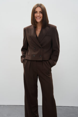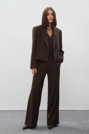 Цей вкорочений піджак у глибокому шоколадному кольорі створений для жінок, які цінують вишуканий стиль, комфорт і трендові силуети. Він гармонійно поєднує в собі строгість класичного крою та легкість сучасного дизайну. Вкорочена довжина додає образу динамічності, а чітка лінія плеча та ідеально вивірений крій підкреслюють фігуру, залишаючи повну свободу рухів.