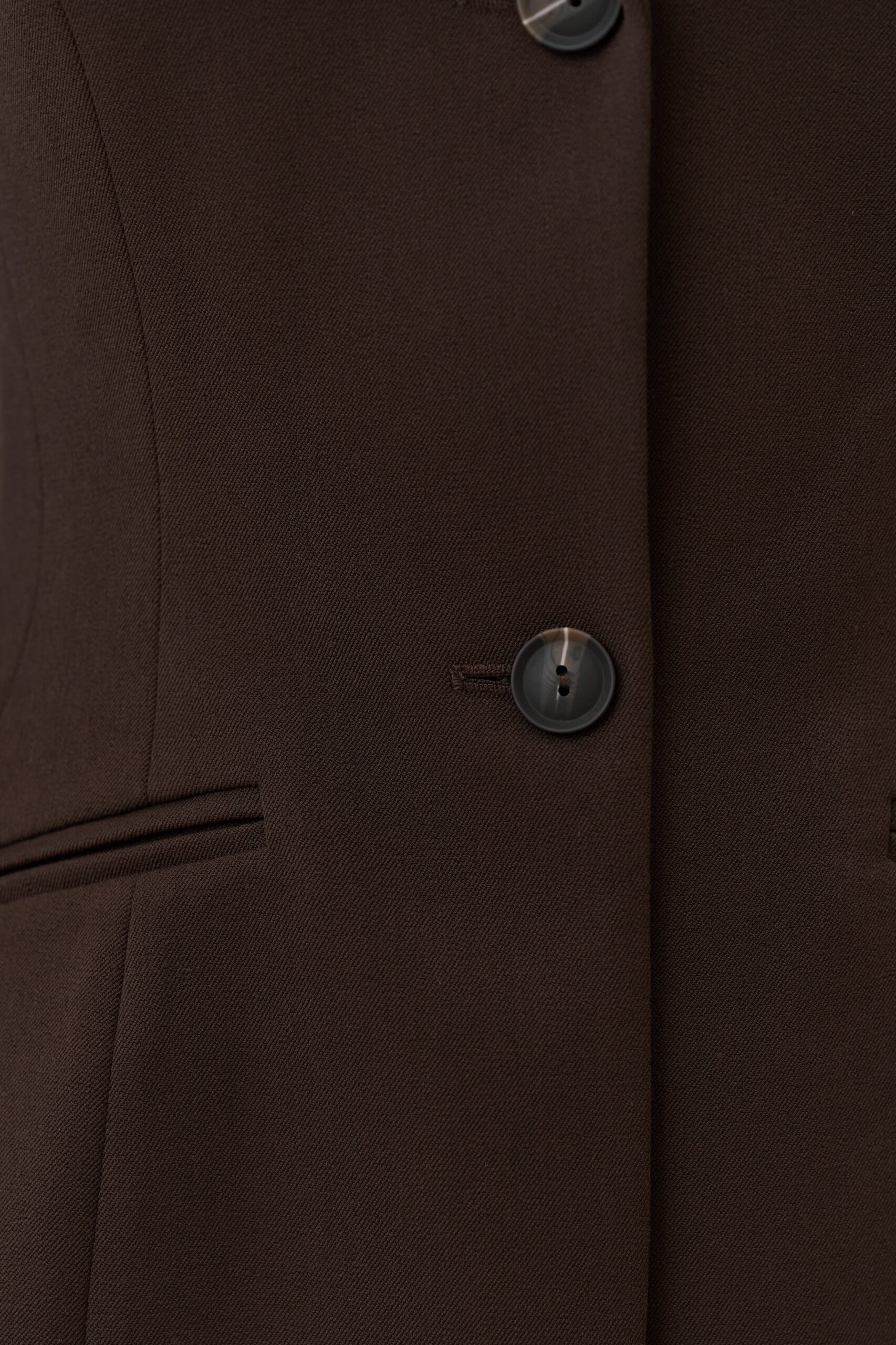Жіночий піджак шоколадного кольору класичний однобортний — приталений піджак з акцентом на талії з вовняної тканини. Стильний жіночий піджак шоколадного кольору для офісу, ділових зустрічей і повсякденних образів. Купити жіночий піджак з вовни, підкладка віскоза, елегантний і універсальний варіант на кожен день.