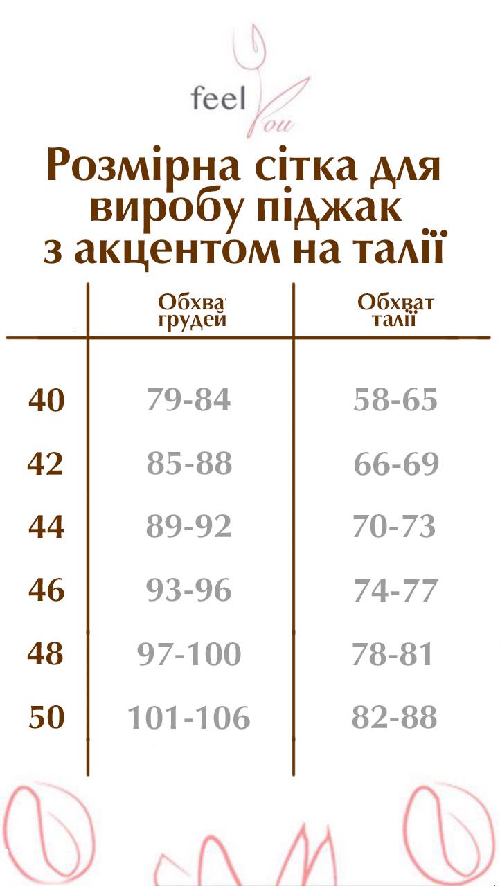 Доступні розміри: 40, 42, 44, 46, 48, 50 — для ідеальної посадки на різні типи фігури.