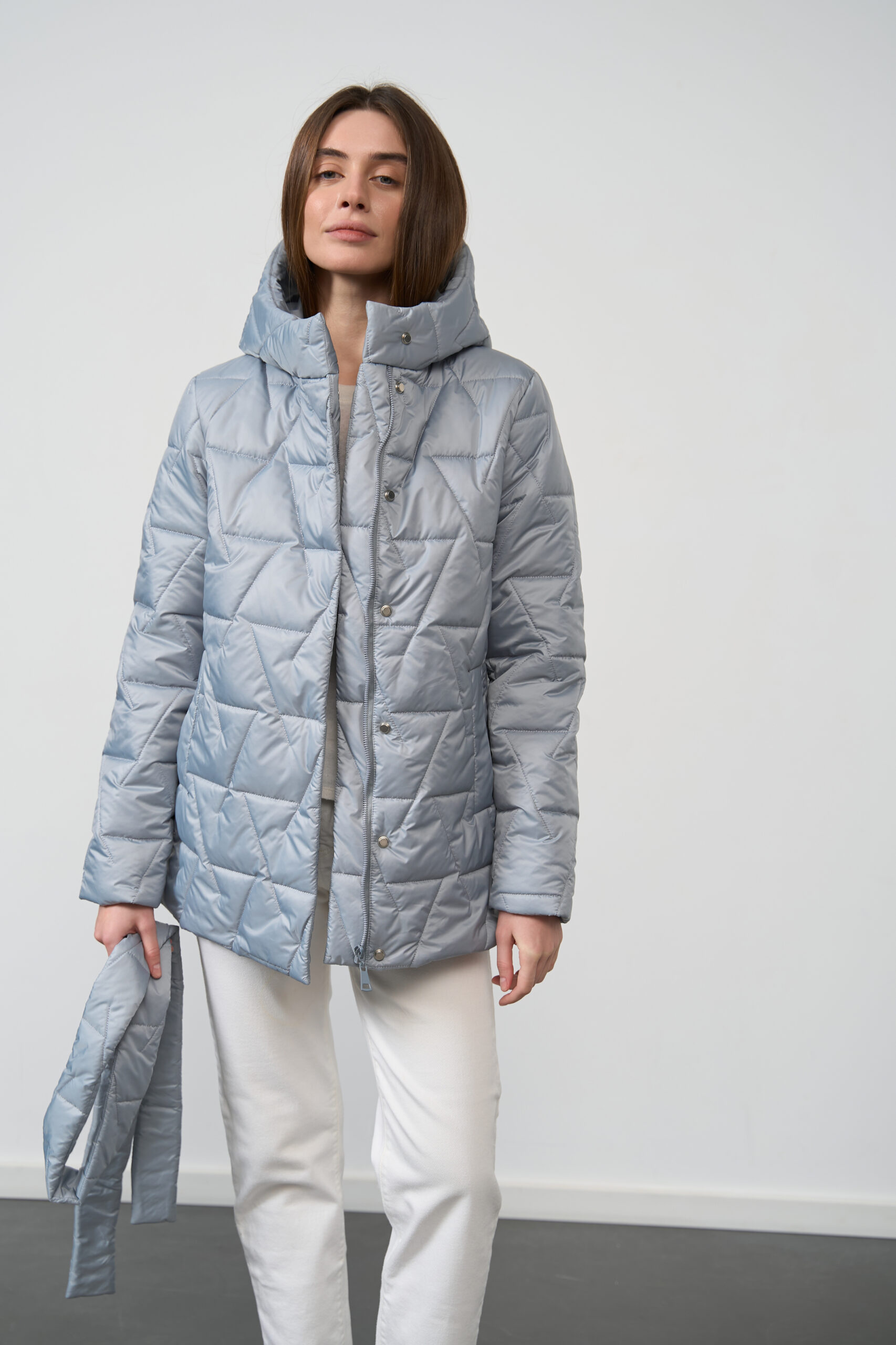 Ця стильна куртка — ідеальний вибір для весняного сезону, коли важливо поєднувати елегантність і комфорт. Виготовлена з високоякісної плащівки, вона захищає від вітру та легко витримує легкий дощ. Наповнювач із синтепону 150 забезпечує чудову теплоізоляцію, що робить її ідеальним варіантом для весни. Куртка має прямий, злегка приталений крій, що підкреслює силует, даруючи вам стильний вигляд і комфорт протягом дня. Стильна стьожка на талії дозволяє вам регулювати посадку, додаючи додатковий акцент на фігурі.