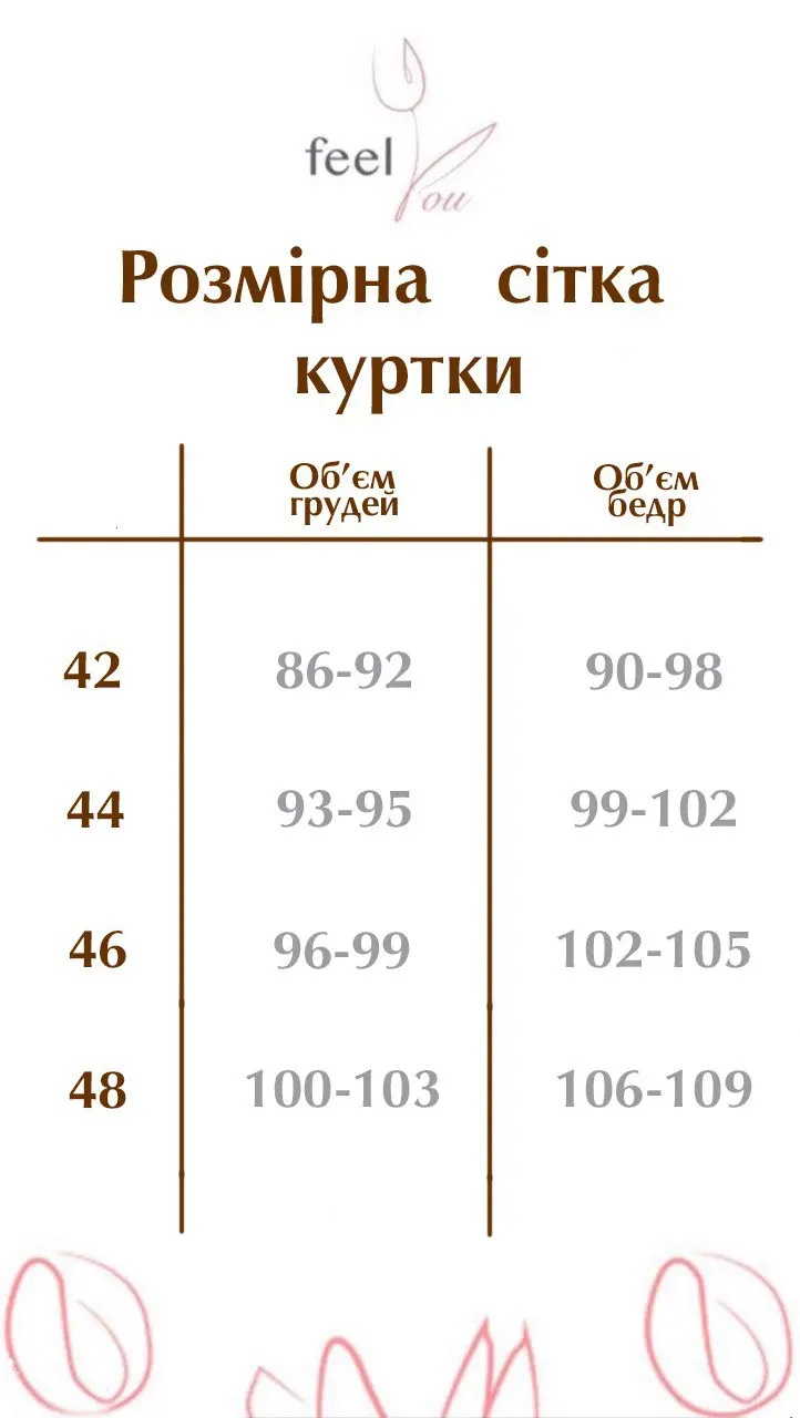 Модель доступна в розмірах 42, 44, 46 та 48, що дозволяє підібрати ідеальний варіант для кожної модниці. Вибір цієї куртки — це вибір комфорту, стилю та надійності на кожен день весняного сезону.