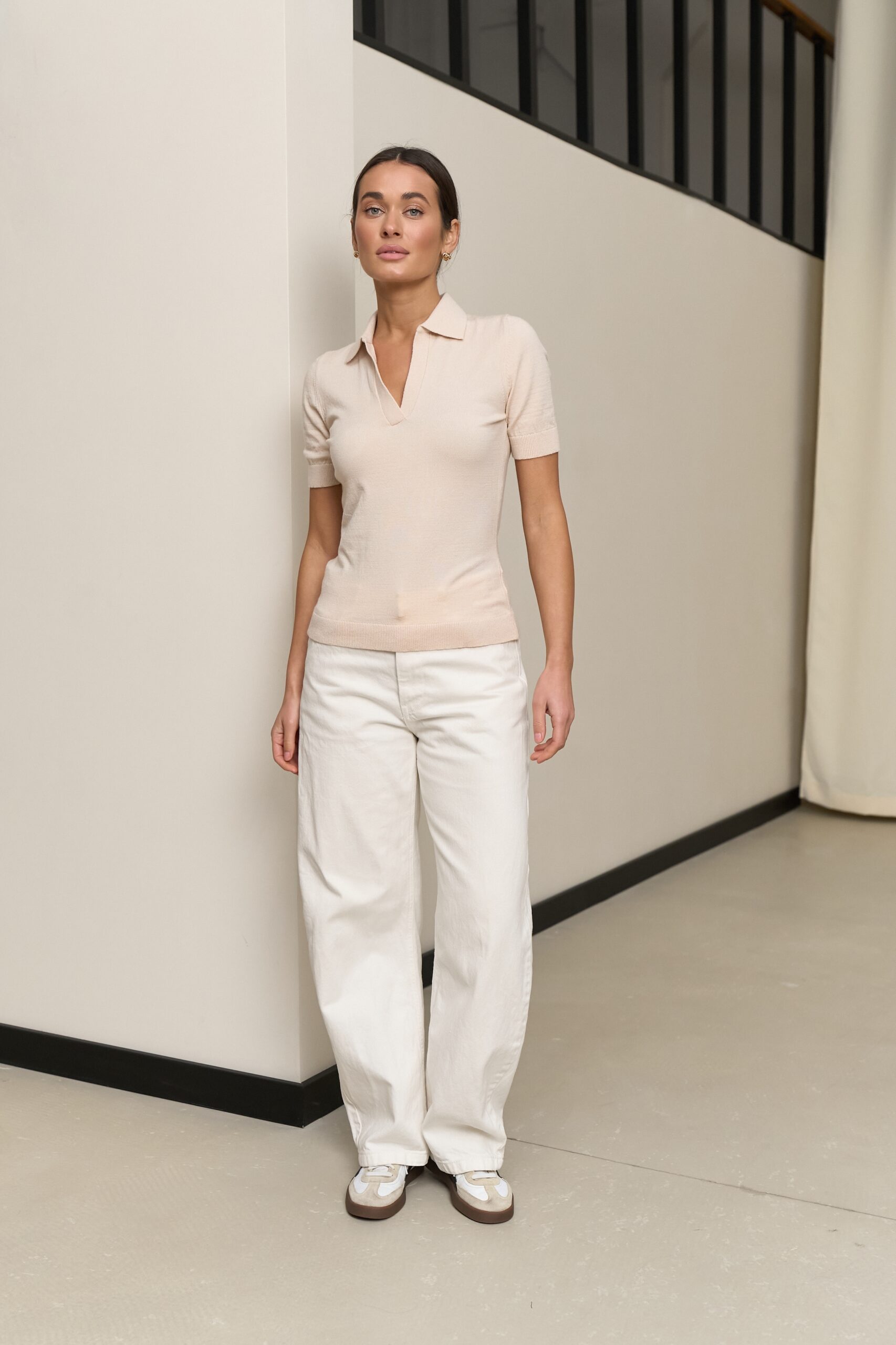 Бежеве жіноче поло гладкої в’язки підкреслює жіночність без зайвої демонстративності, створюючи акуратний і доглянутий силует. Це універсальна базова модель, яка залишається актуальною незалежно від сезону.