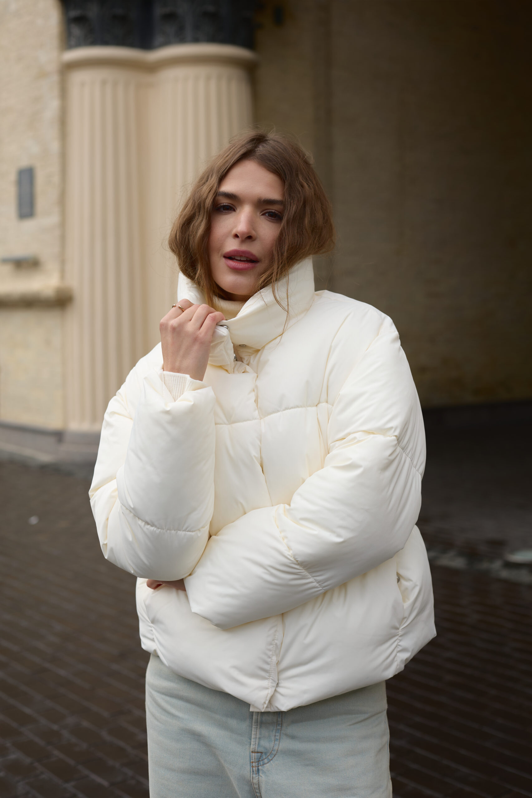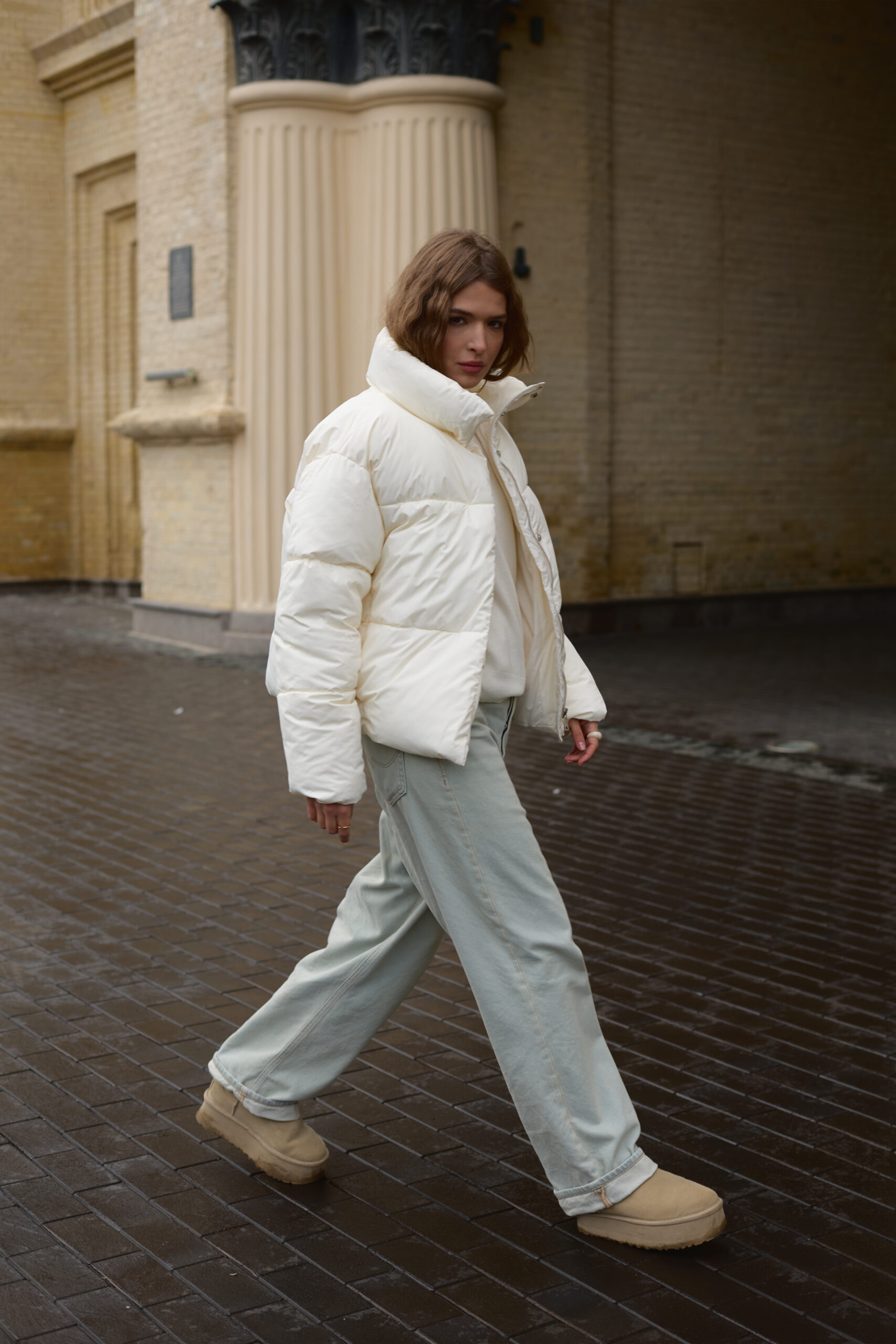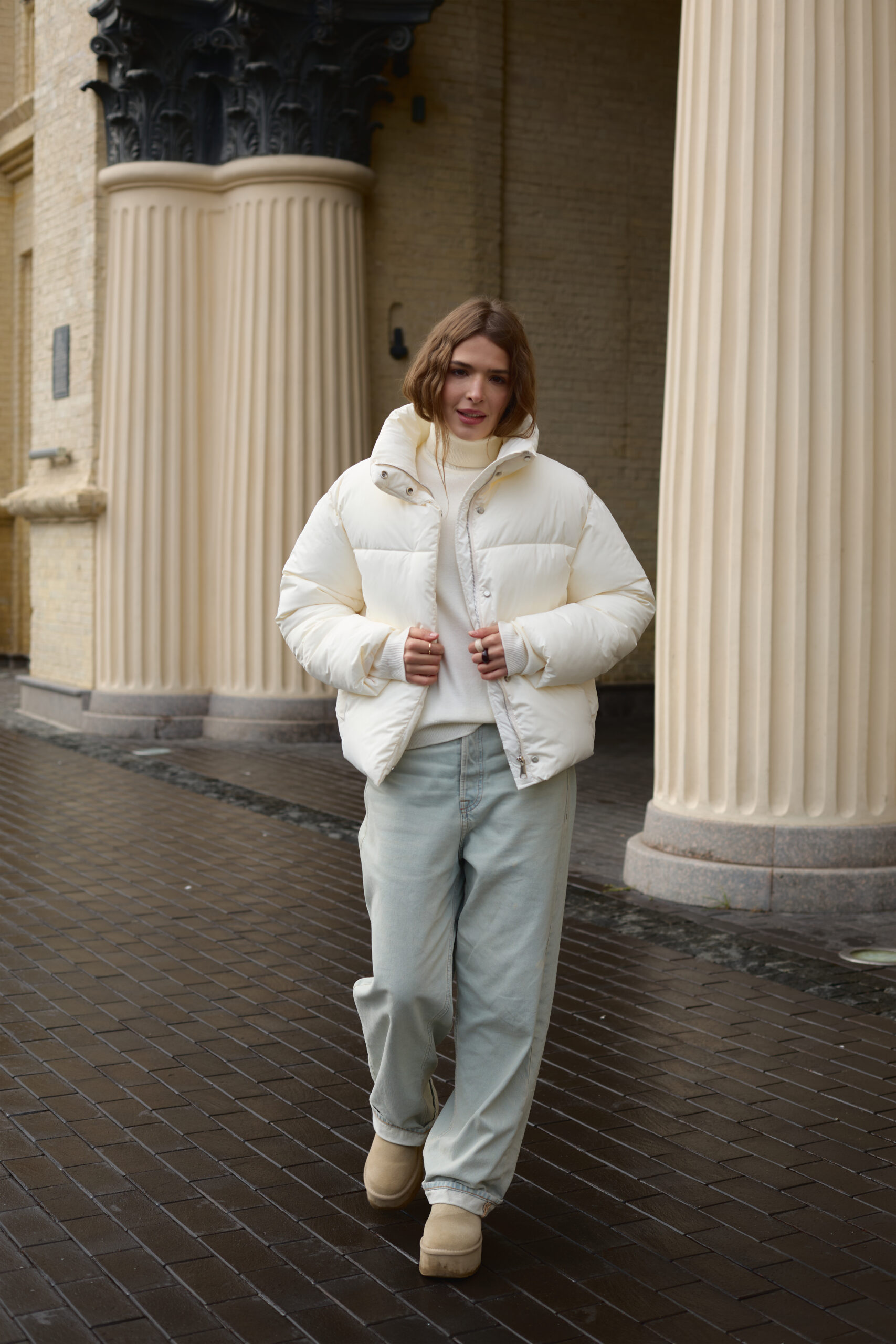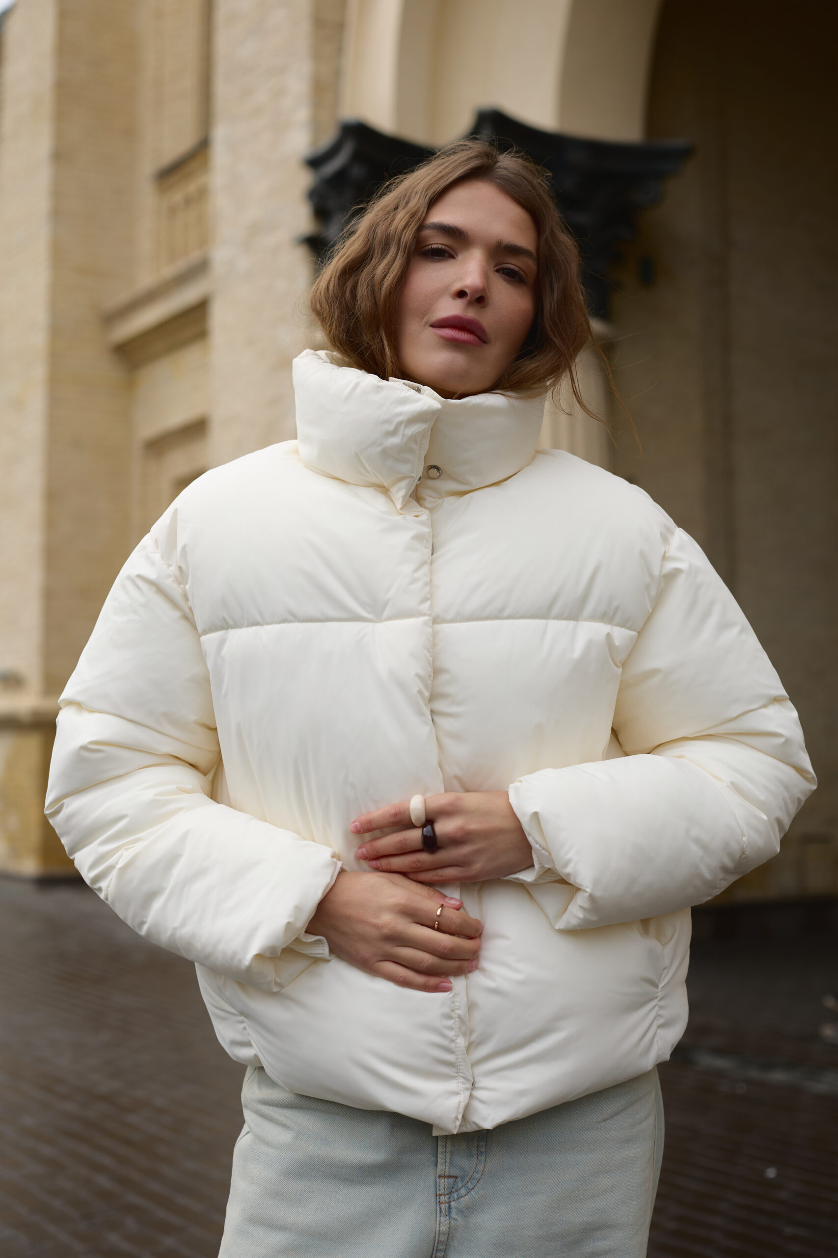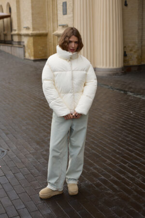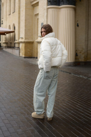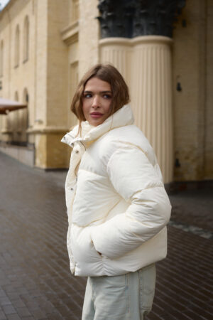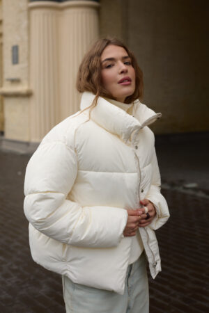 Трендовий жіночий пуховик у молочному кольорі.