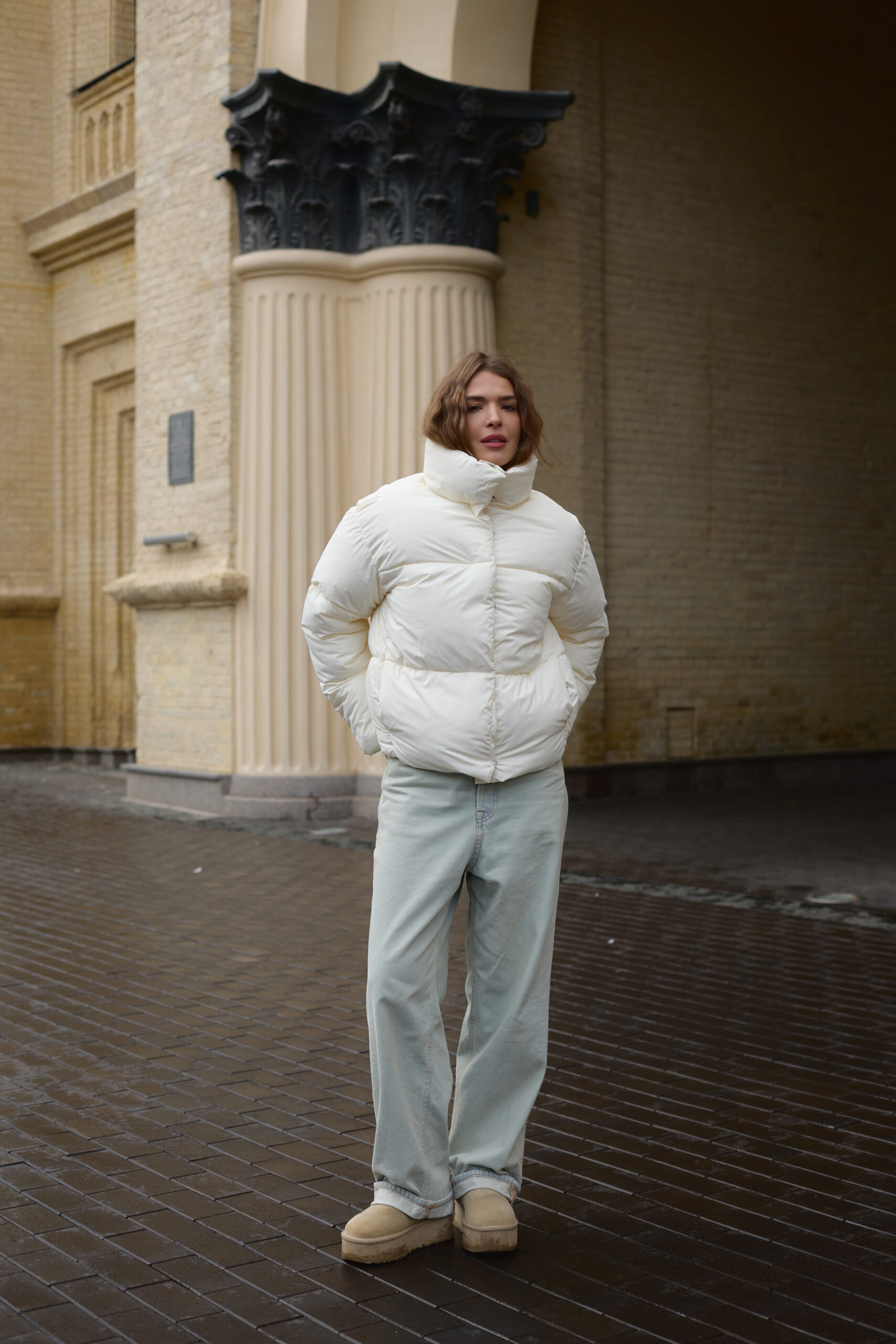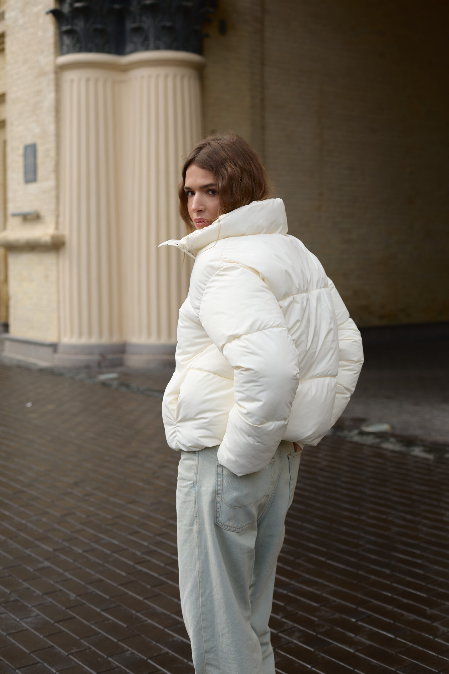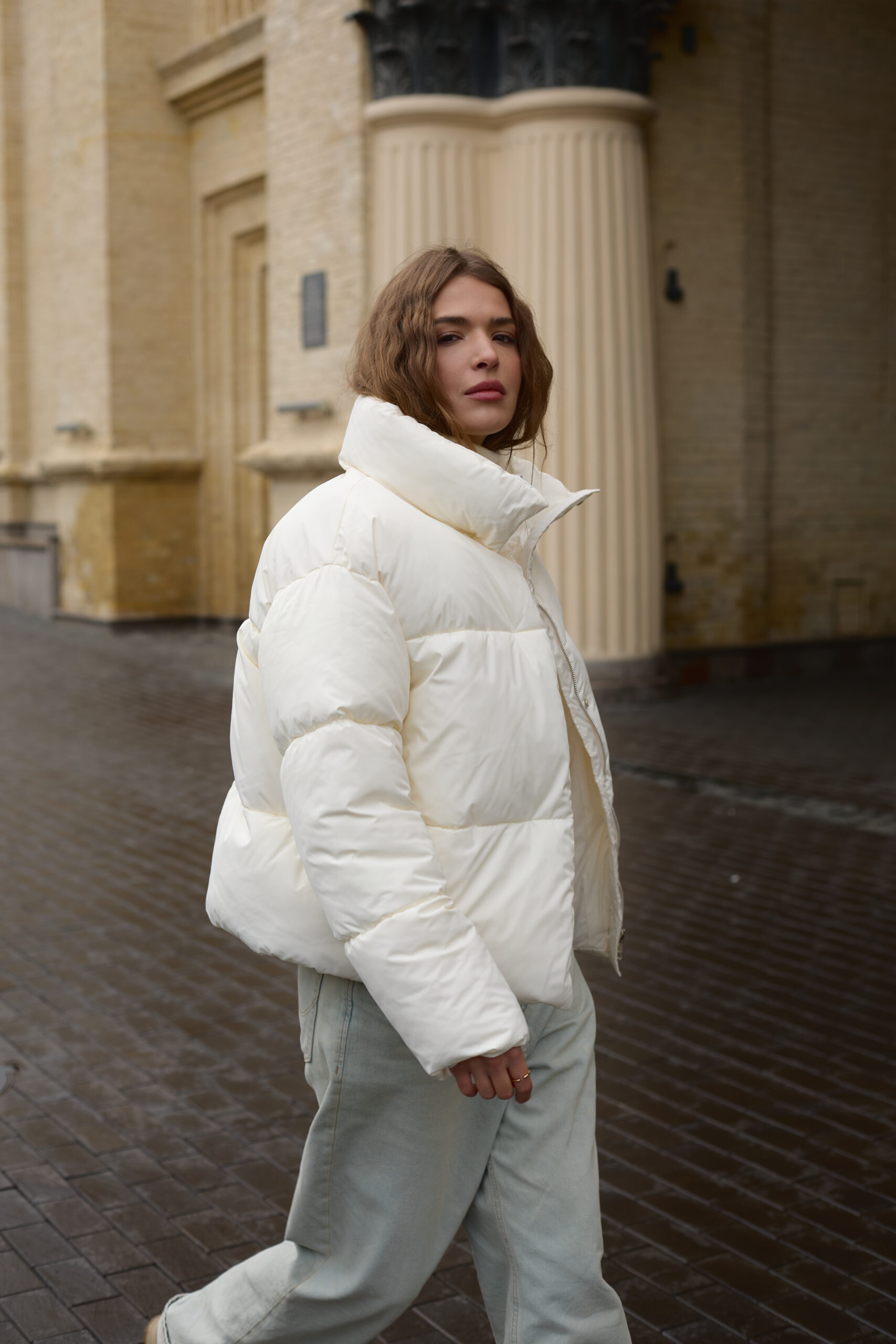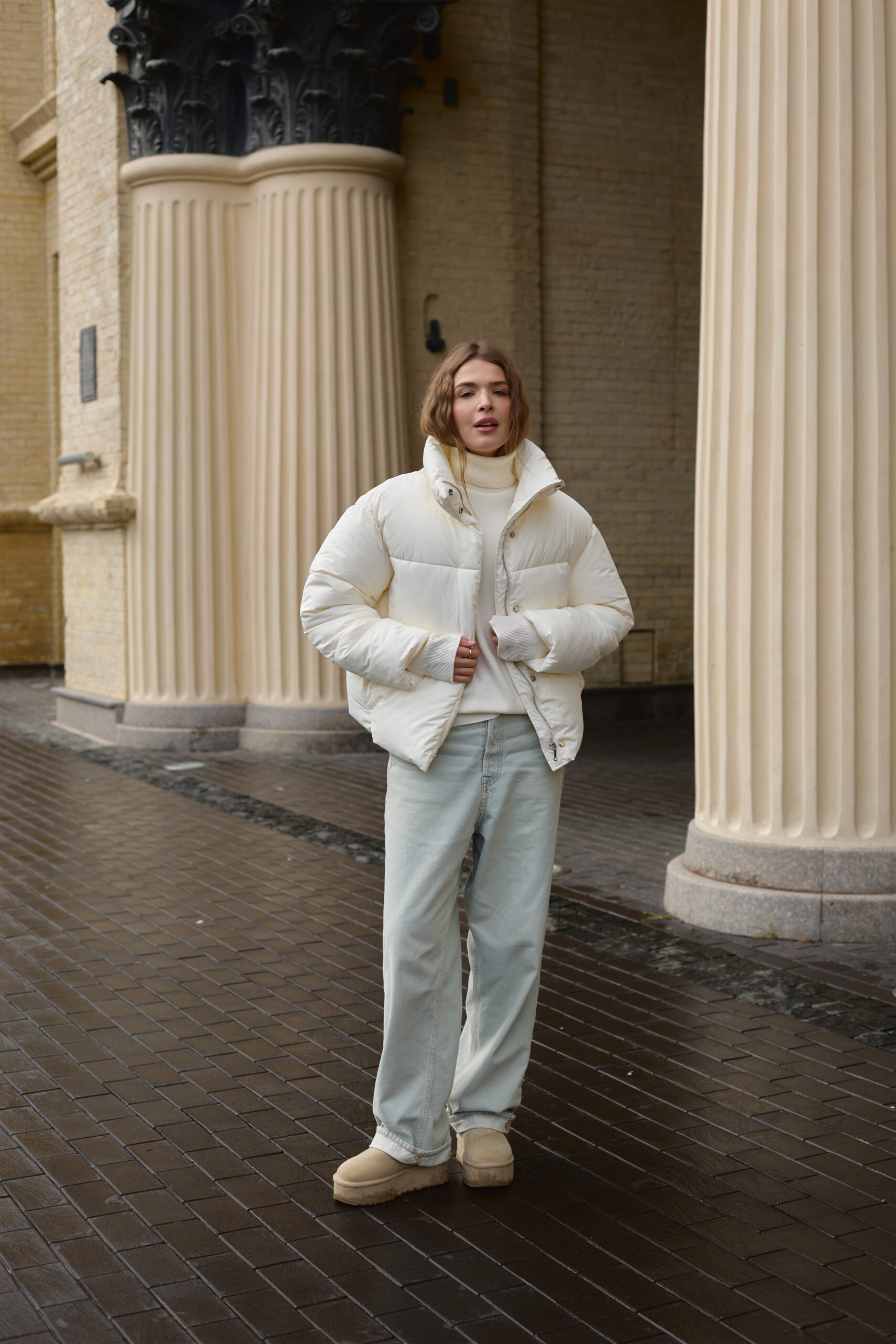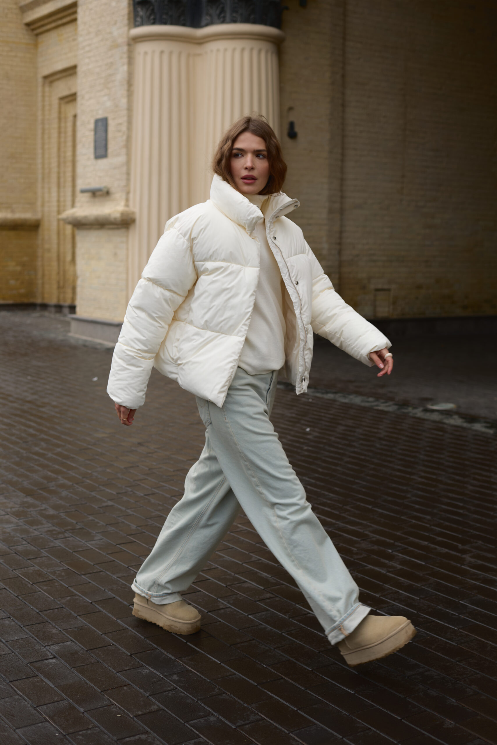 Трендовий жіночий пуховик у молочному кольорі.