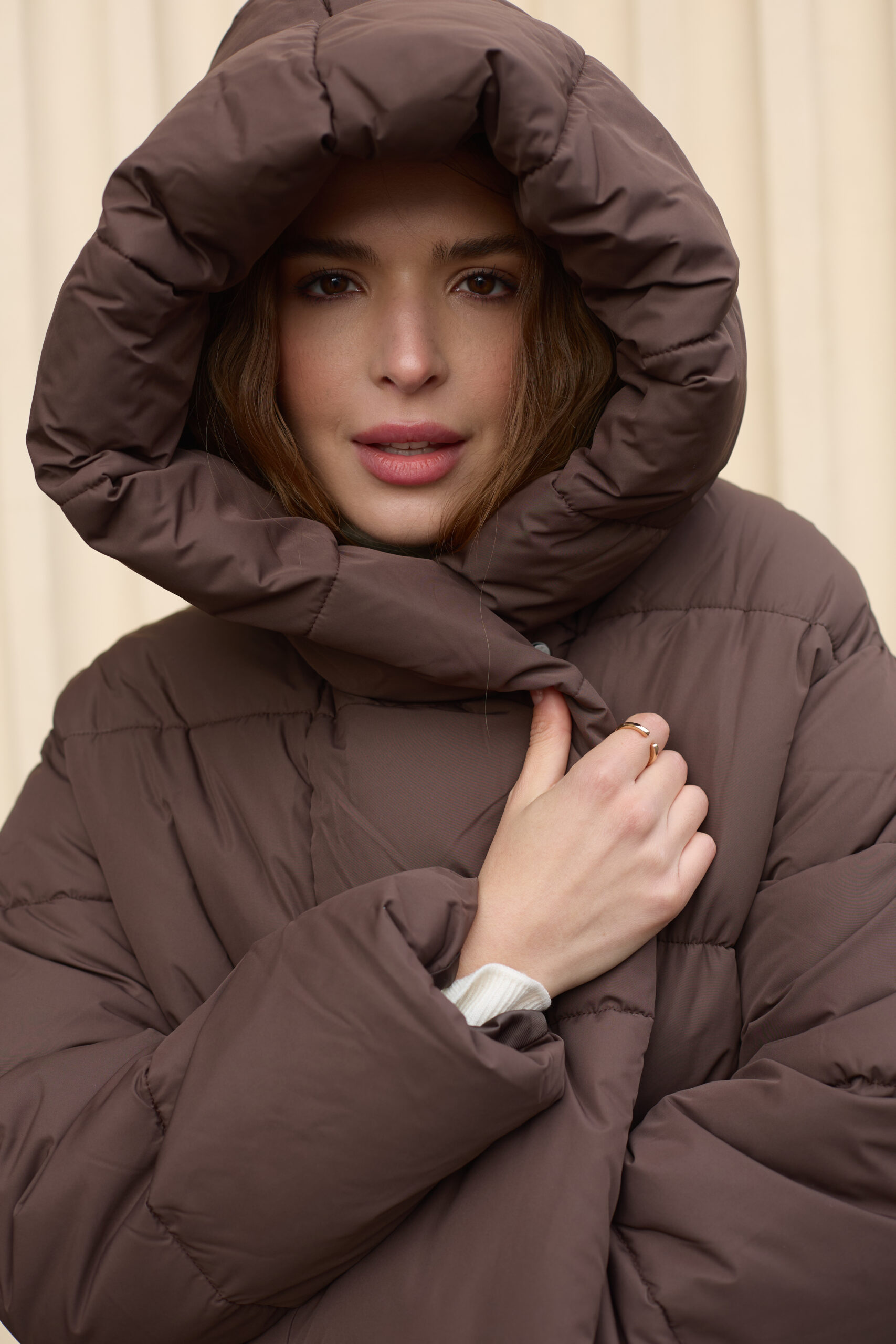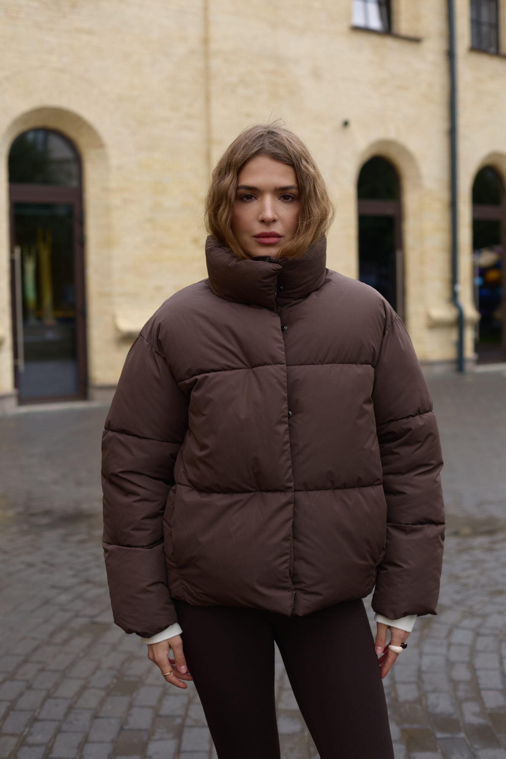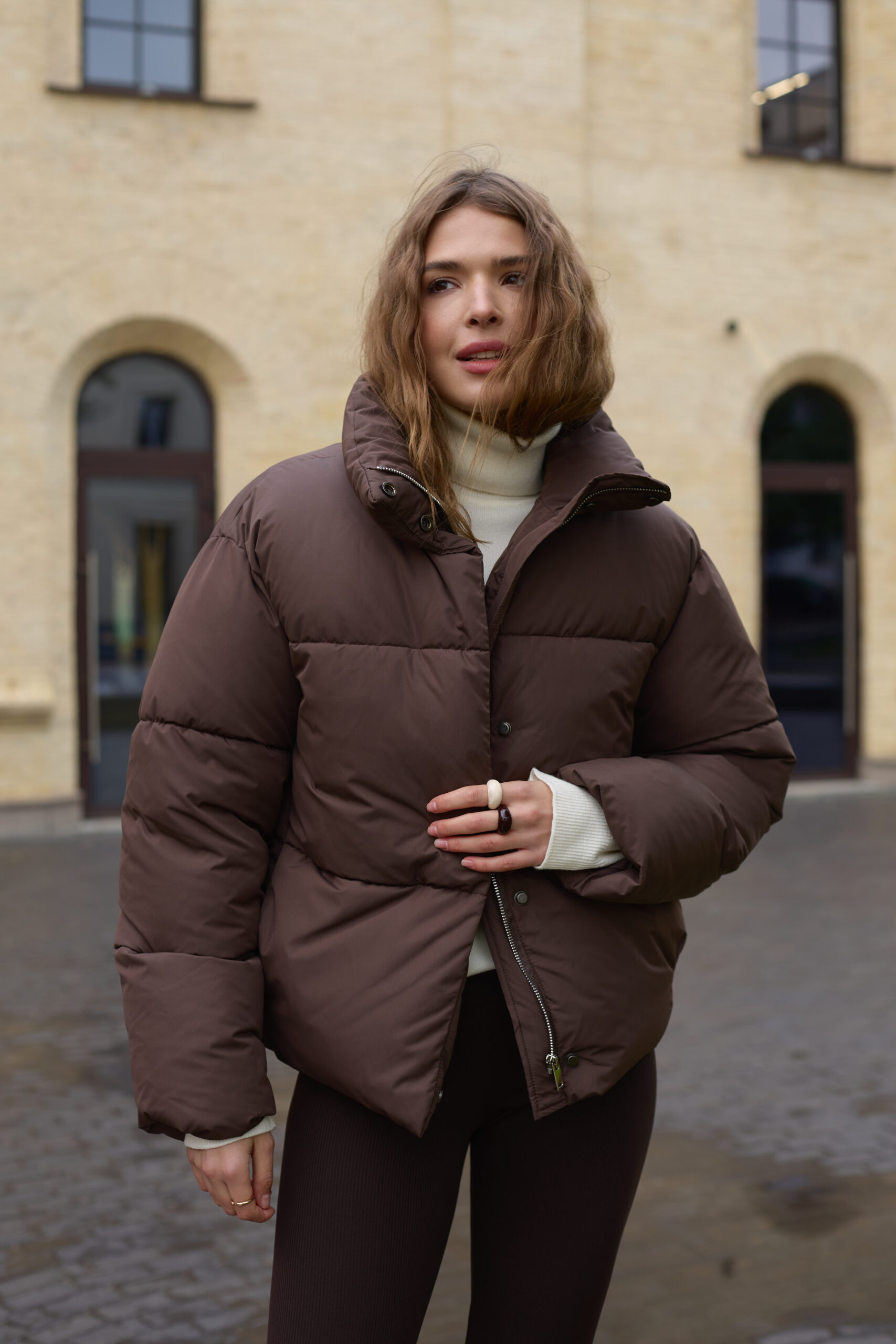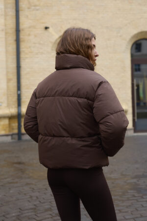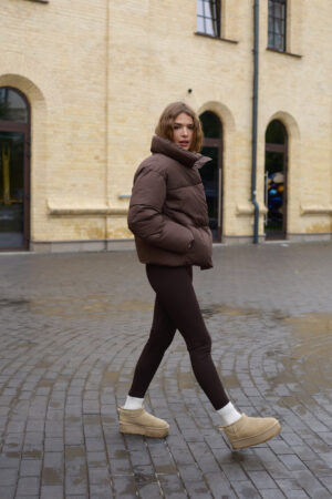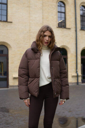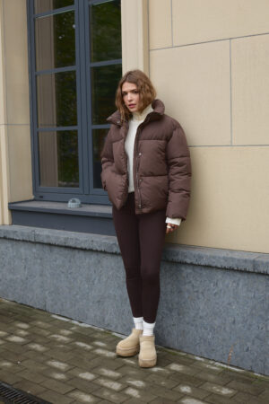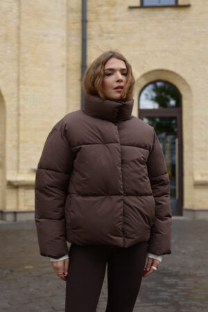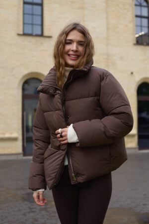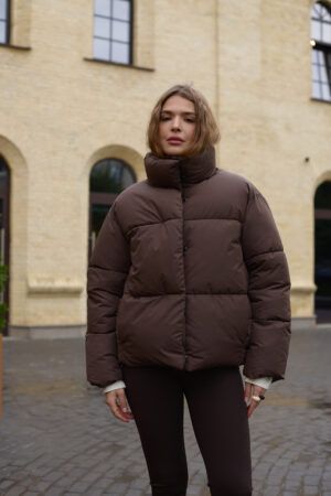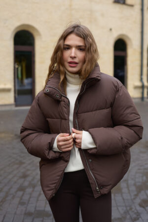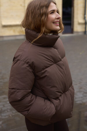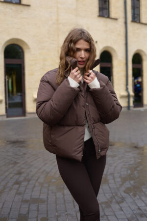 Стильний жіночий пуховик у шоколадному кольорі.