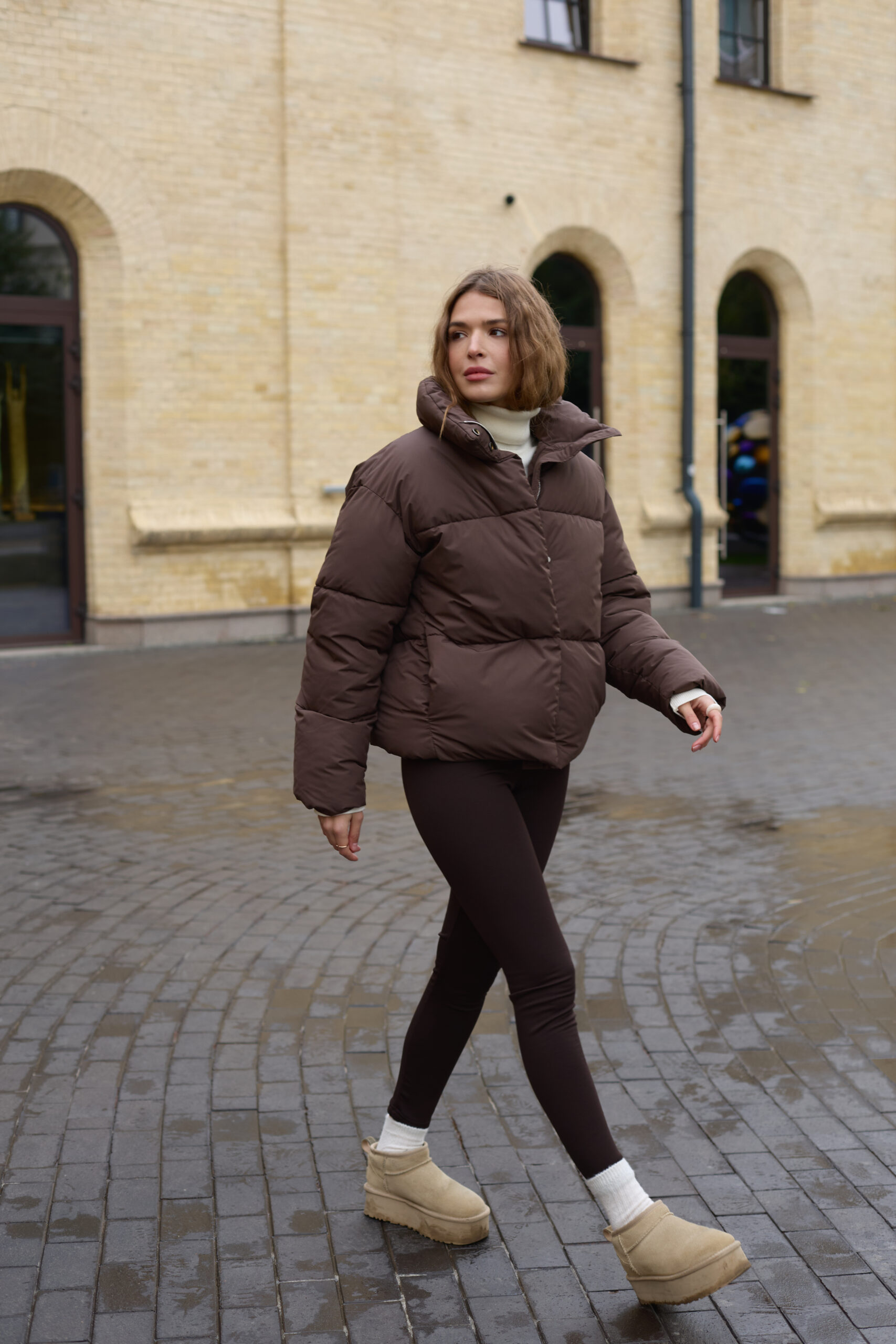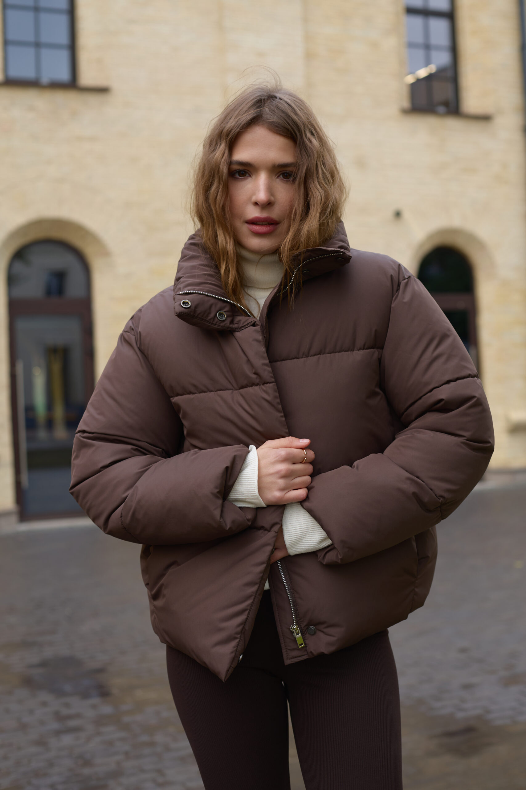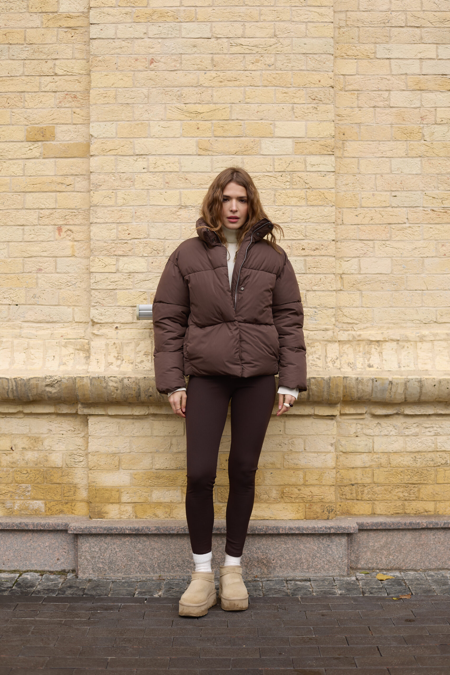 Стильний жіночий пуховик у шоколадному кольорі.
