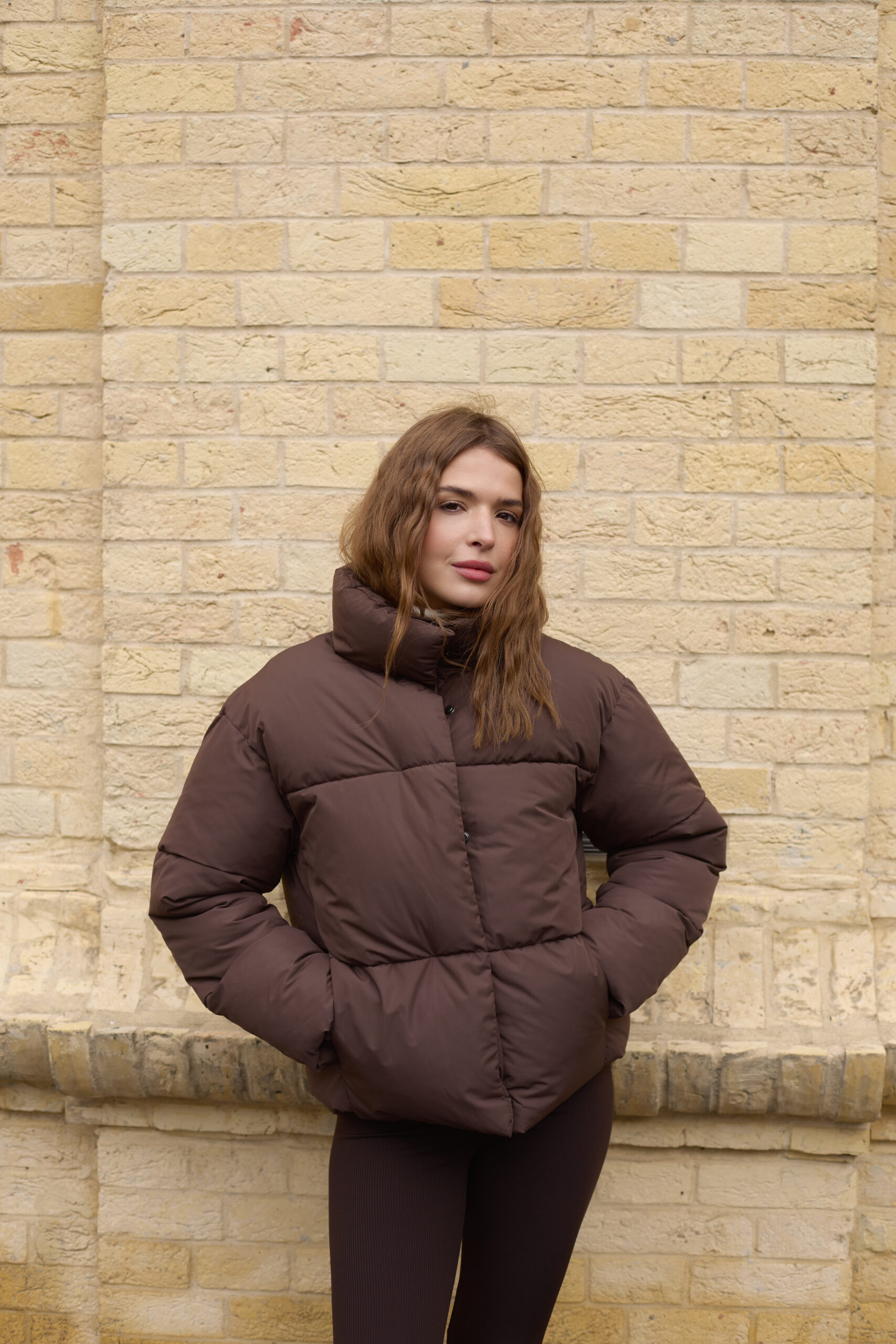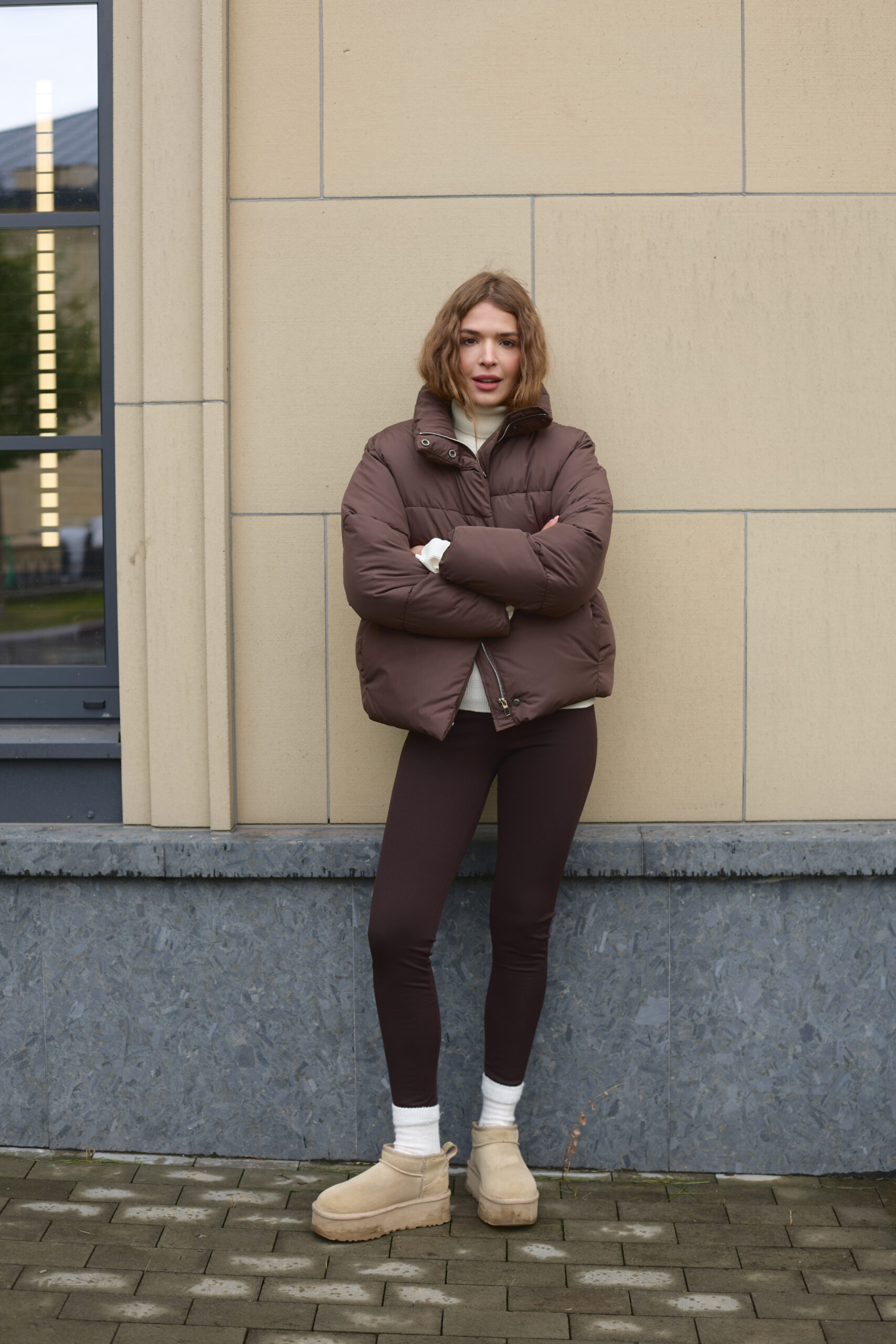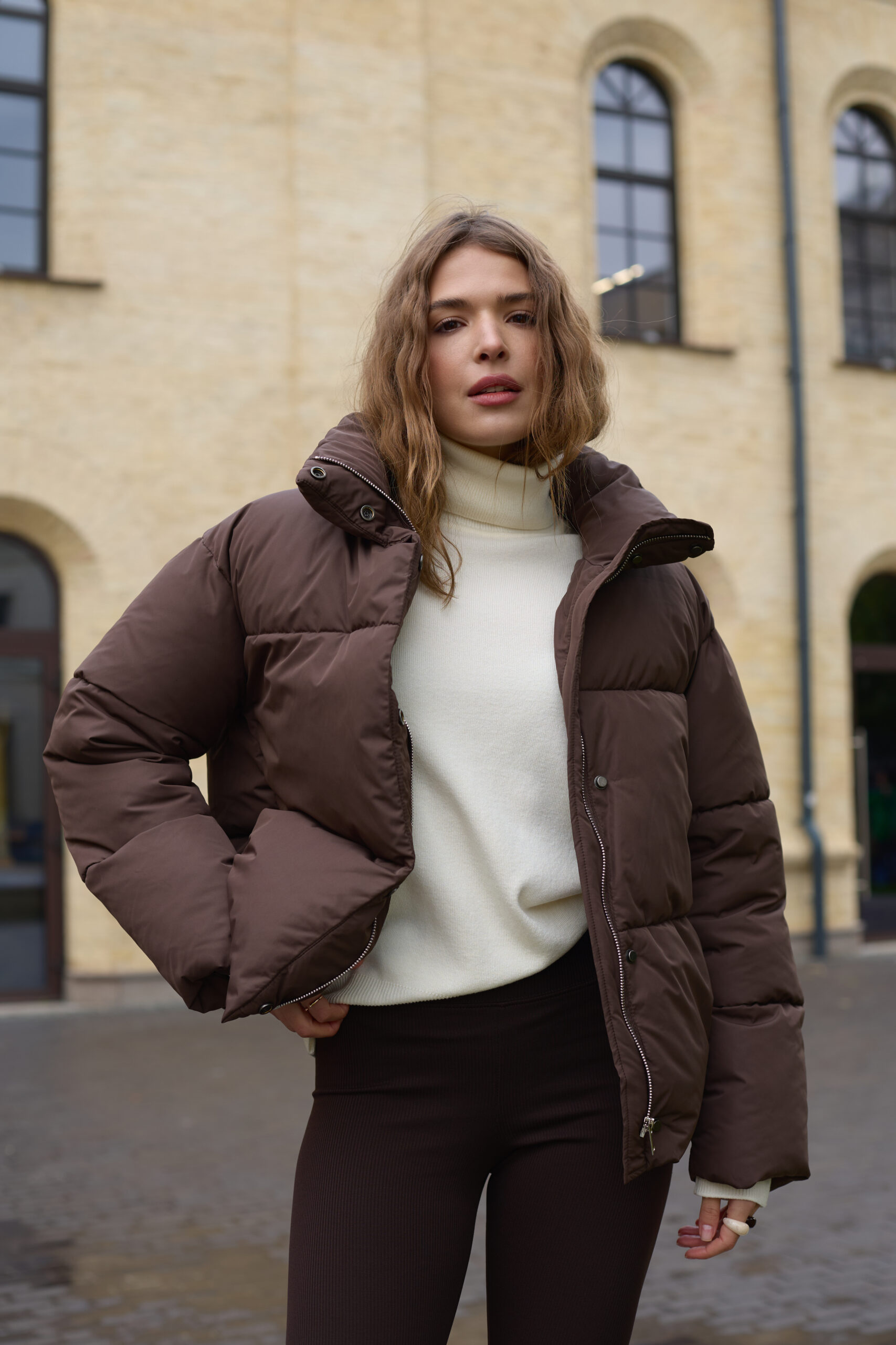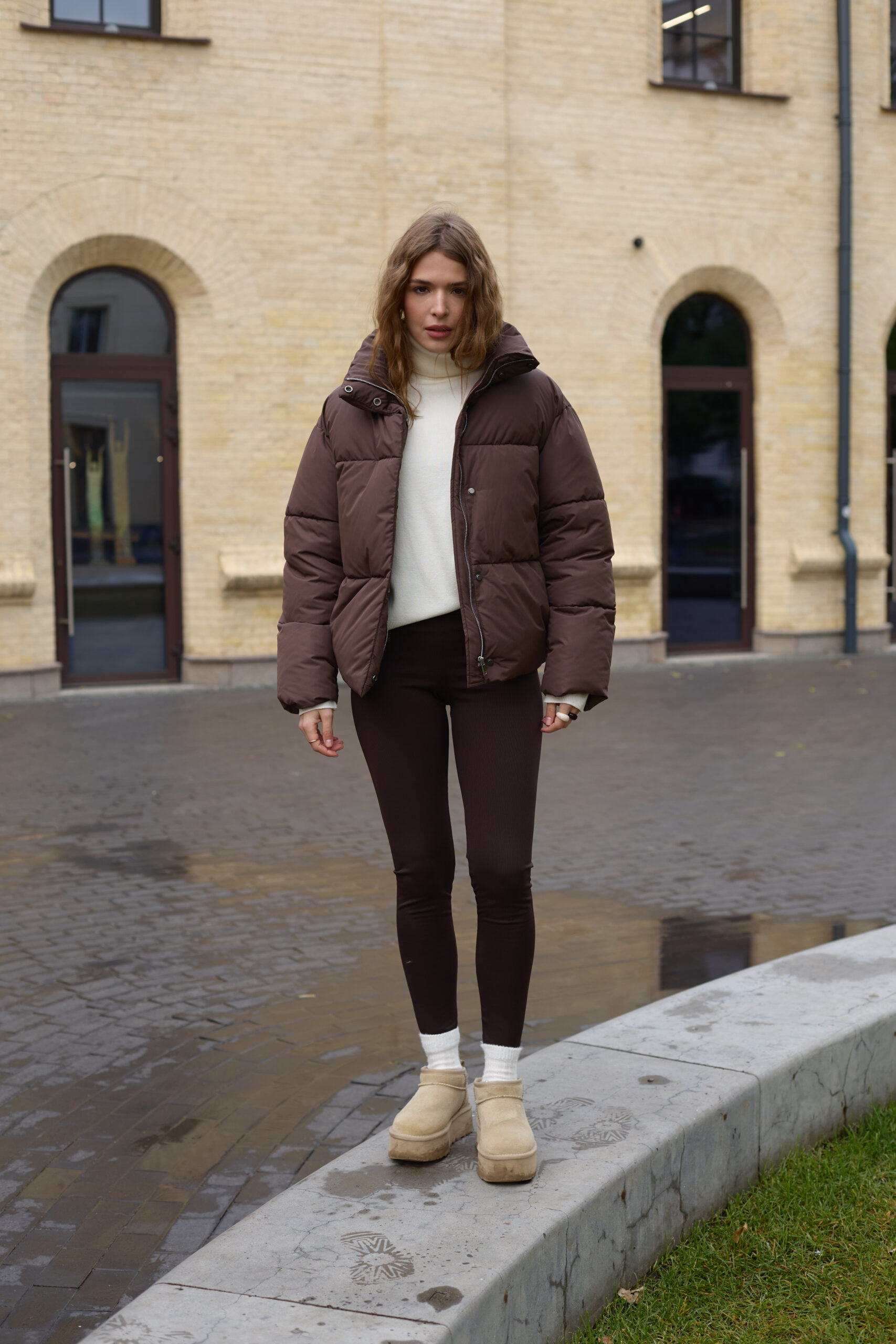Стильний жіночий пуховик у шоколадному кольорі.