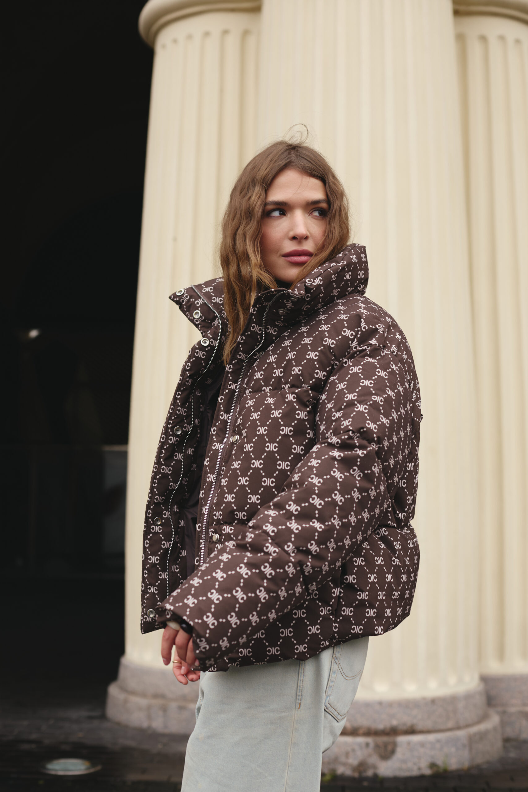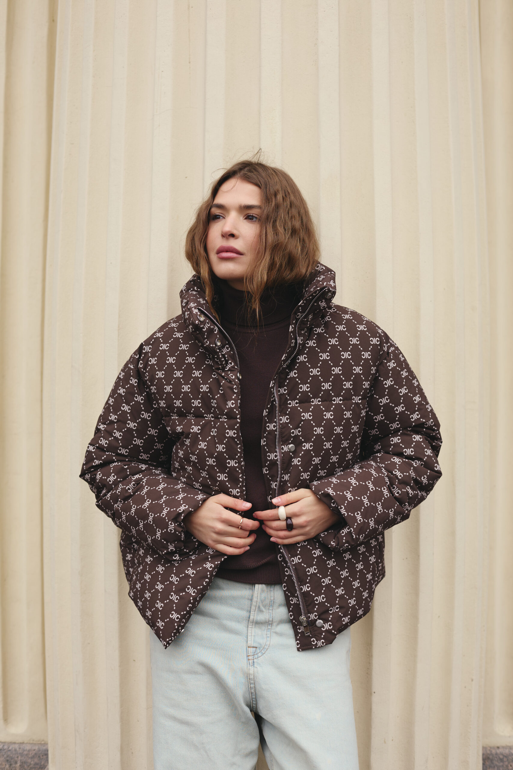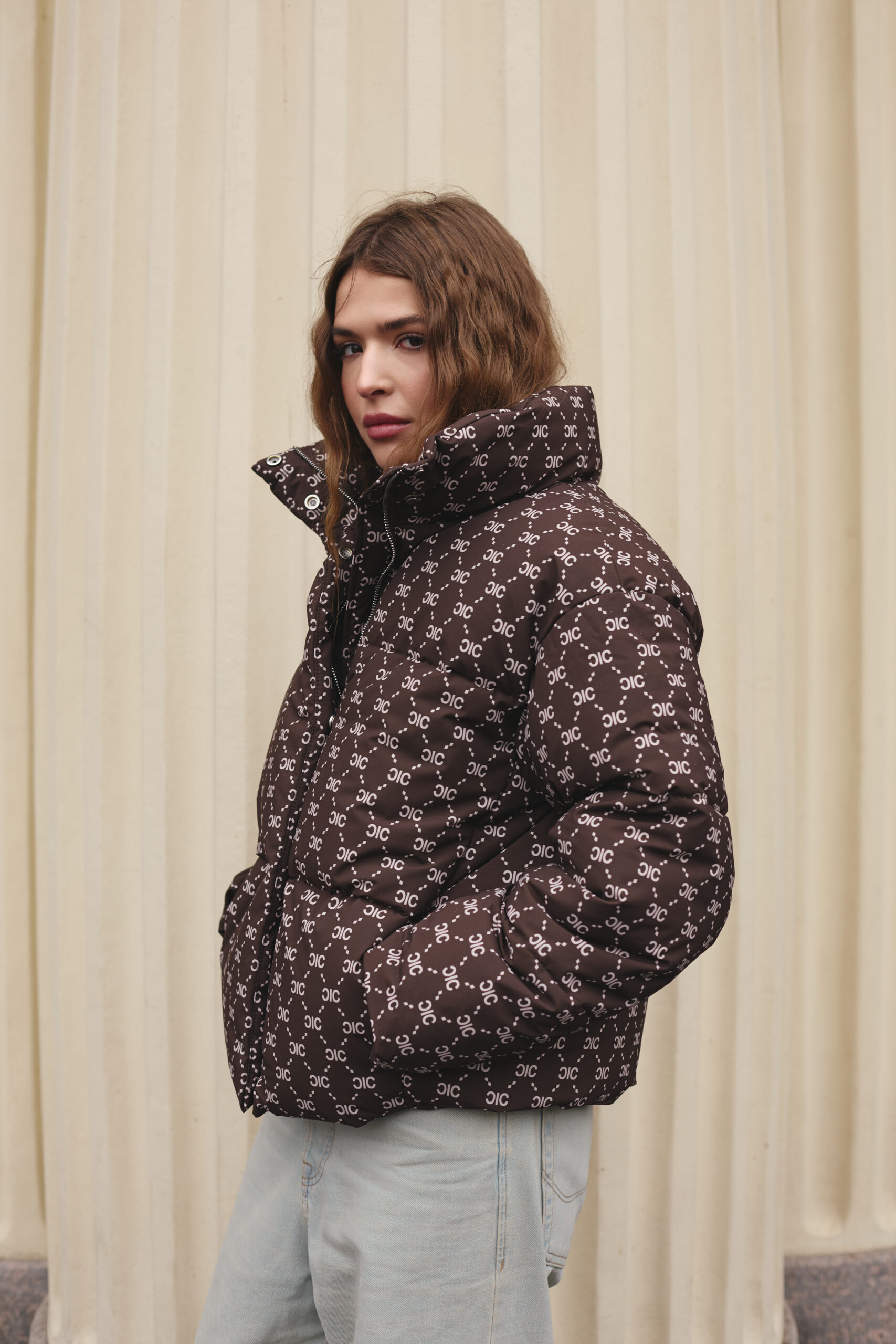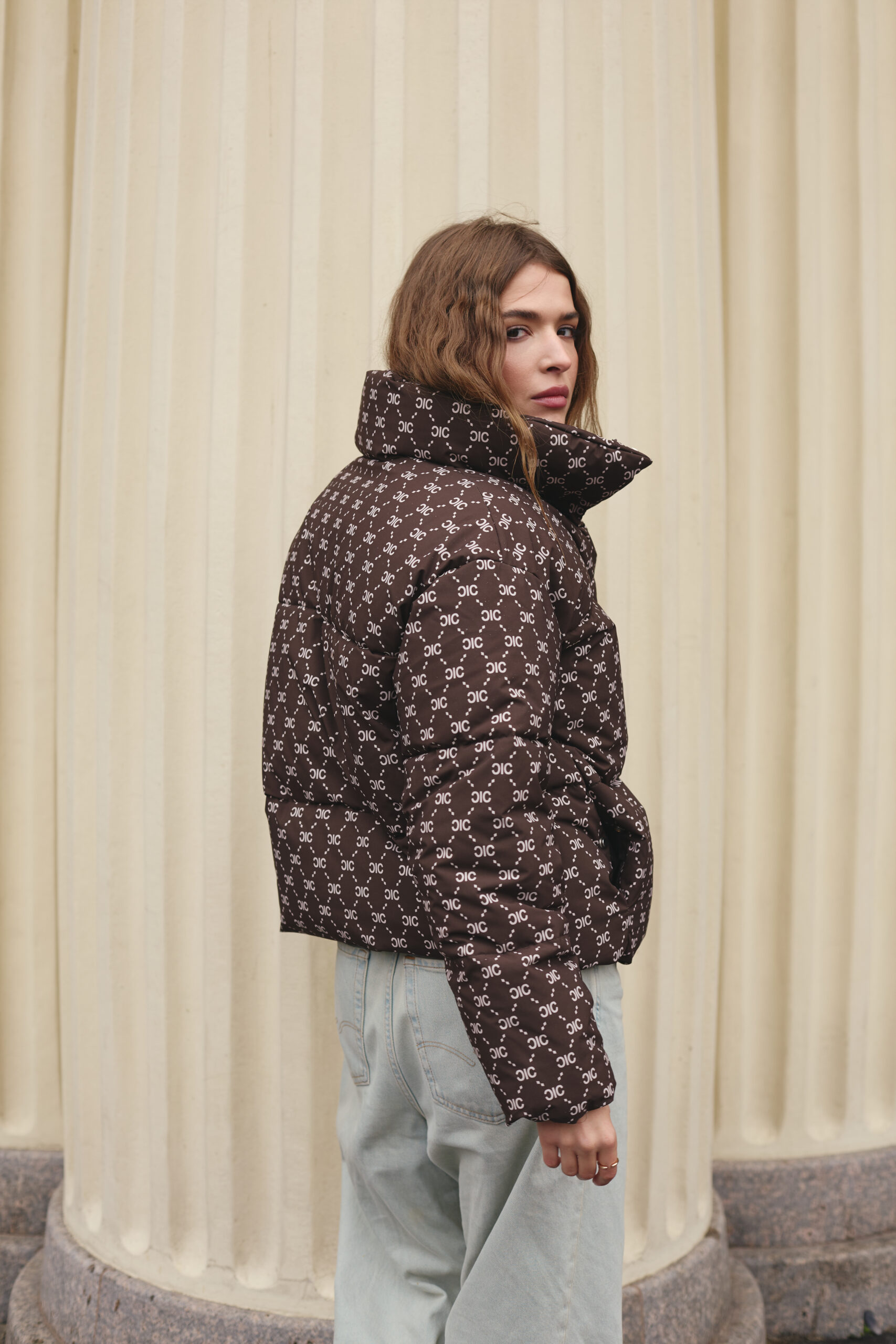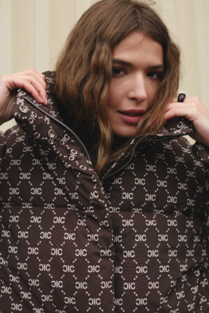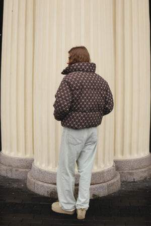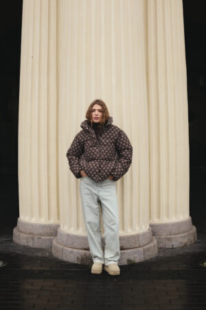 Злегка вільний крій забезпечує комфорт рухів і дозволяє легко комбінувати пуховик із теплими светрами чи кардиганами. Подовжена спинка додає зручності й сучасності, надійно захищаючи від вітру та холоду. Шоколадний колір у поєднанні з трендовим принтом створює виразний і неповторний стиль, який підкреслює індивідуальність власниці. Такий фасон робить силует більш гармонійним і водночас додає образу легкості та витонченості.