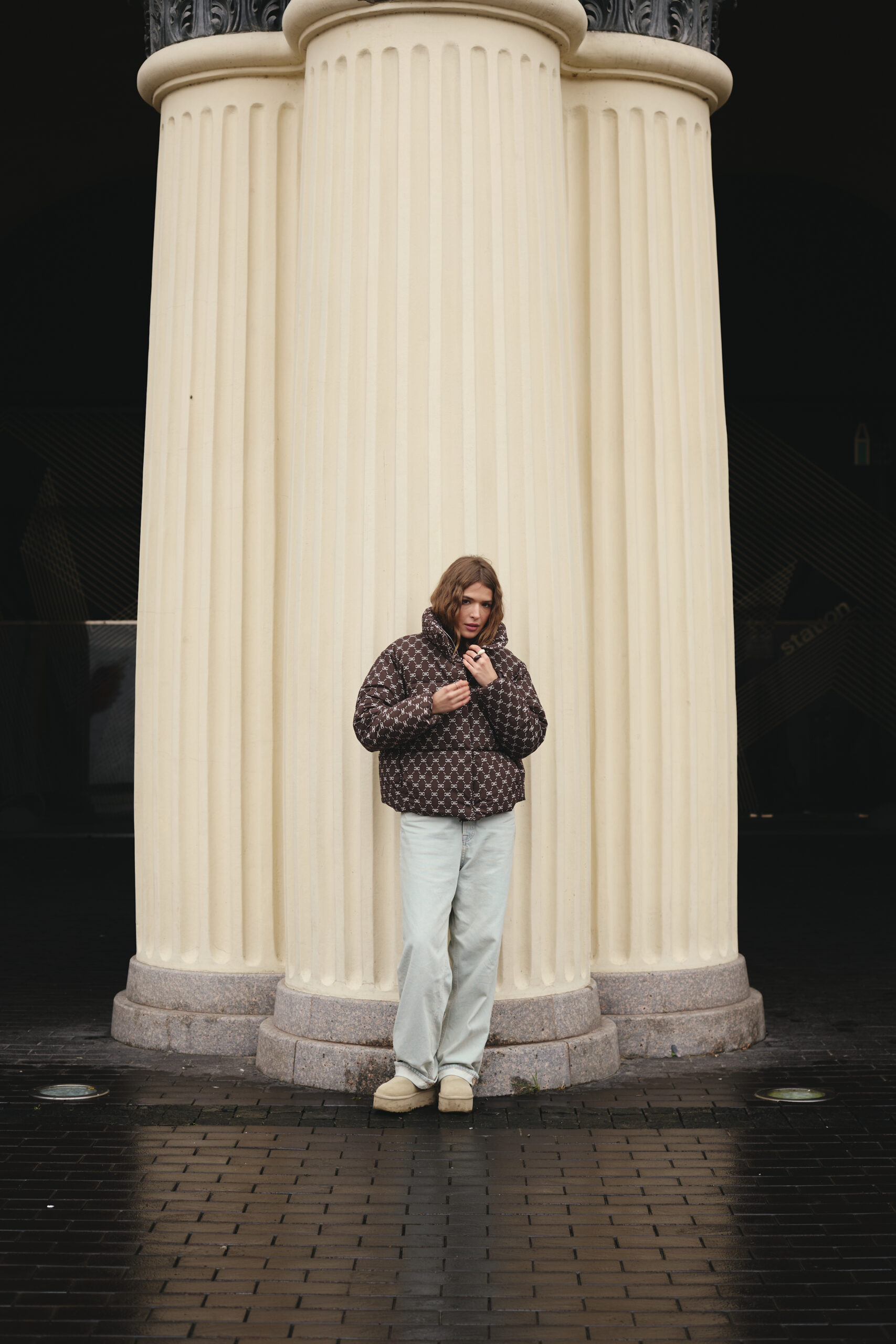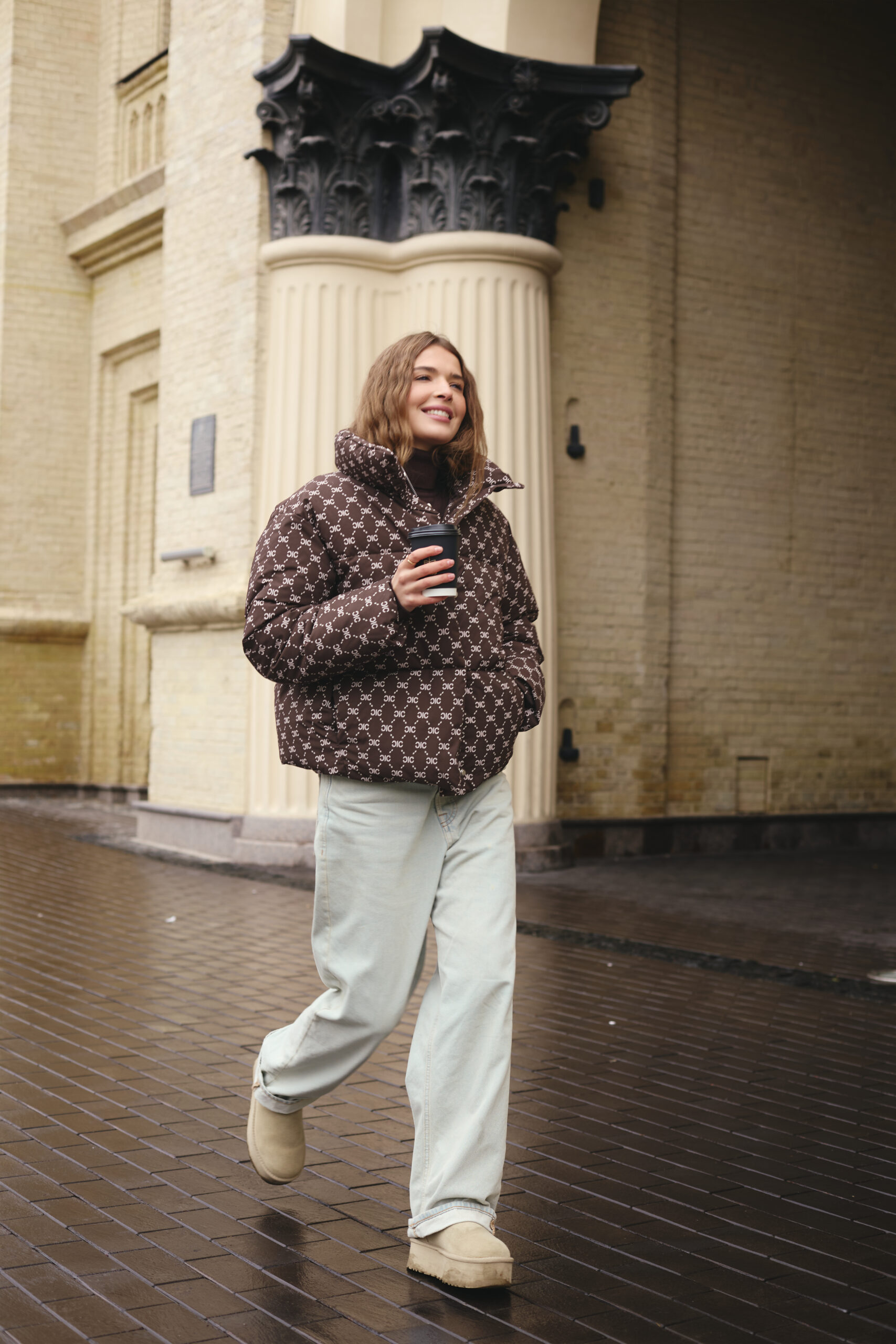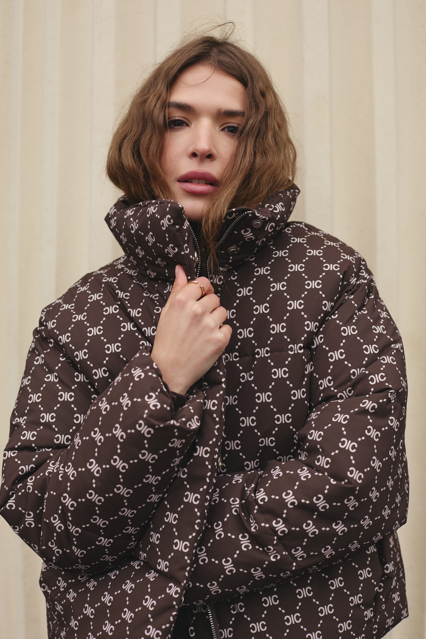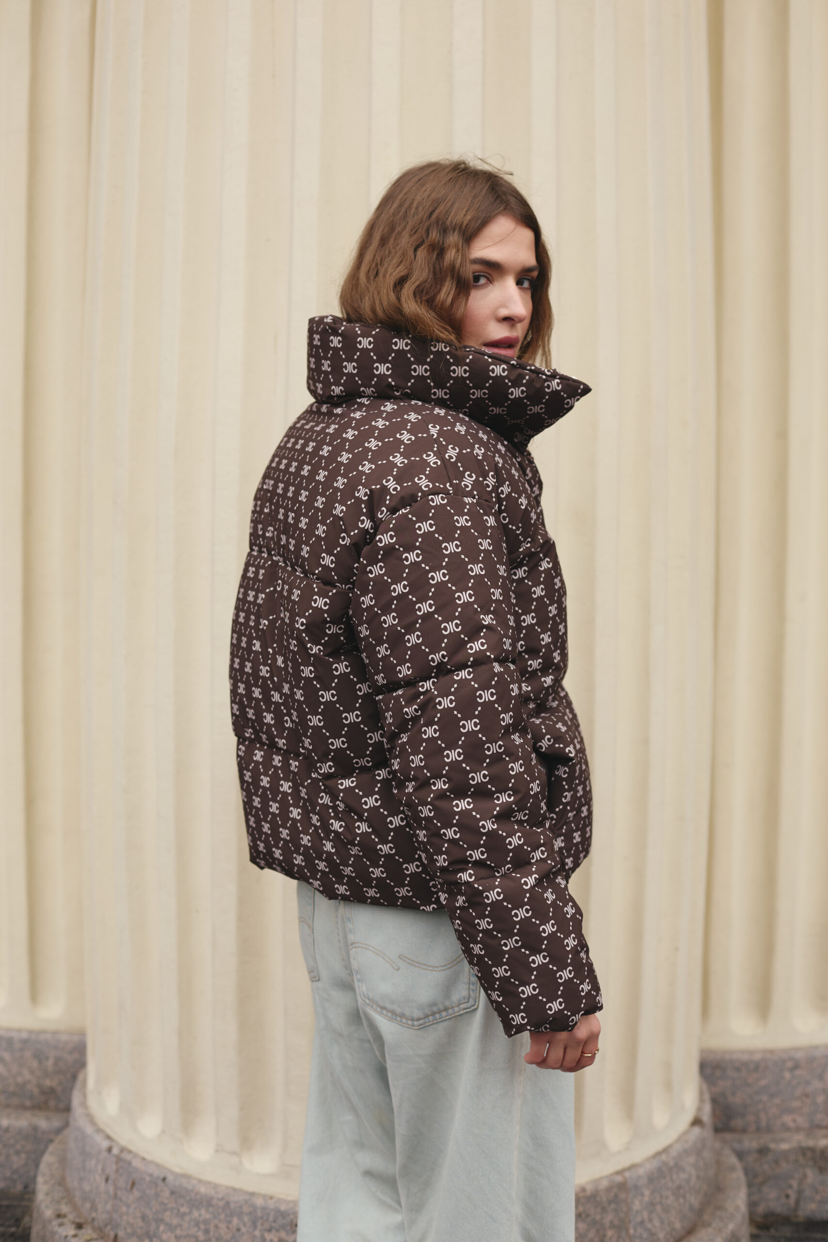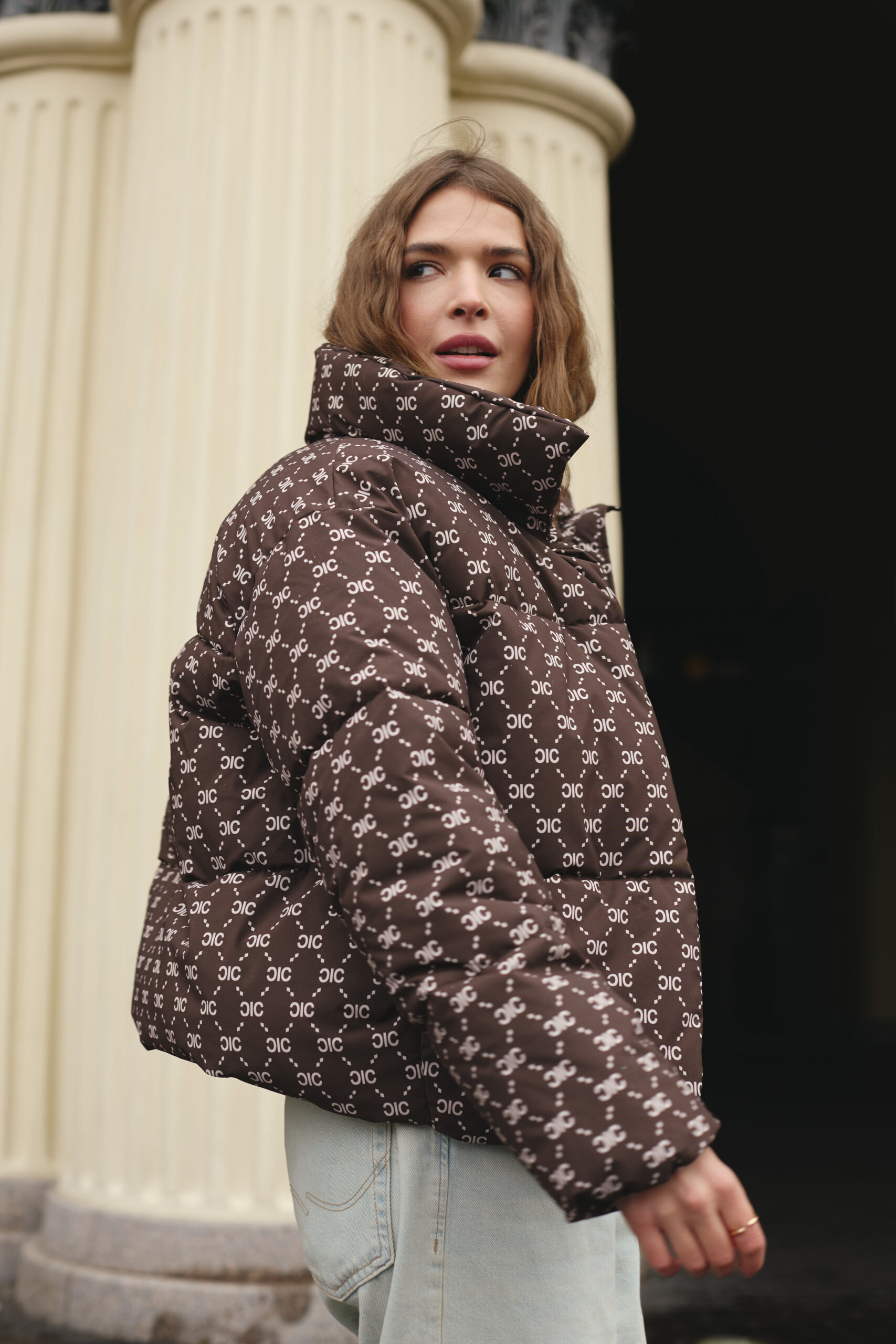 Злегка вільний крій забезпечує комфорт рухів і дозволяє легко комбінувати пуховик із теплими светрами чи кардиганами. Подовжена спинка додає зручності й сучасності, надійно захищаючи від вітру та холоду. Шоколадний колір у поєднанні з трендовим принтом створює виразний і неповторний стиль, який підкреслює індивідуальність власниці. Такий фасон робить силует більш гармонійним і водночас додає образу легкості та витонченості.