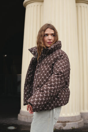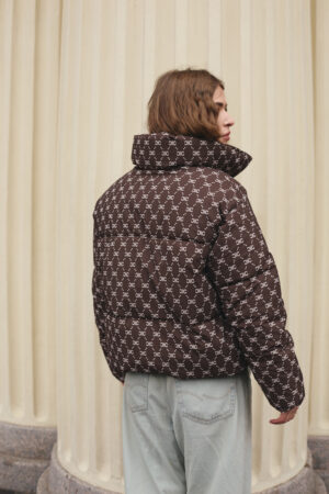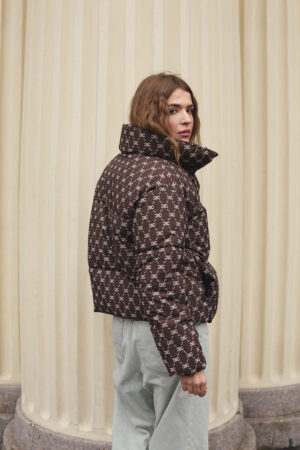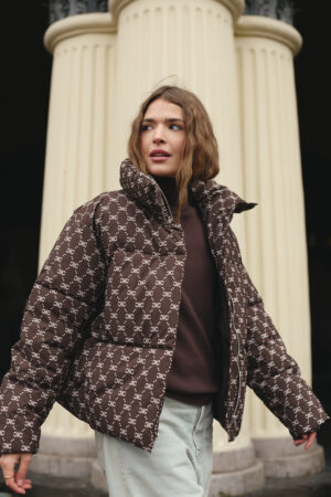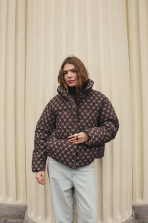 Жіночий зимовий пуховик у шоколадному кольорі з трендовим принтом — стиль, тепло та сучасний акцент