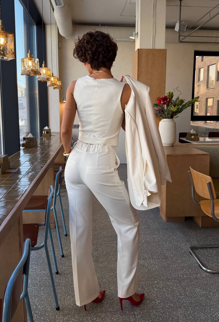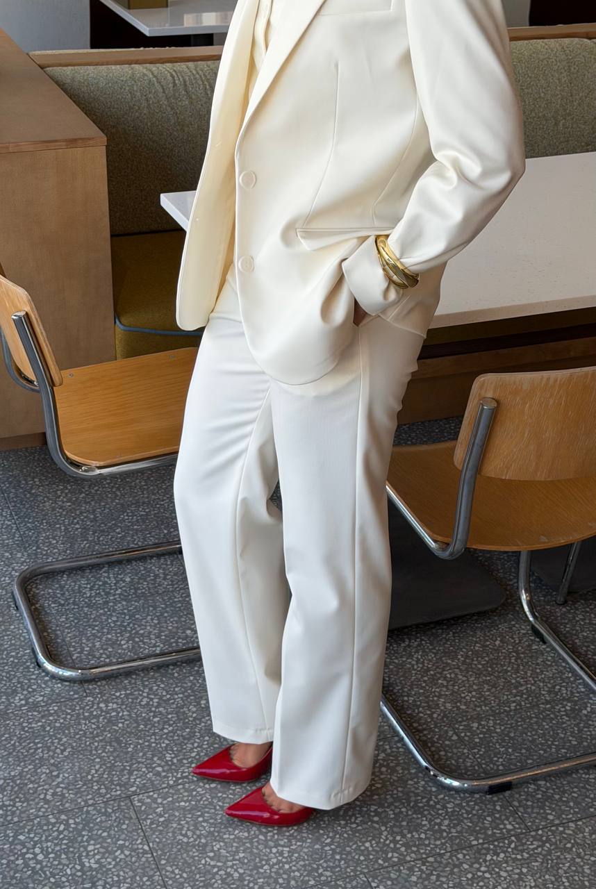 Прямий крій штанів красиво сідає по фігурі, візуально подовжує ноги та створює акуратний, збалансований силует. Світлий відтінок пломбір додає образу чистоти й витонченості, легко поєднуючись із базовими та акцентними кольорами.