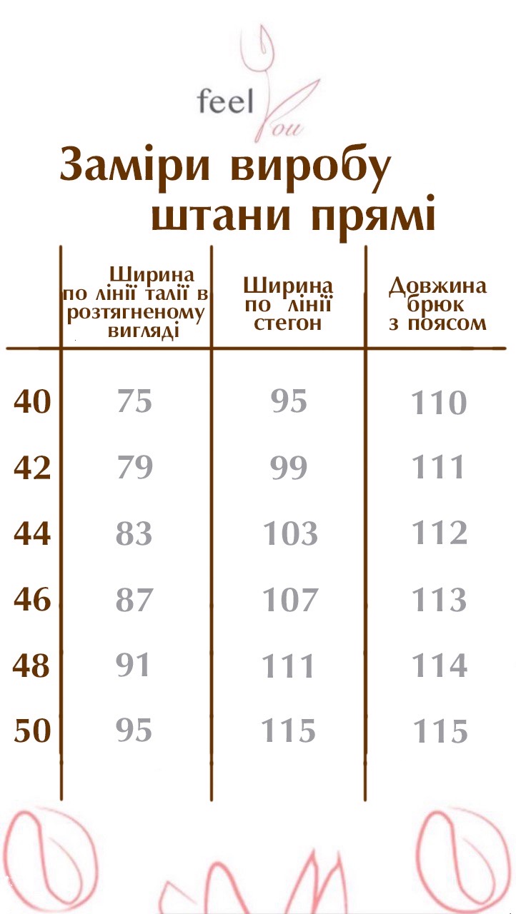 Не зволікайте та додайте до свого гардероба цей елегантний та універсальний елемент. Замовте наші класичні прямі штани на feelyou.com.ua і переконайтеся у їхній високій якості та бездоганному стилі. Насолоджуйтесь комфортом і впевненістю в кожному кроці разом з нашим одягом!