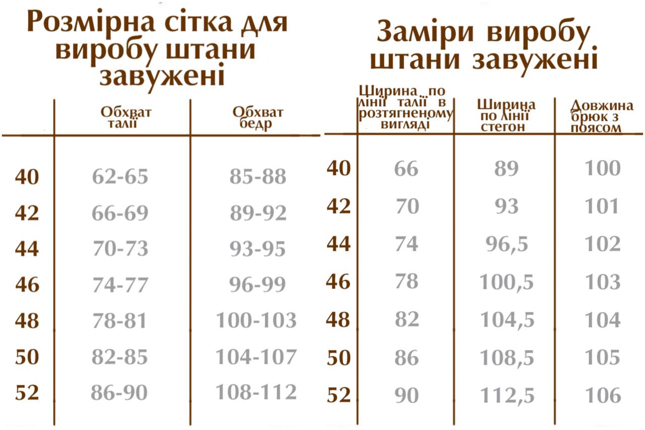 Штани представлені у розмірах: 40, 42, 44, 46, 48, 50, 52. Завдяки універсальному крою і легкій еластичності вони комфортно сідають на різні типи фігури.