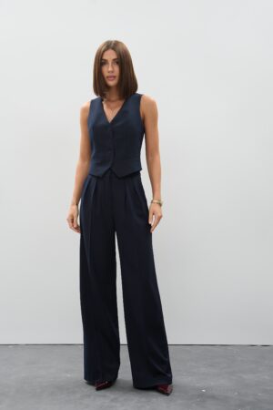 Жіночі штани палаццо насиченого синього кольору — це вдале поєднання сучасного дизайну, елегантності та зручності. Вони створені для жінок, які цінують свободу рухів та бездоганний зовнішній вигляд одночасно. Завдяки широкому крою та глибокому кольору ці жіночі брюки палаццо легко вписуються як у діловий, так і в повсякденний гардероб.