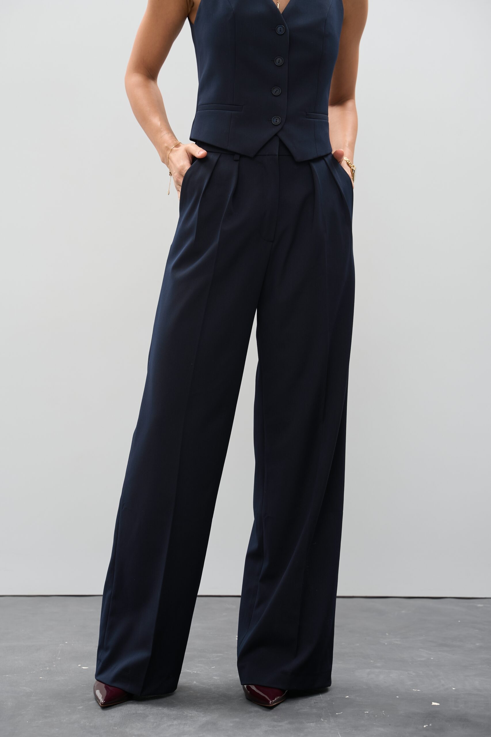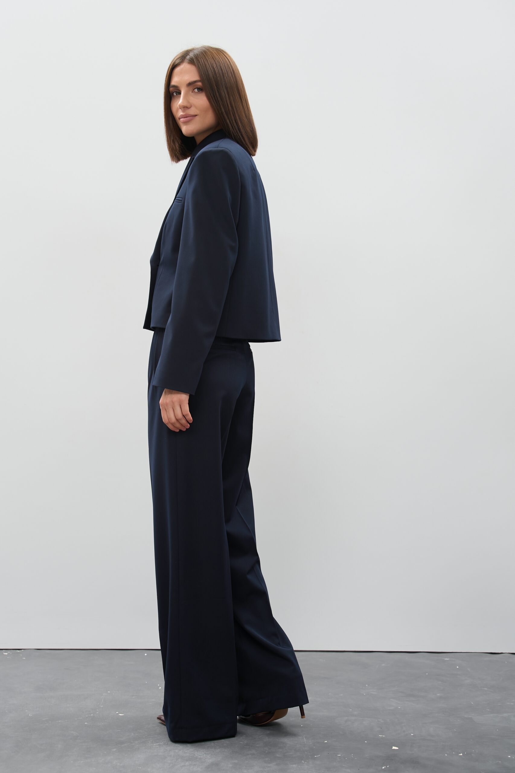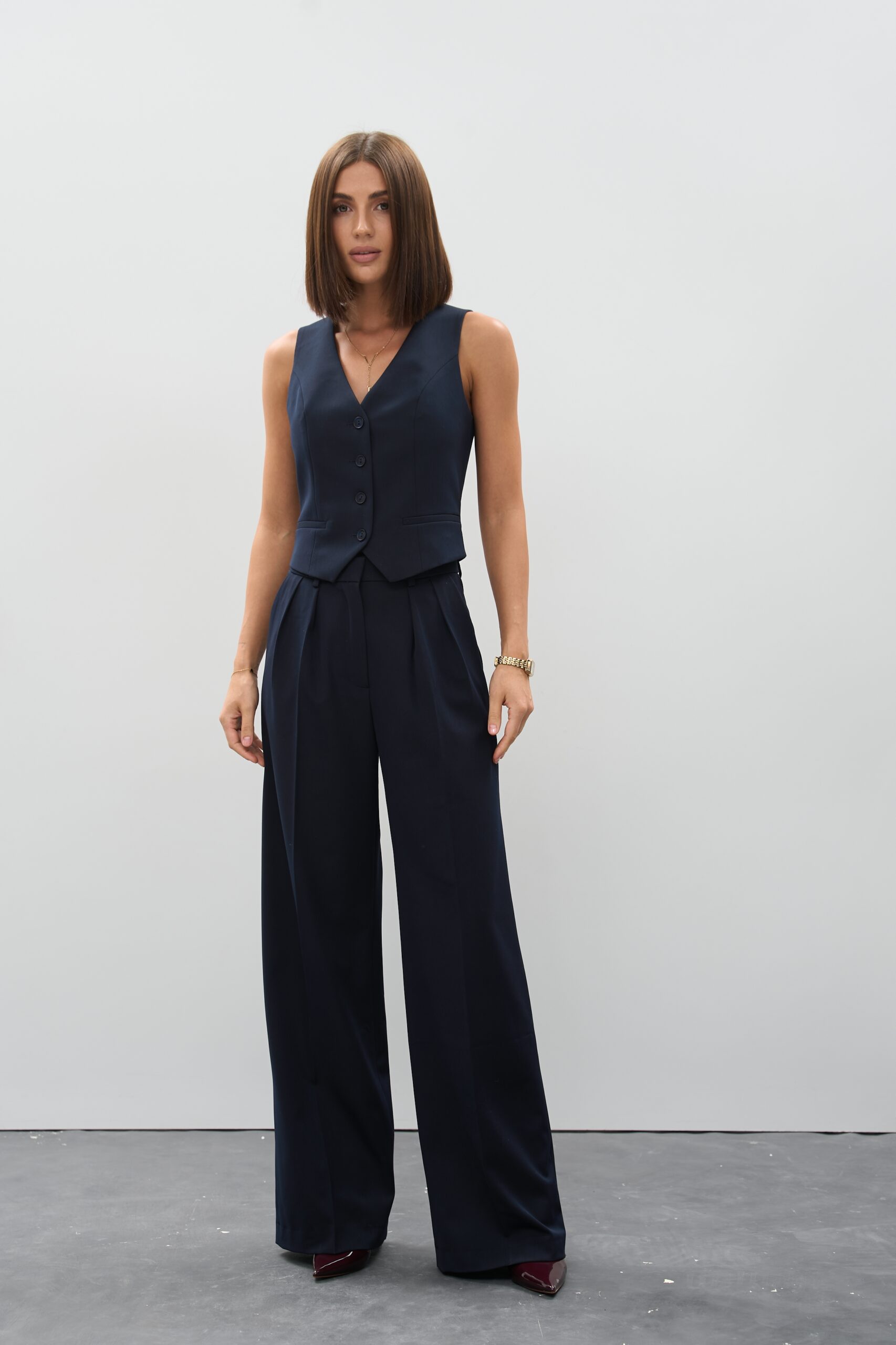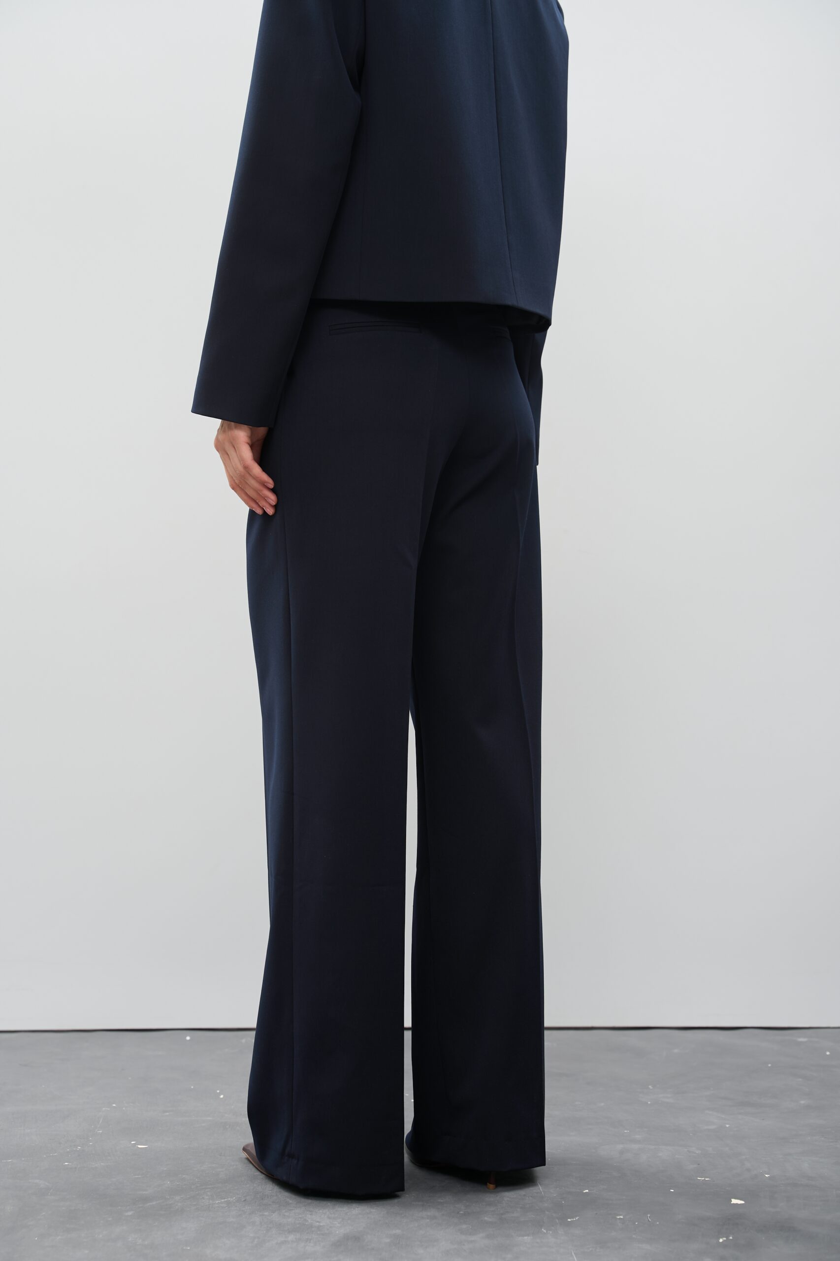 Синій — це універсальний і благородний відтінок, що гармонійно поєднується з базовими (білий, бежевий, сірий) і контрастними кольорами (червоний, жовтий, сріблястий). Це ідеальні жіночі штани для офісу чи подій, де важливий стиль і лаконічність.