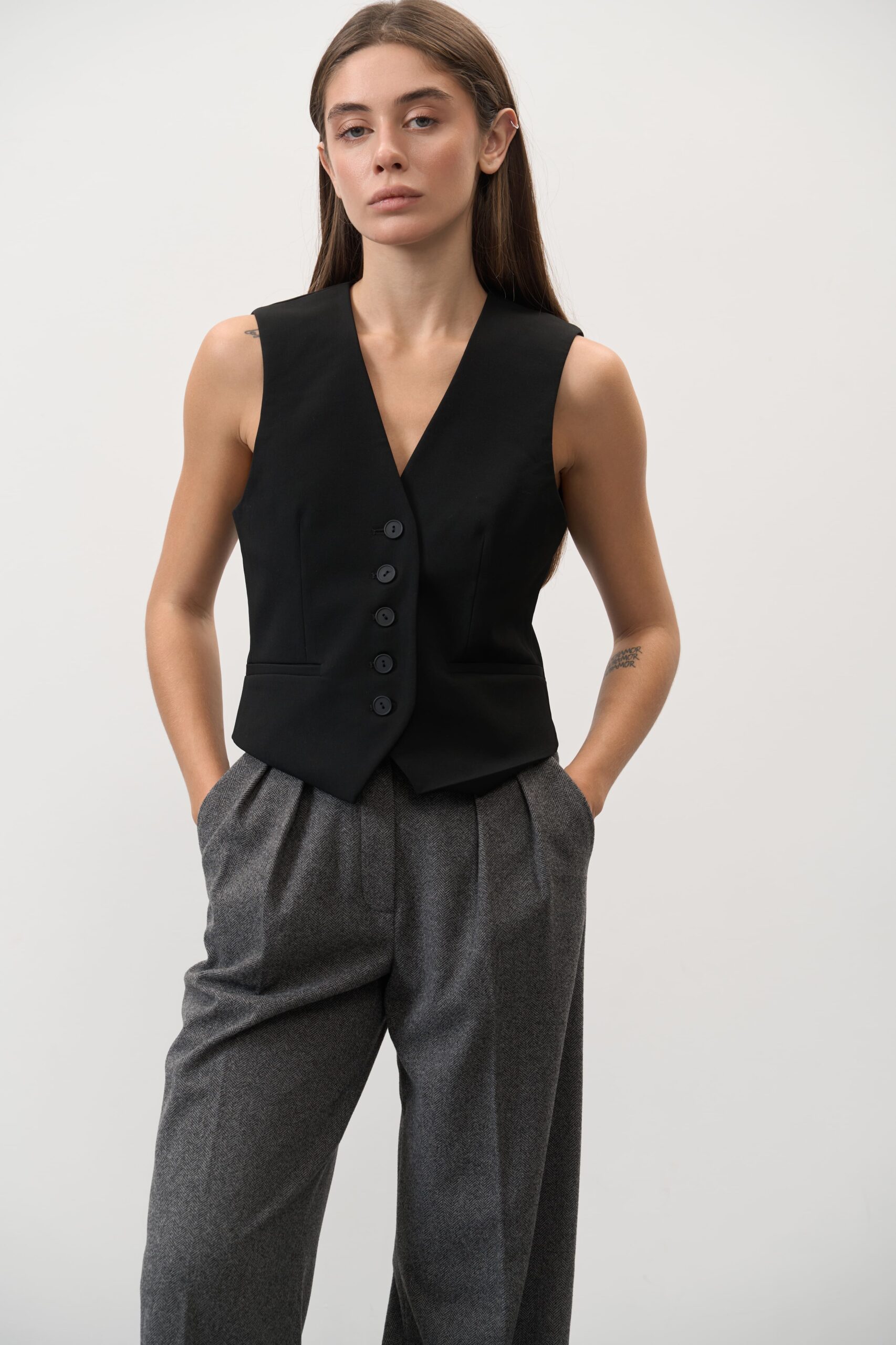 Колір графіт – це глибокий відтінок сірого, який завжди виглядає стримано та елегантно. Він легко поєднується з білим, чорним, бежевим чи молочним для класичних луків, а також із яскравими акцентами – смарагдовим, бордовим чи темно-синім – для створення стильних комбінацій.
