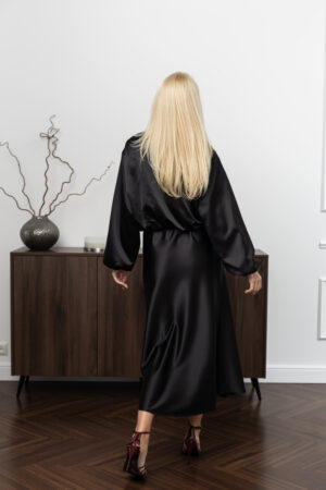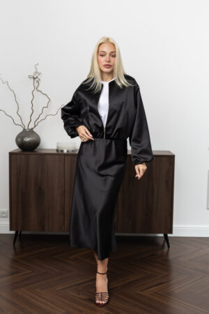 Легкий глянцевий відблиск тканини надає образу нотки розкоші без надмірності, а класичний чорний колір робить її незамінною базовою річчю для будь-якого сезону.
