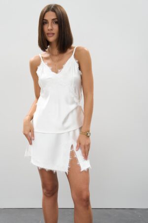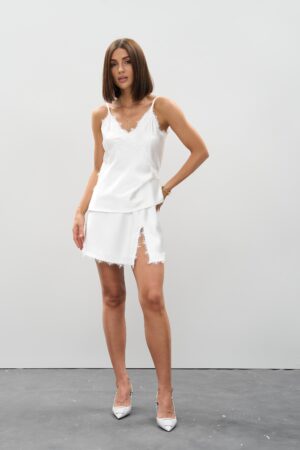 Атласна спідниця міні молочного кольору з мереживом — ніжність та елегантність у кожній деталі
