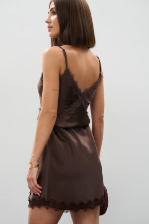 Атласна спідниця міні шоколадного кольору з мереживом — стиль, що підкреслює впевненість