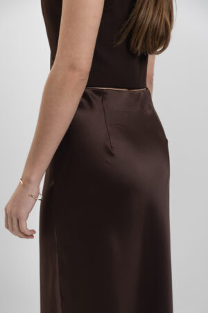 Плавні лінії крою підкреслюють фігуру, а м’який відблиск атласу додає образу вишуканості. Глибокий шоколадний колір виглядає розкішно як вдень, так і у вечірньому світлі.