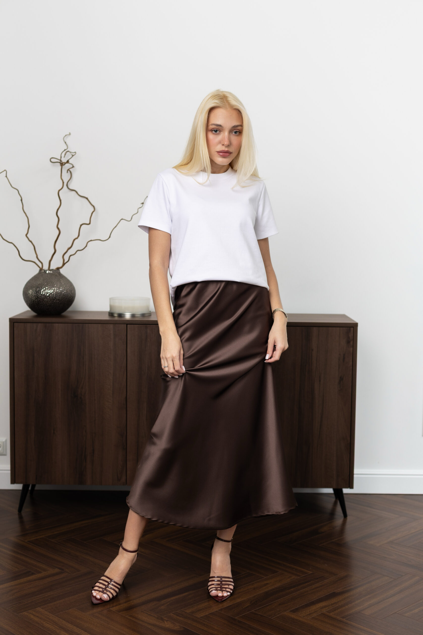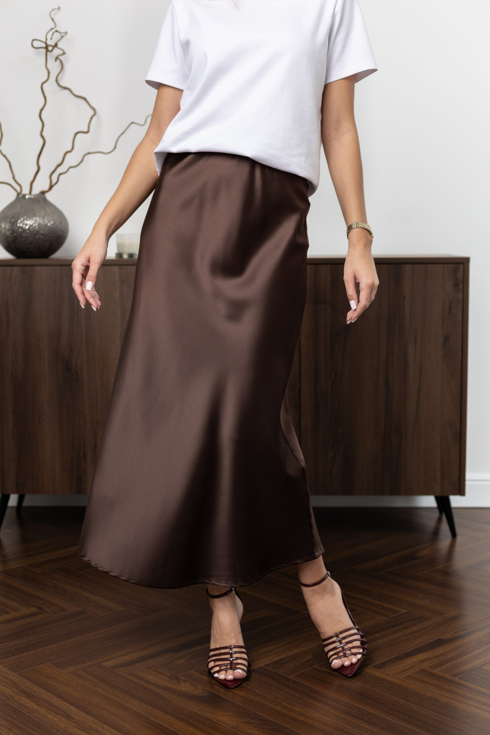Атласна спідниця шоколадного кольору — стиль, що підкреслює характер