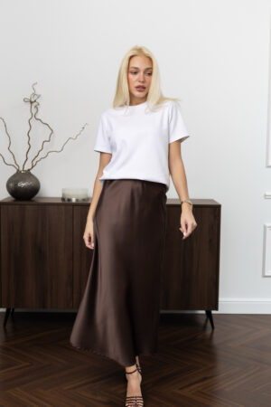Атласна спідниця в шоколадному кольорі — справжня паличка-виручалочка для створення стильного образу. Вона однаково вдало виглядає як із сорочками й блузами для офісного чи ділового стилю, так і з футболками чи джемперами для прогулянок містом.