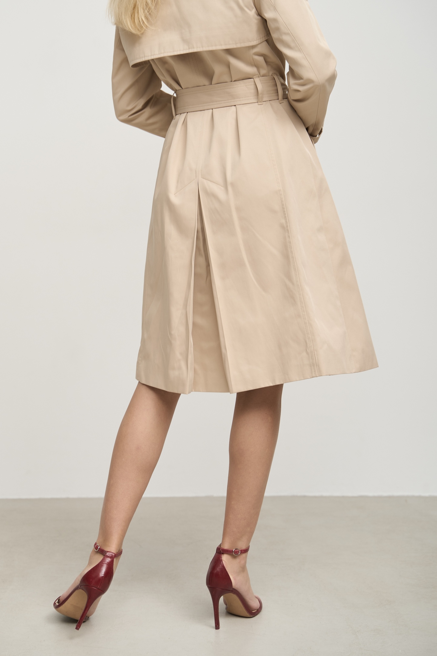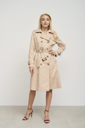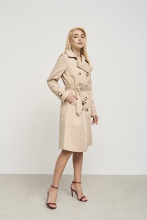 Деталі та оздоблення: додатковий ряд гудзиків вверху, щоб застібнути тренч під шию, пасок додається, кокетка з однієї сторони, прихований ґудзик на талії, для кращої посадки, бантова складка позаду