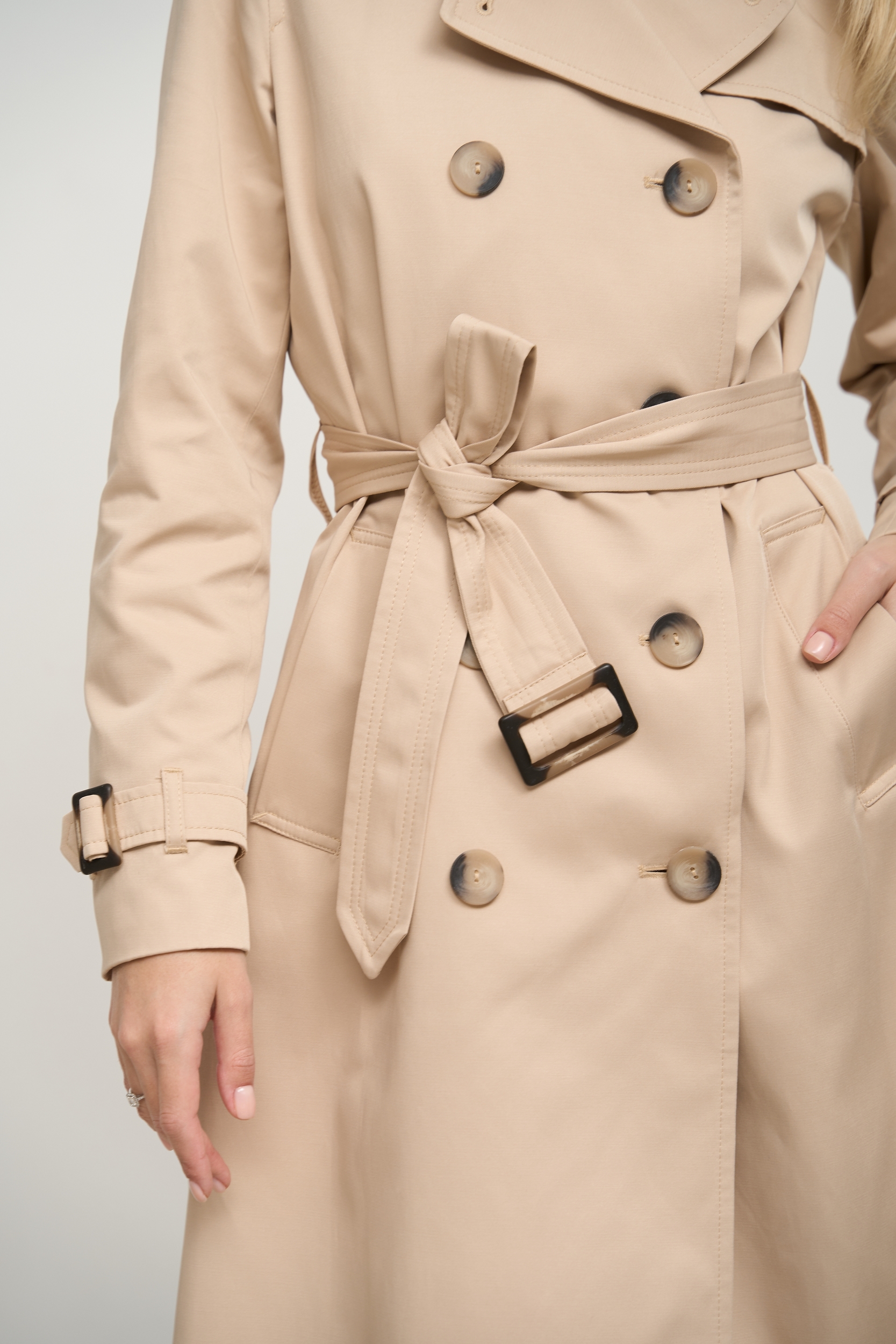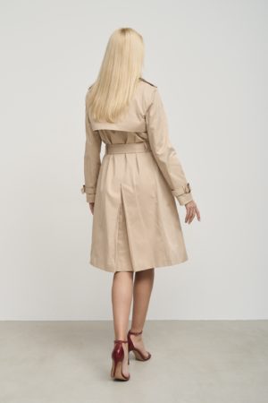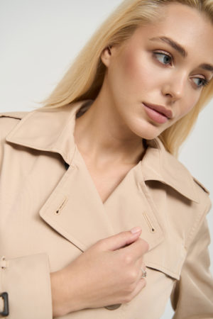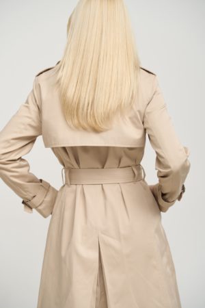 Деталі та оздоблення роблять цей тренч особливим. Додатковий ряд гудзиків вгорі дозволяє застібнути тренч під шию, забезпечуючи захист від вітру та холоду. Пасок додається, щоб підкреслити талію та додати силуету ще більше витонченості. Кокетка з однієї сторони та прихований ґудзик на талії забезпечують кращу посадку. Бантова складка позаду додає тренчу елегантності та стильності.