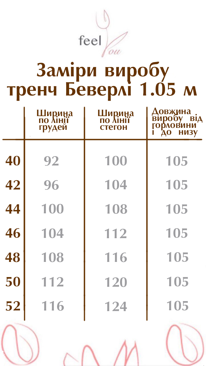 Розміри варіюються від 40 до 52, дозволяючи кожній жінці знайти свій ідеальний варіант. Довжина тренча доступна у двох варіантах – 105 та 115 см, що дозволяє вибрати модель, яка найкраще підходить до вашого стилю та потреб.