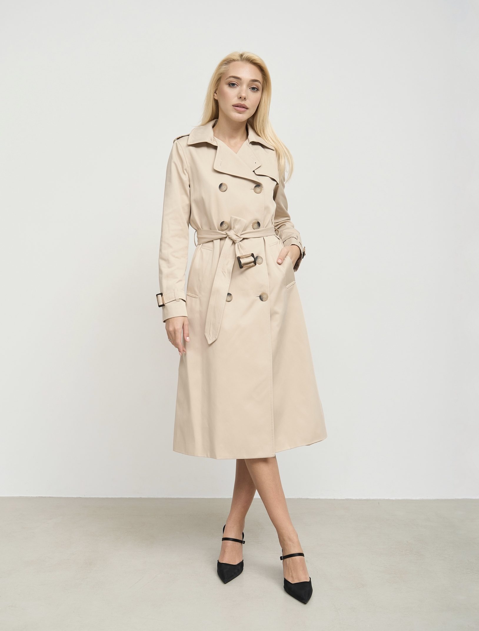 Деталі та оздоблення роблять цей тренч особливим. Додатковий ряд гудзиків вгорі дозволяє застібнути тренч під шию, забезпечуючи захист від вітру та холоду. Пасок додається, щоб підкреслити талію та додати силуету ще більше витонченості. Кокетка з однієї сторони та прихований ґудзик на талії забезпечують кращу посадку. Бантова складка позаду додає тренчу елегантності та стильності.