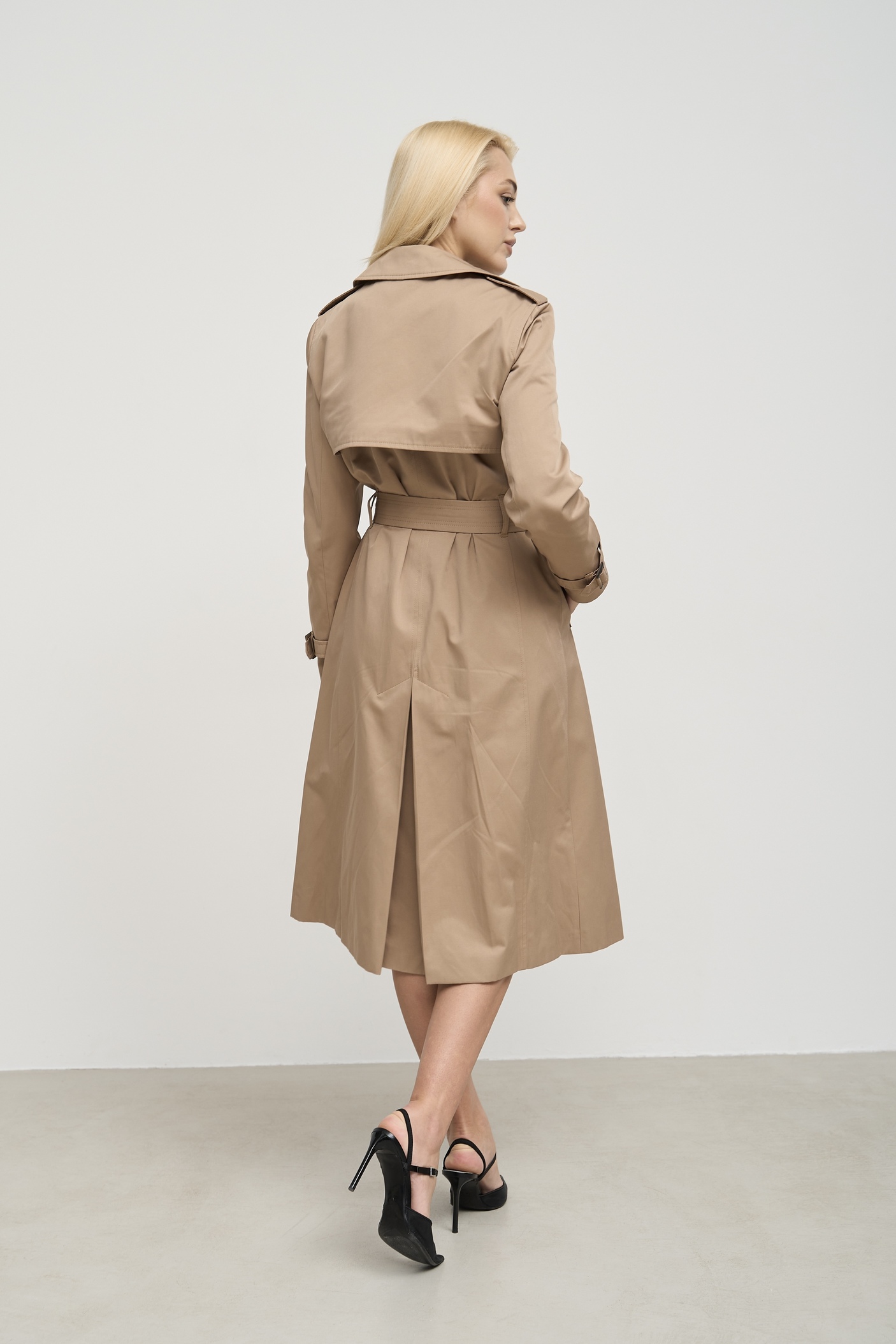 Деталі та оздоблення: додатковий ряд гудзиків вверху, щоб застібнути тренч під шию, пасок додається, кокетка з однієї сторони, прихований ґудзик на талії, для кращої посадки, бантова складка позаду