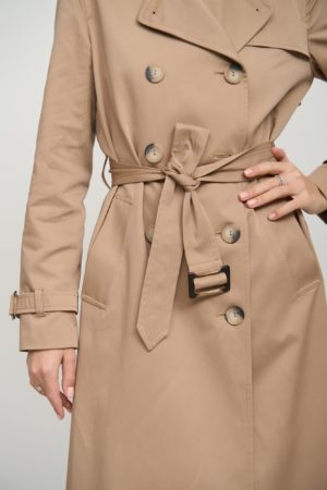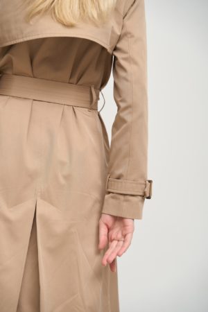 Деталі та оздоблення роблять цей тренч особливим. Додатковий ряд гудзиків вгорі дозволяє застібнути тренч під шию, забезпечуючи захист від вітру та холоду. Пасок додається, щоб підкреслити талію та додати силуету ще більше витонченості. Кокетка з однієї сторони та прихований ґудзик на талії забезпечують кращу посадку. Бантова складка позаду додає тренчу елегантності та стильності.