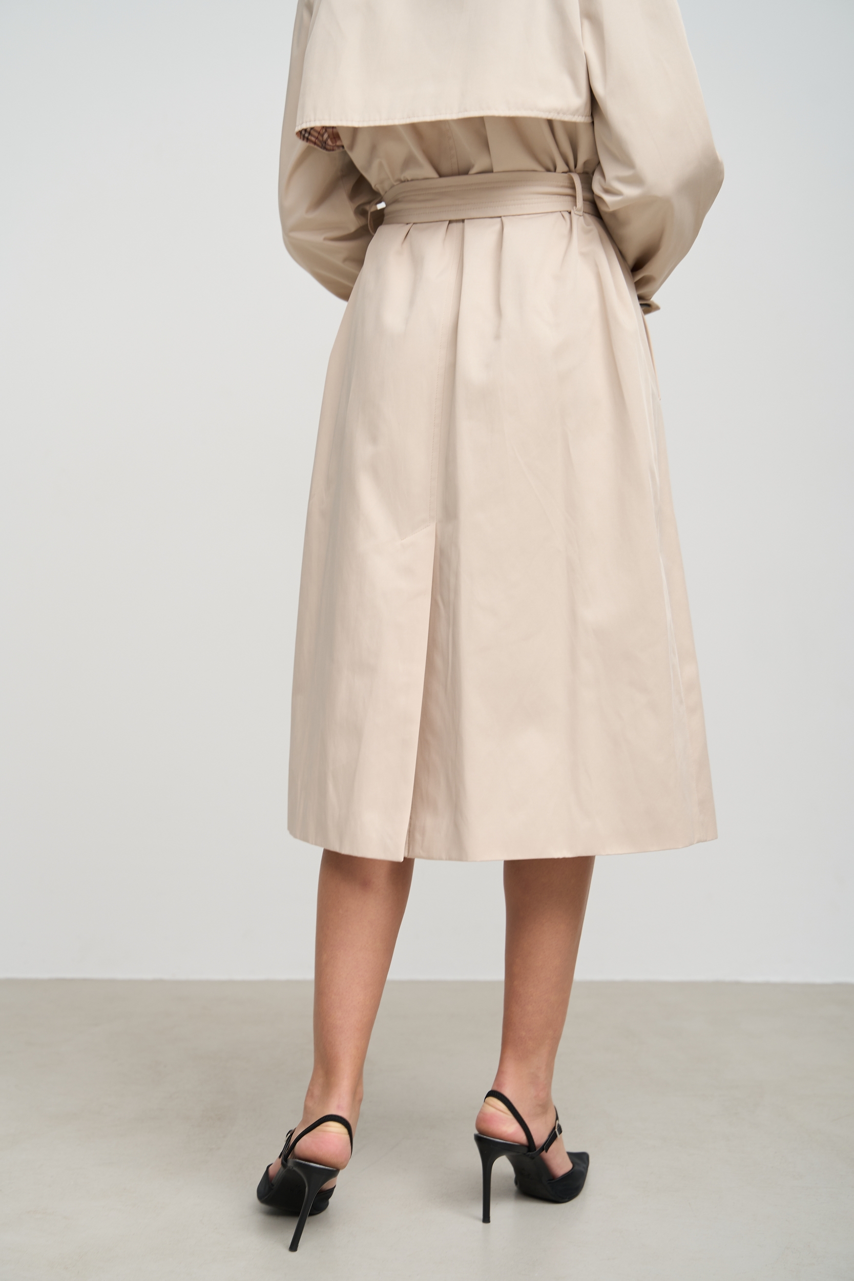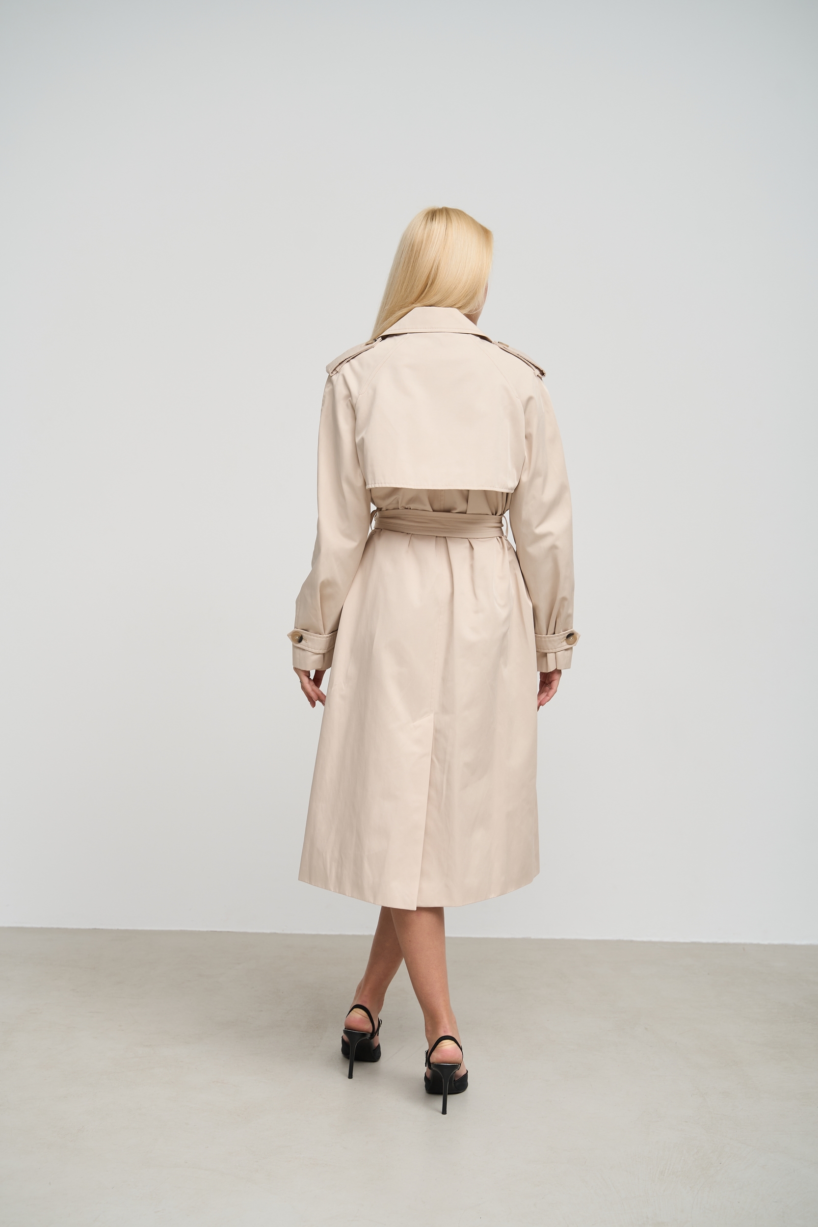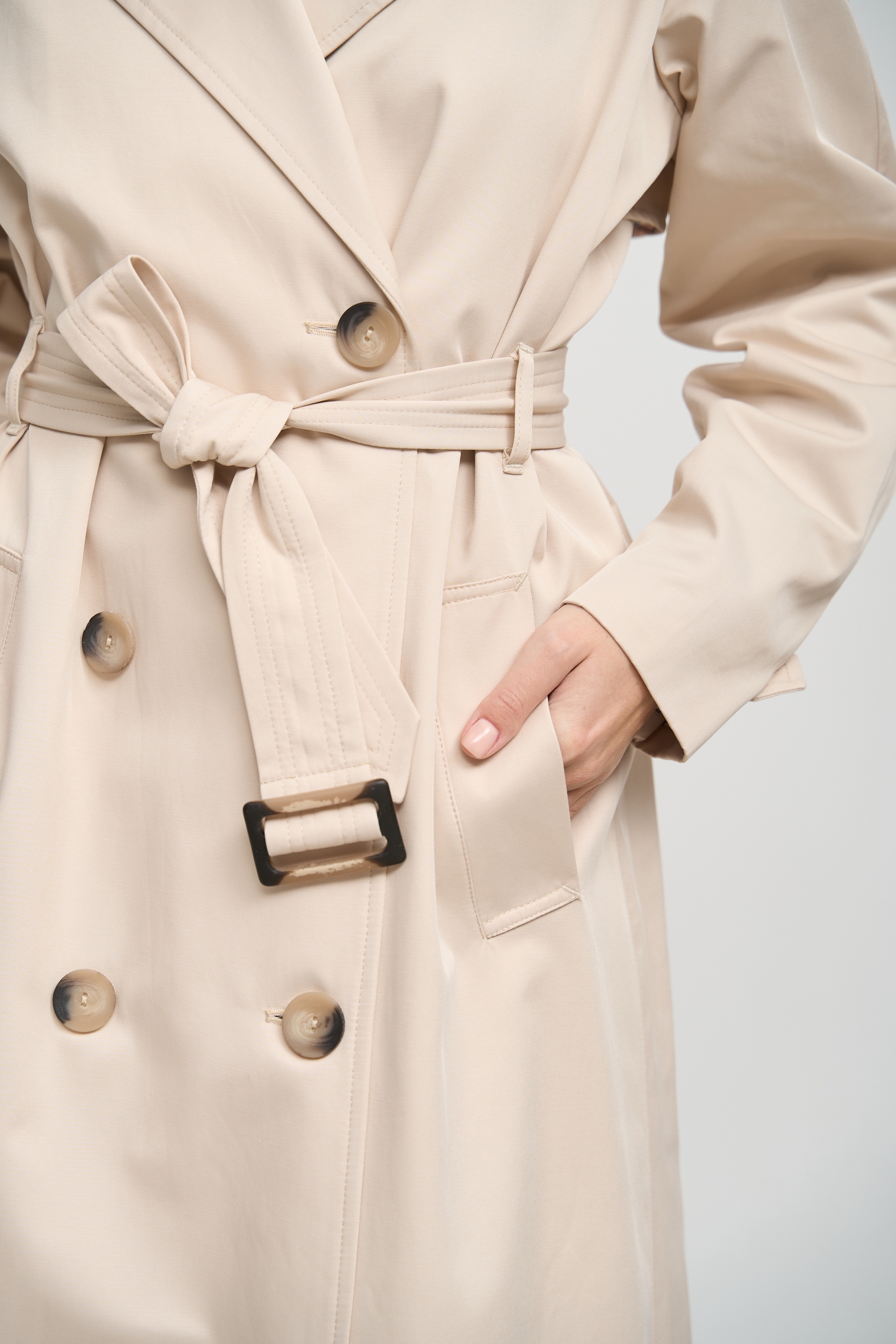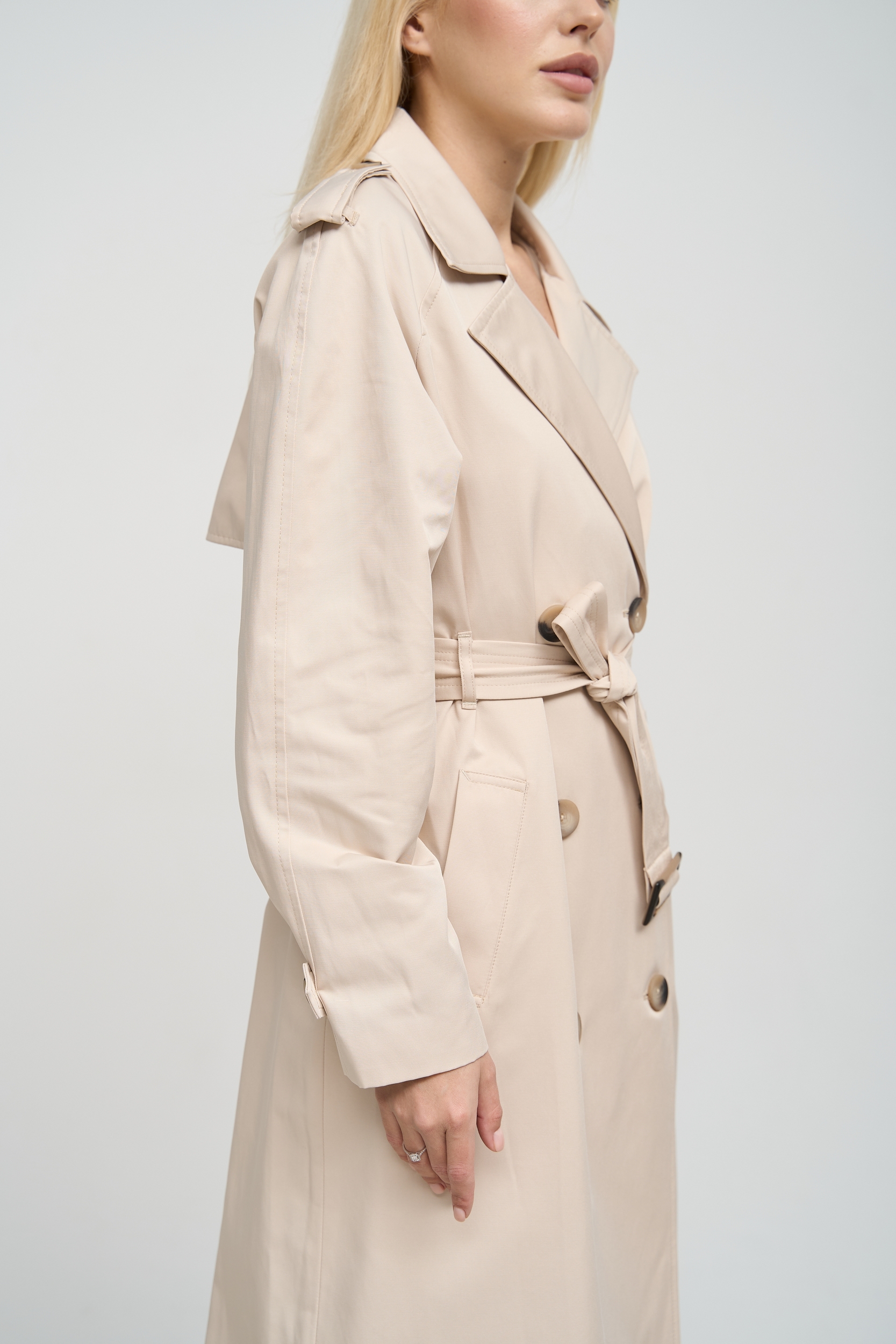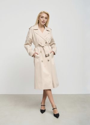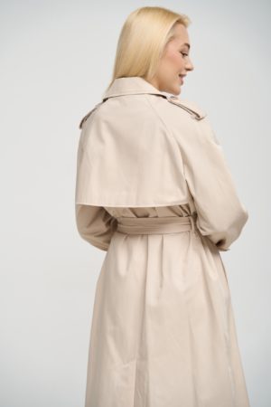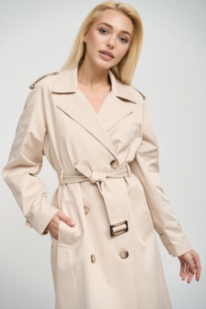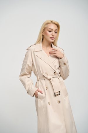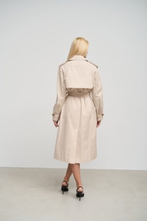 Деталі та оздоблення тренча включають кокетку з однієї сторони, рукав реглан, прихований ґудзик на талії для кращої посадки, дві вмісткі кишені для зберігання необхідних речей, та прорізну шлицю ззаду, яка забезпечує додатковий комфорт при русі. Пасок додається, щоб підкреслити талію та додати силуету більше виразності. Підкладка з нейлону забезпечує додатковий комфорт та захист від вітру, роблячи тренч зручним для носіння протягом всього дня.