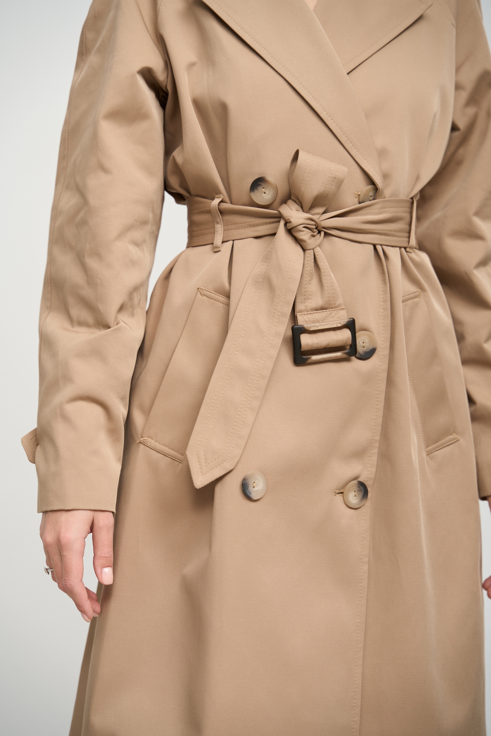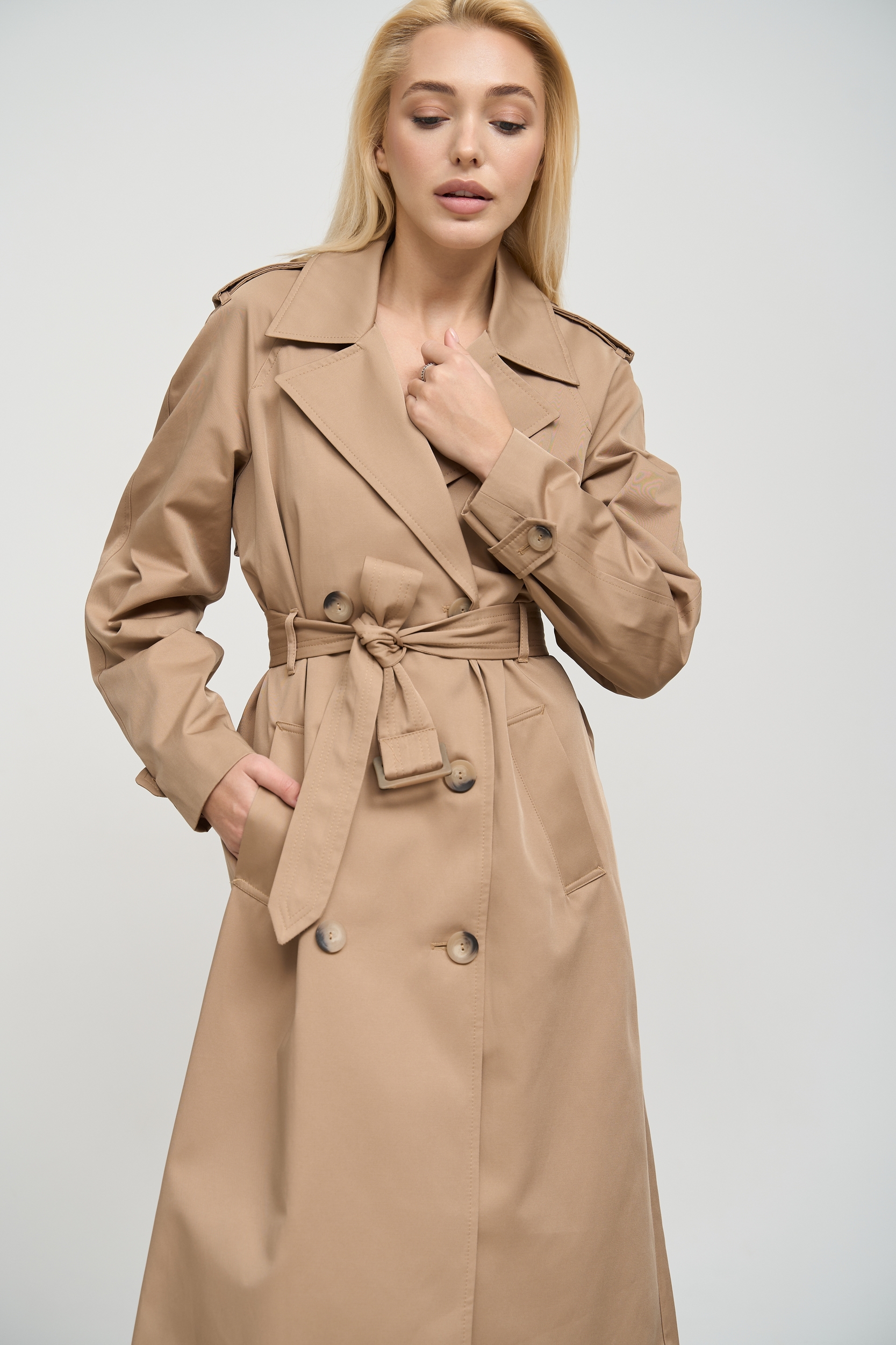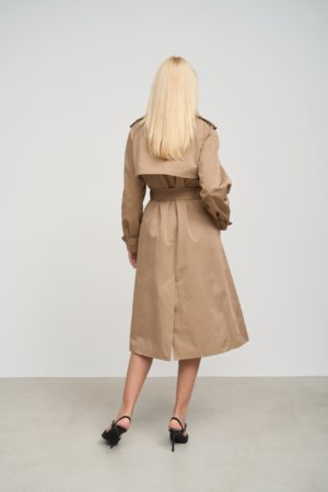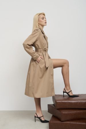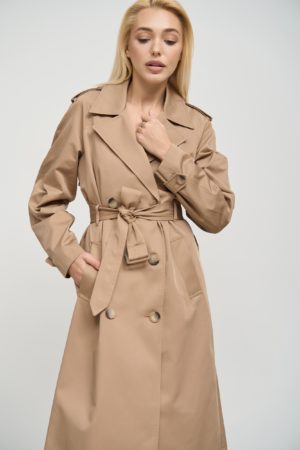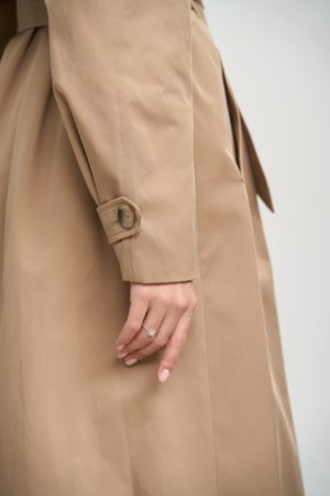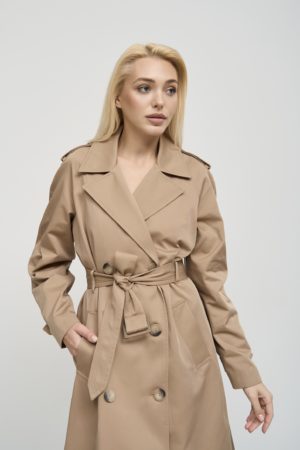 Деталі та оздоблення тренча включають кокетку з однієї сторони, рукав реглан, прихований ґудзик на талії для кращої посадки, дві вмісткі кишені для зберігання необхідних речей, та прорізну шлицю ззаду, яка забезпечує додатковий комфорт при русі. Пасок додається, щоб підкреслити талію та додати силуету більше виразності. Підкладка з нейлону забезпечує додатковий комфорт та захист від вітру, роблячи тренч зручним для носіння протягом всього дня.