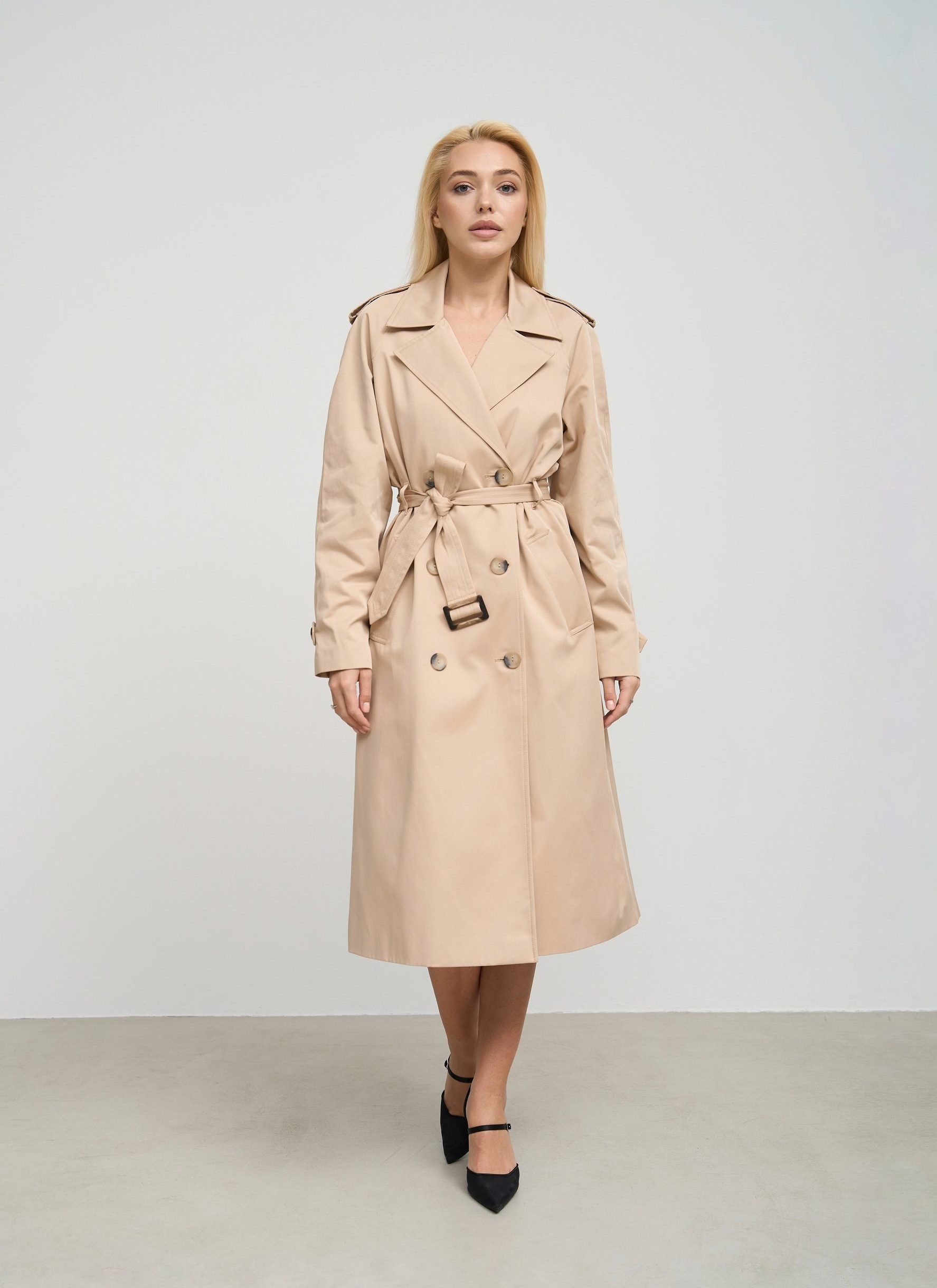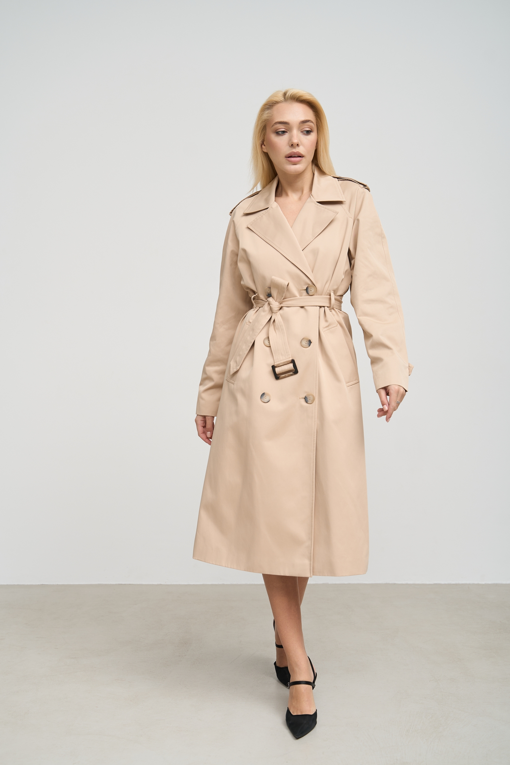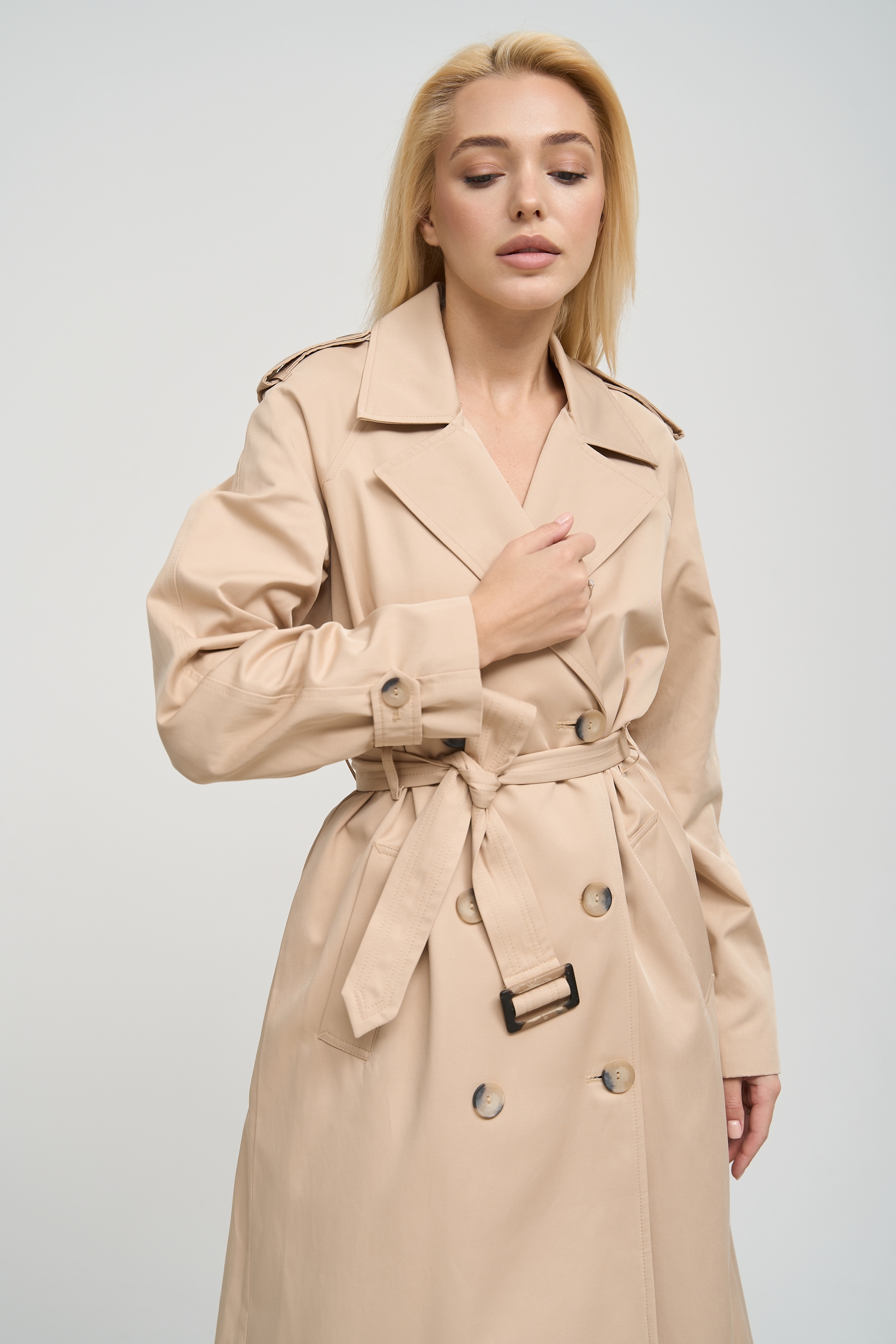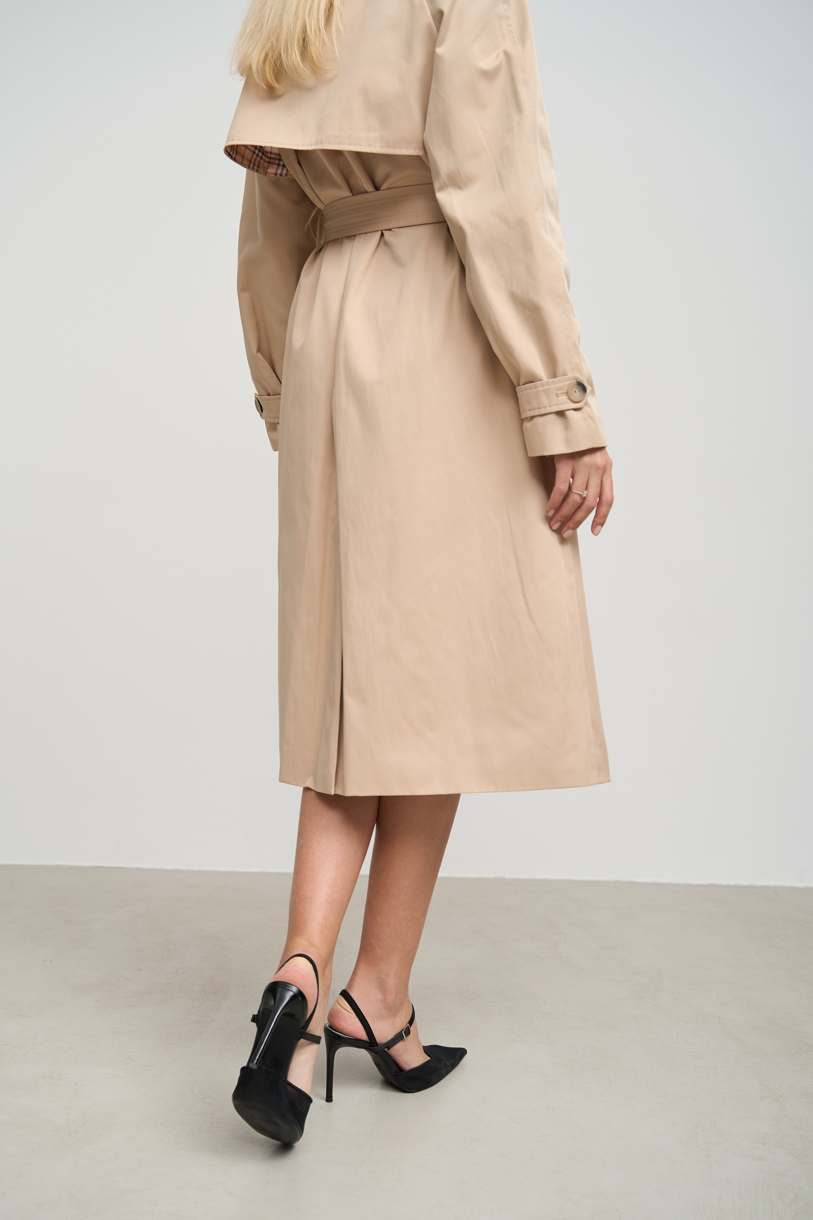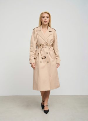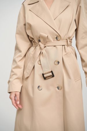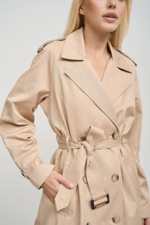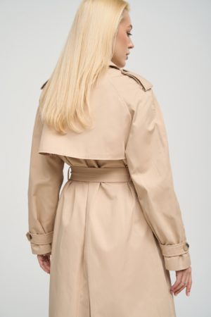 Деталі та оздоблення тренча включають кокетку з однієї сторони, рукав реглан, прихований ґудзик на талії для кращої посадки, дві вмісткі кишені для зберігання необхідних речей, та прорізну шлицю ззаду, яка забезпечує додатковий комфорт при русі. Пасок додається, щоб підкреслити талію та додати силуету більше виразності. Підкладка з нейлону забезпечує додатковий комфорт та захист від вітру, роблячи тренч зручним для носіння протягом всього дня.