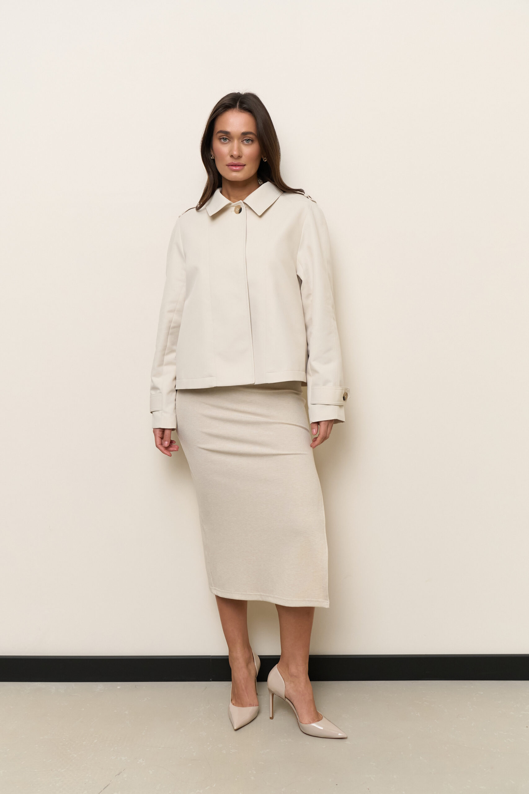 Вкорочений базовий тренч кольору лате — тепла елегантність і сучасна універсальність
