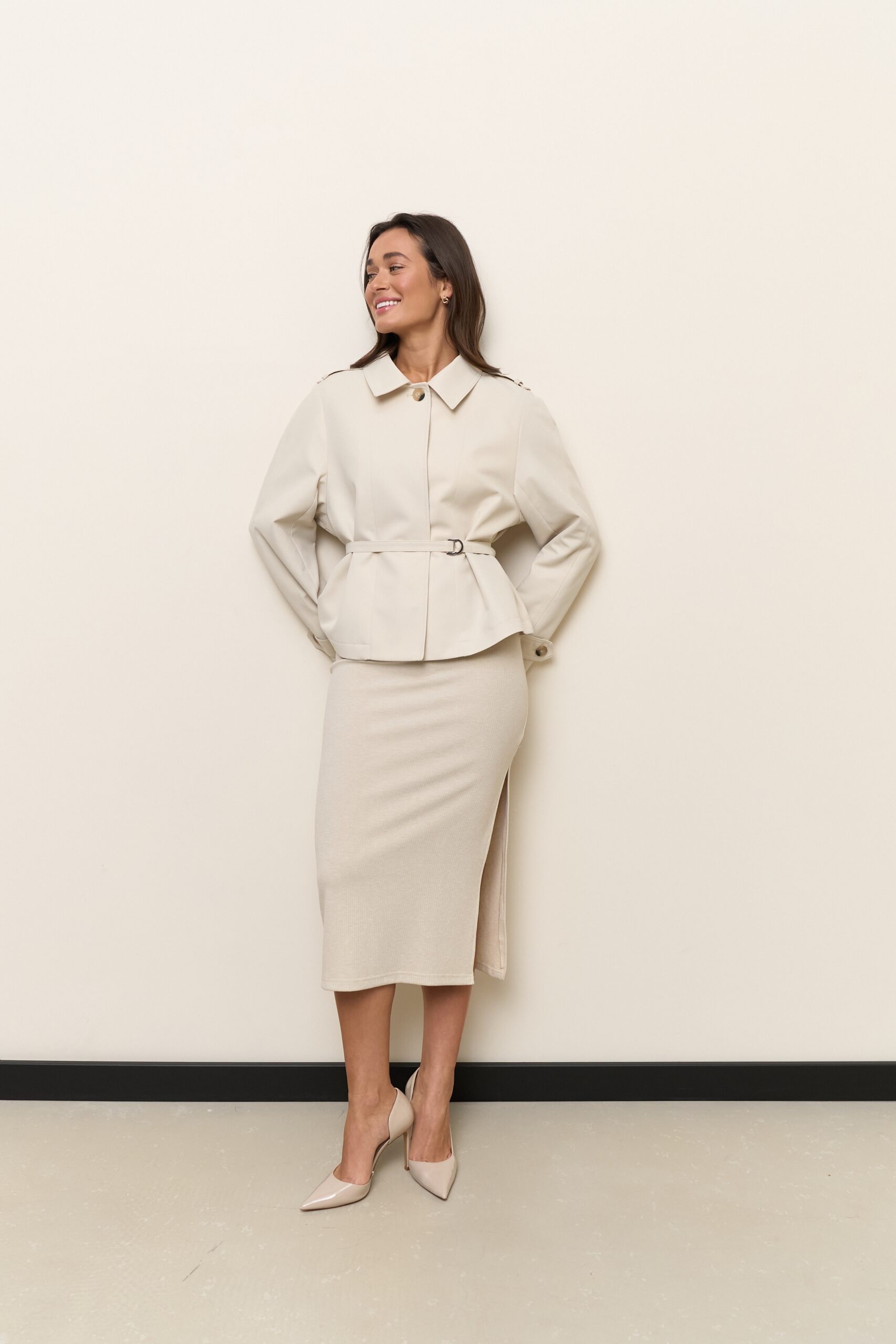 Жіночий тренч кольору лате додає образу м’якості, балансу та сучасної елегантності.